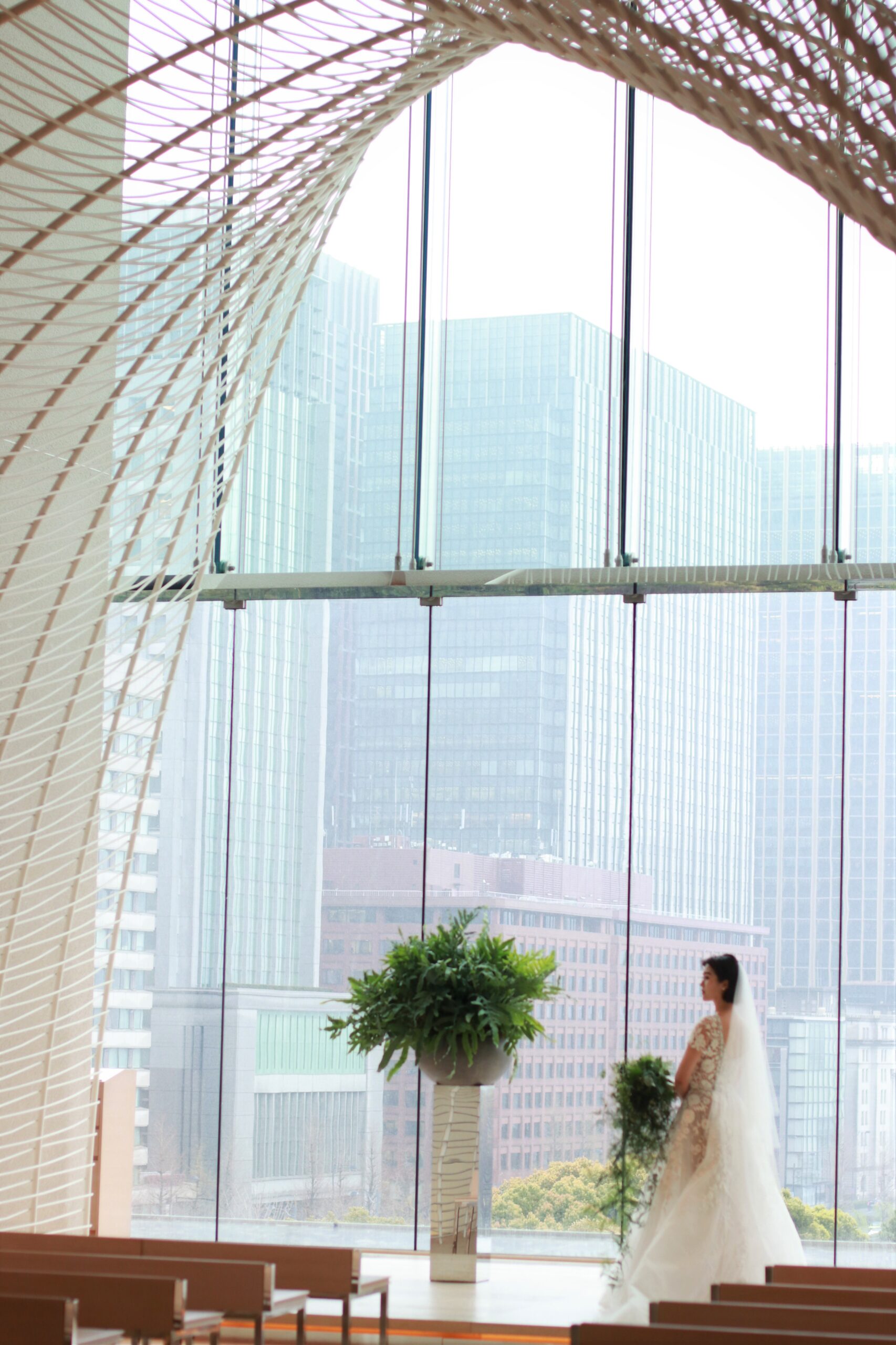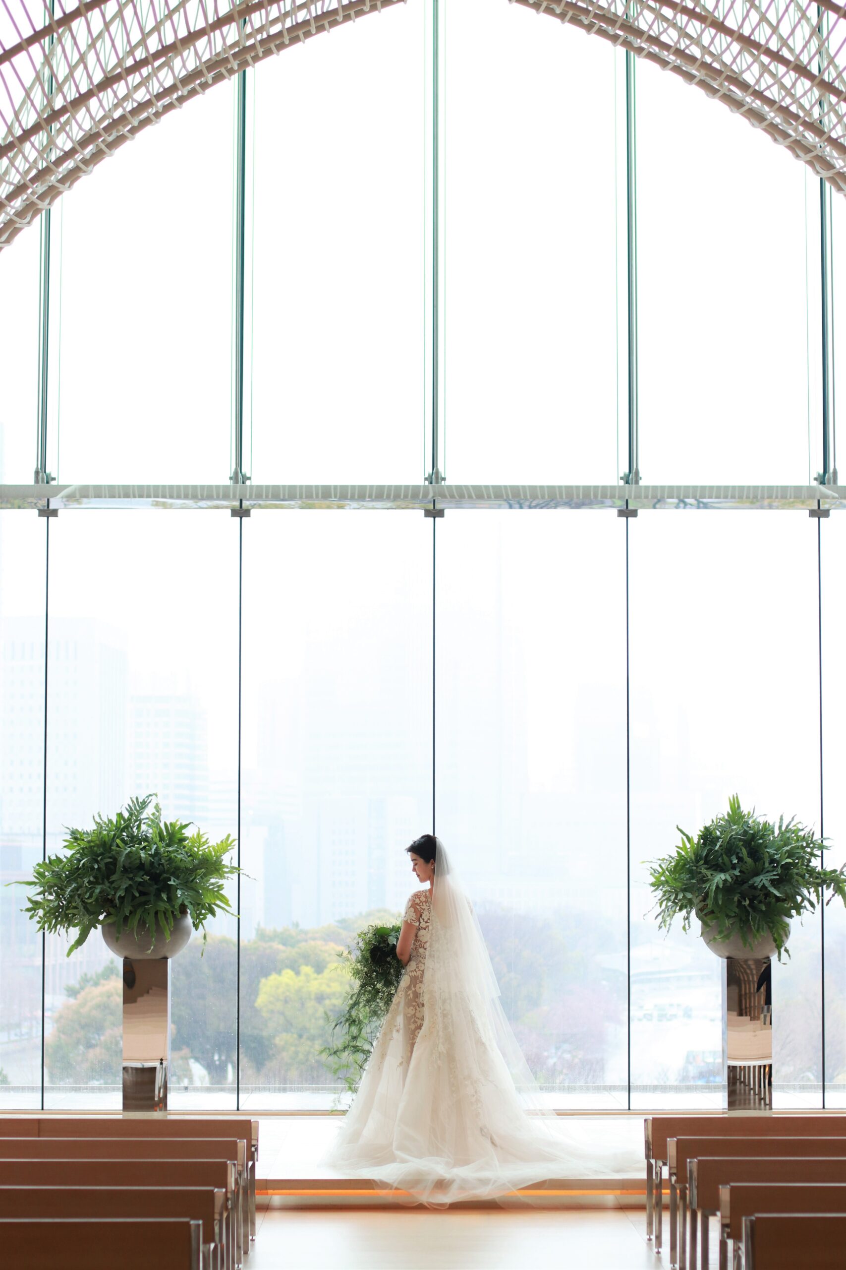 東京・丸の内の一等地に構えるパレスホテル東京のウェディングチャペルは大きな窓から差し込む柔らかな自然光が魅力です。祭壇に立つお二人を包み込むように計算されたアーチのデザインは結婚式の一体感を演出します。