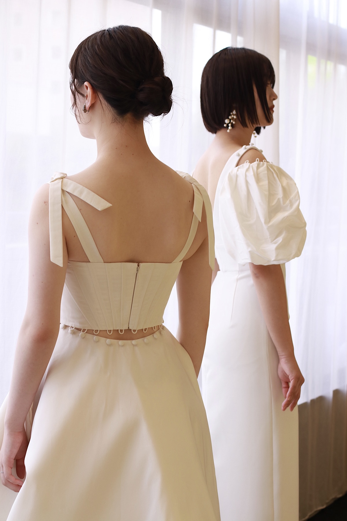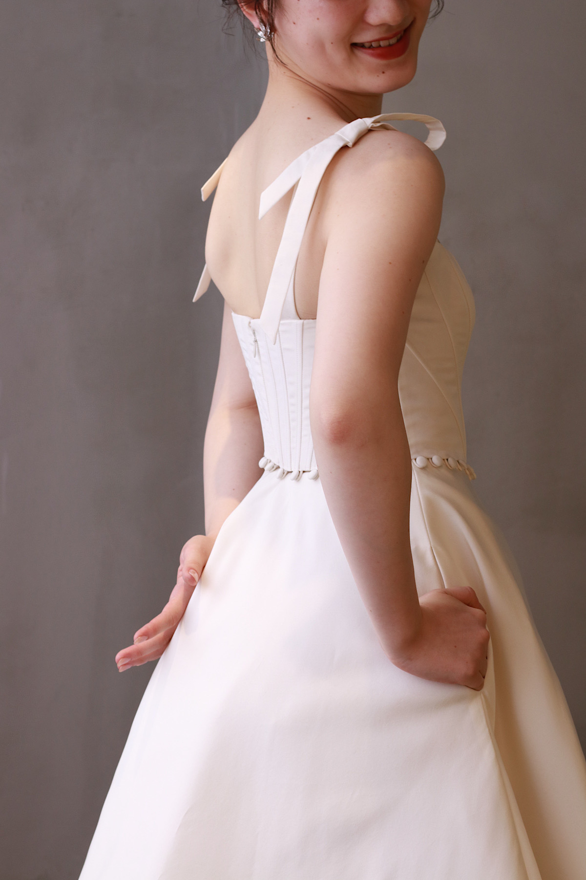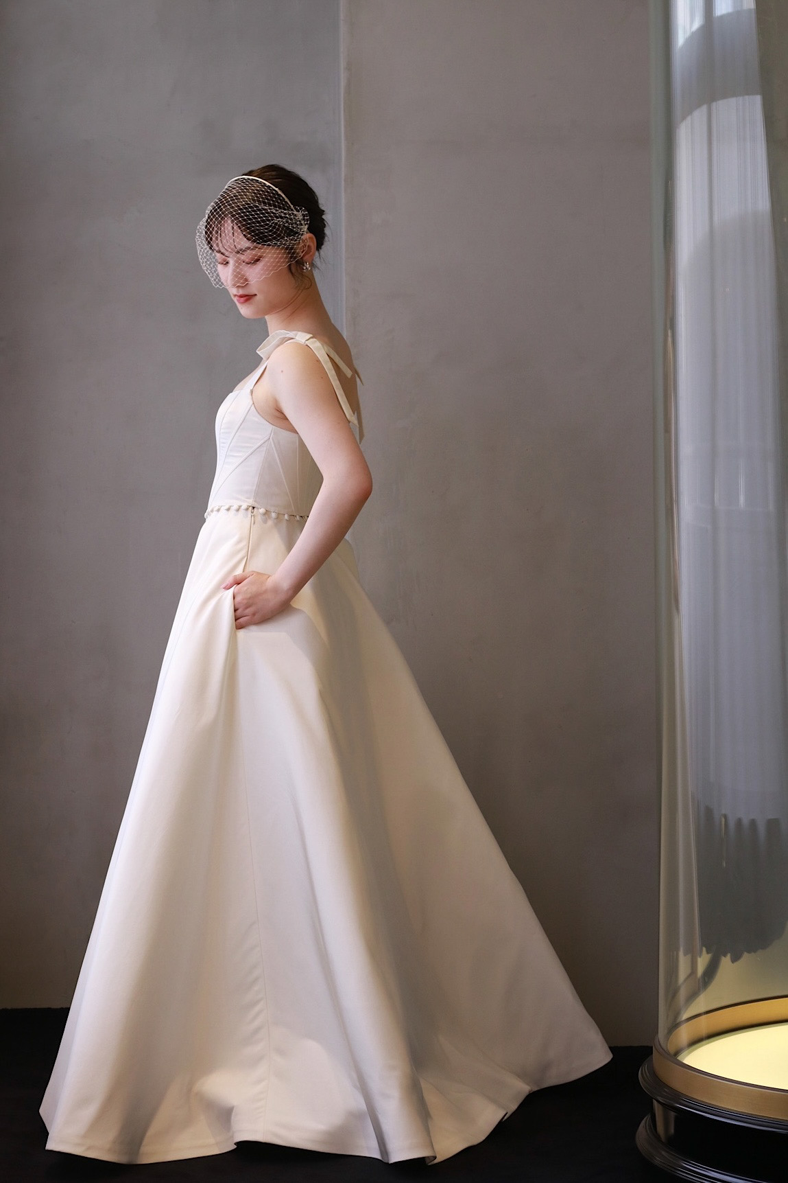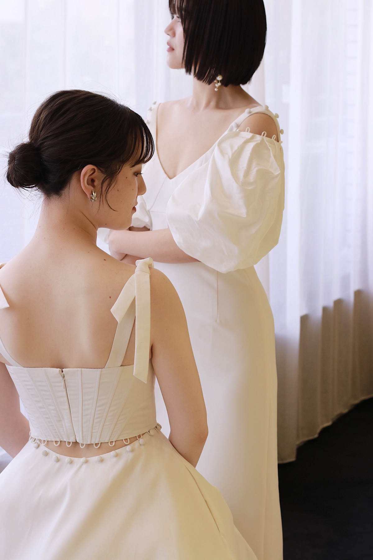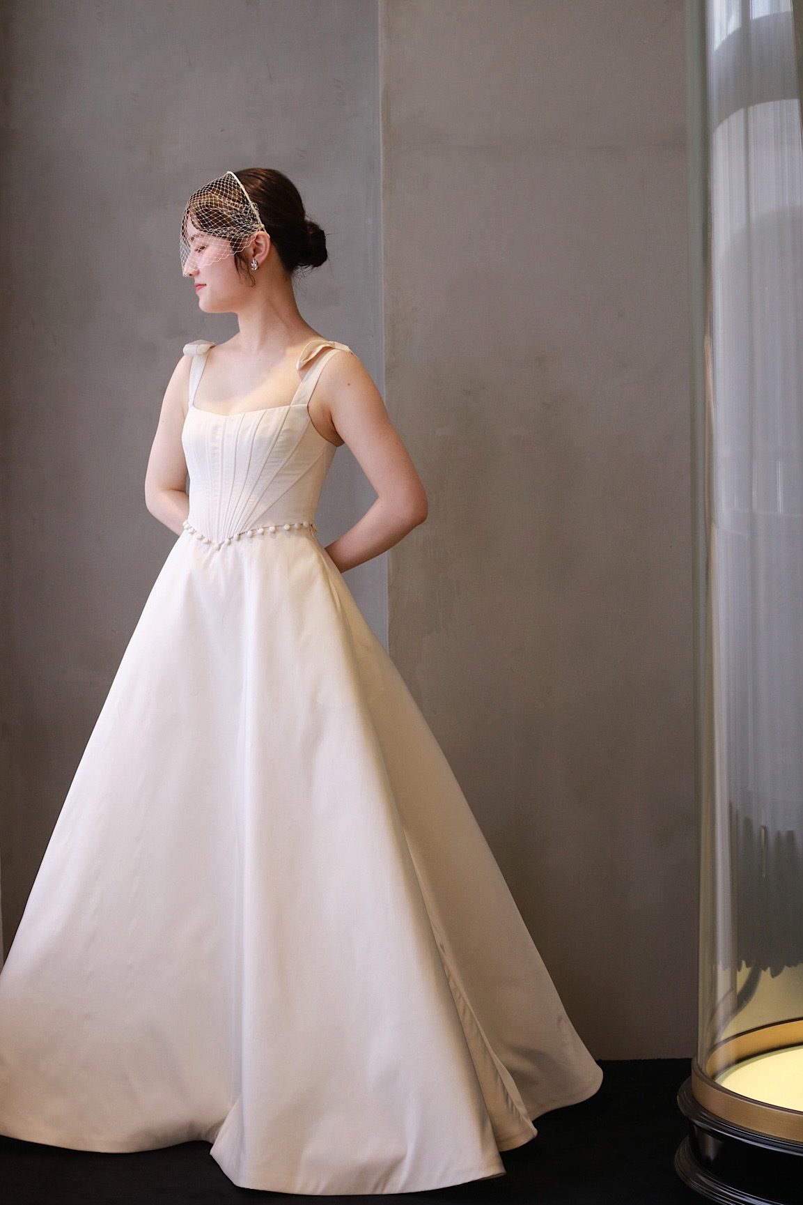 プラバル グルンのシグネチャーといえば、くるみボタン。通常くるみボタンといえば、トレーンなどバックスタイルに用いられることが多いですが、こちらのウェディングドレスはウエストラインにくるみボタンが施されています。くるみボタンは取り外し可能で、トップスとスカートがセパレートデザインになっております。お好みでデザインの変化を楽しんでいただけるプラバル グルンらしい遊び心のあるデザインです。クラシックなAラインドレスも、遊び心ある肌見せのデザインにチェンジすることでこなれ感が生まれ、ゲストの目を惹くことでしょう。シンプルに美しく広がるAラインのスカートは、表地にファイユ素材が用いられており、張りとボリュームを出しながらも軽やかな印象を与えてくれます。また、スカートの裏地はハードチュールで仕立てられていることでAラインのシルエットが自然と維持され、花嫁のどの瞬間も美しいラインを叶えてくれるのです。ウエストに向かって放射状にボーンが入ったデザインビスチェは、身体にフィットする構築的なデザインでウエストシルエットを美しくキープします。肩にデザインされた片結びのリボンは、シンプルでありながらひとひねりあるアクセントを与え、ゲストの心を掴むでしょう。柔らかくまとめたシニヨンヘアに、キャッチーなヘッドアクセサリーとイヤリングを合わせて。遊び心あるコーディネートは気分まであがるはず。お洒落なドレスに挑戦したいけれど、ドレスらしさも欲しい…そんな花嫁にぴったりのウェディングドレスです。