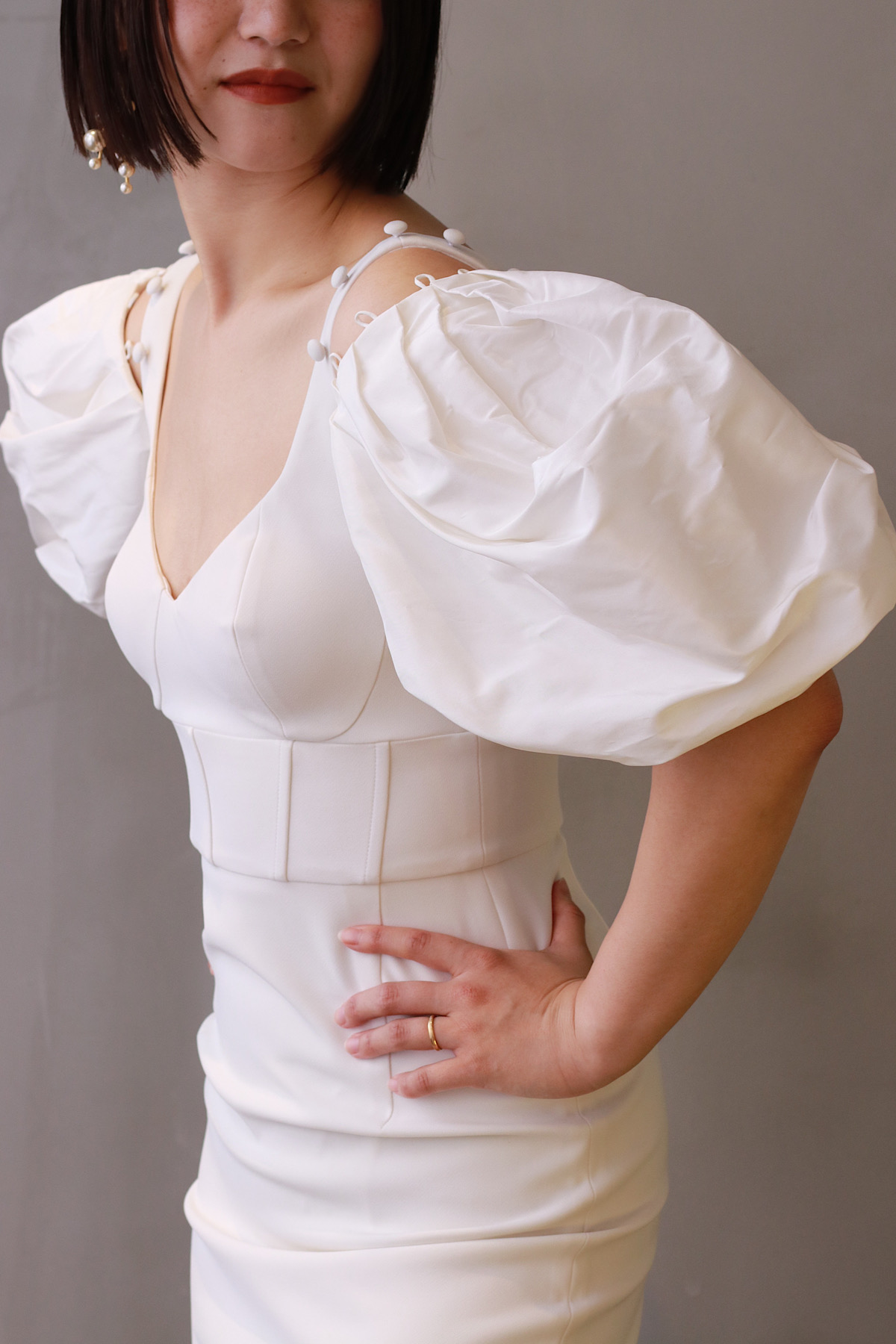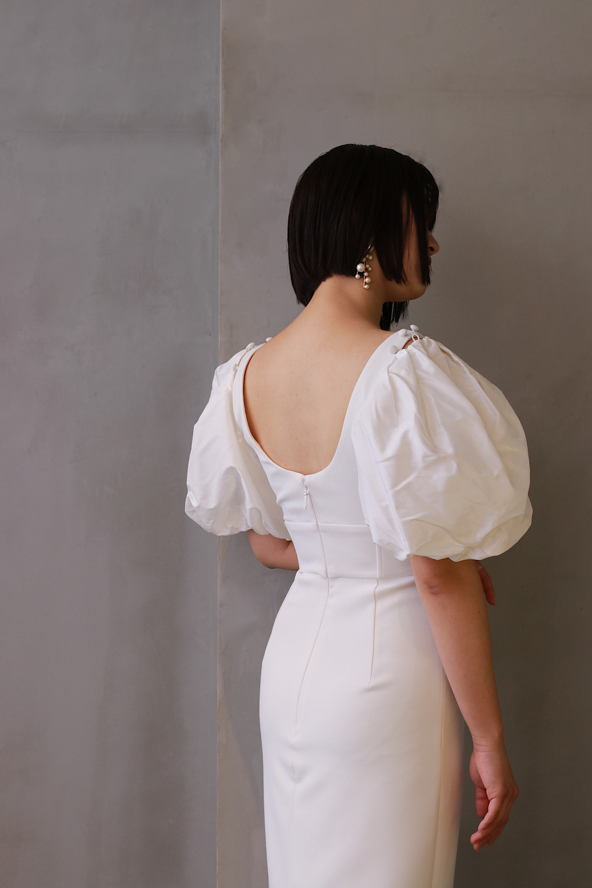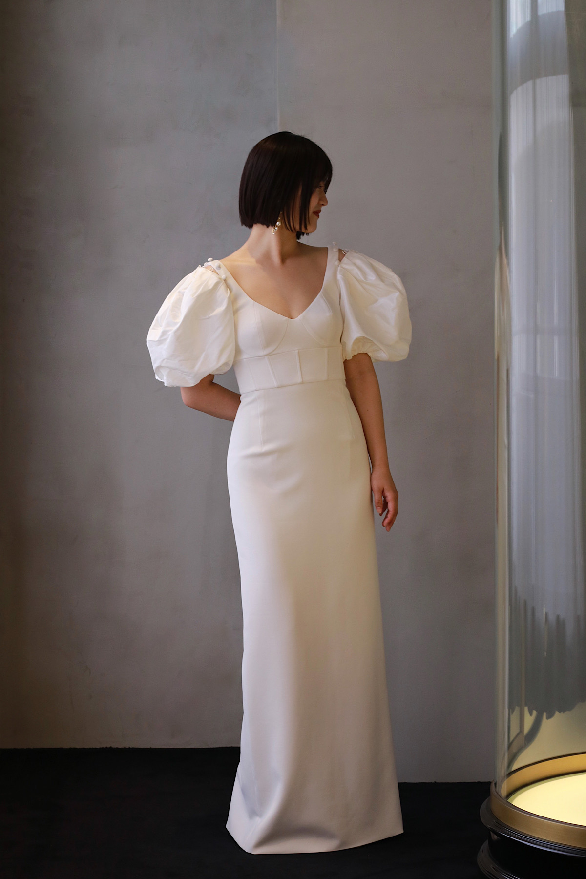 多様的かつミニマルなデザインが特徴的なプラバル グルンらしいスレンダーラインのウェディングドレス。真っ先に目を惹くのは、トレンドのパフスリーブです。実は肩のくるみボタンを外すとオフショルダーデザインとなり、人気のパフスリーブとオフショルダーどちらも楽しめるプラバル グルンらしい多様性のあるデザインなのです。トレンド感あふれるこちらのウェディングドレスは、ファッショナブルなブライズスタイルを叶えたい花嫁にぜひお召しいただきたい1着です。スレンダーラインのドレス本体にはシルククレープが使用されており、シックで洗練された印象に。キャッチーなパフスリーブには異素材のタフタが使用されており、抜け感を感じさせるでしょう。マットでとろみのあるクレープ素材と艶やかでハリのあるタフタ素材を掛け合わせたハイセンスなデザインは、花嫁の心をくすぐります。花嫁のウエストラインを美しくマークするために、縦にボーンを入れたハイウエストデザインもポイント。ダイヤモンド型のネックラインは花嫁の身体に添い、シャープな印象を演出します。トレンド感溢れるモダンなウェディングドレスには、モードな印象のボブヘアスタイルに、デザイン性のある大ぶりなパールイヤリングを覗かせて。モダンでキャッチーなドレスだからこそ、心躍るコーディネートを楽しんでみてはいかがでしょうか。