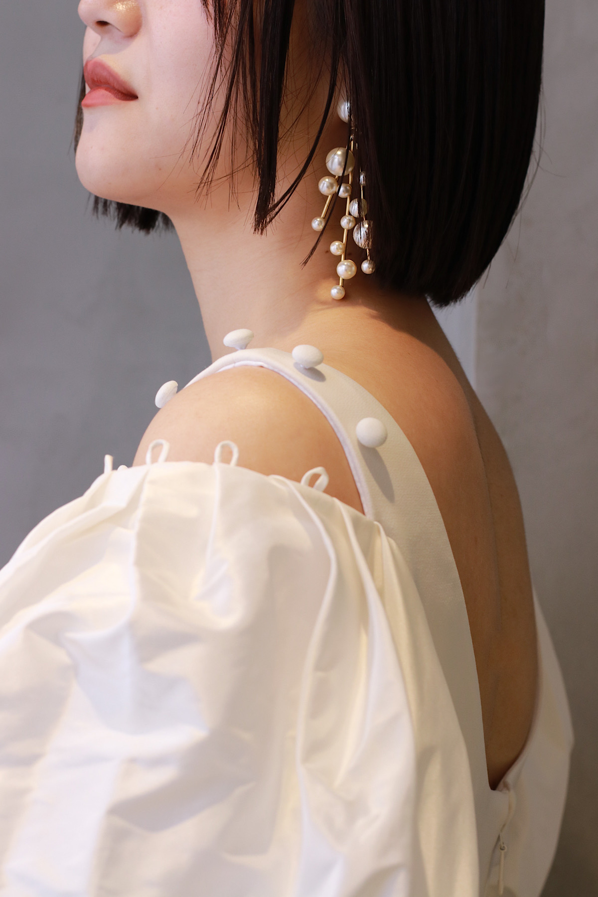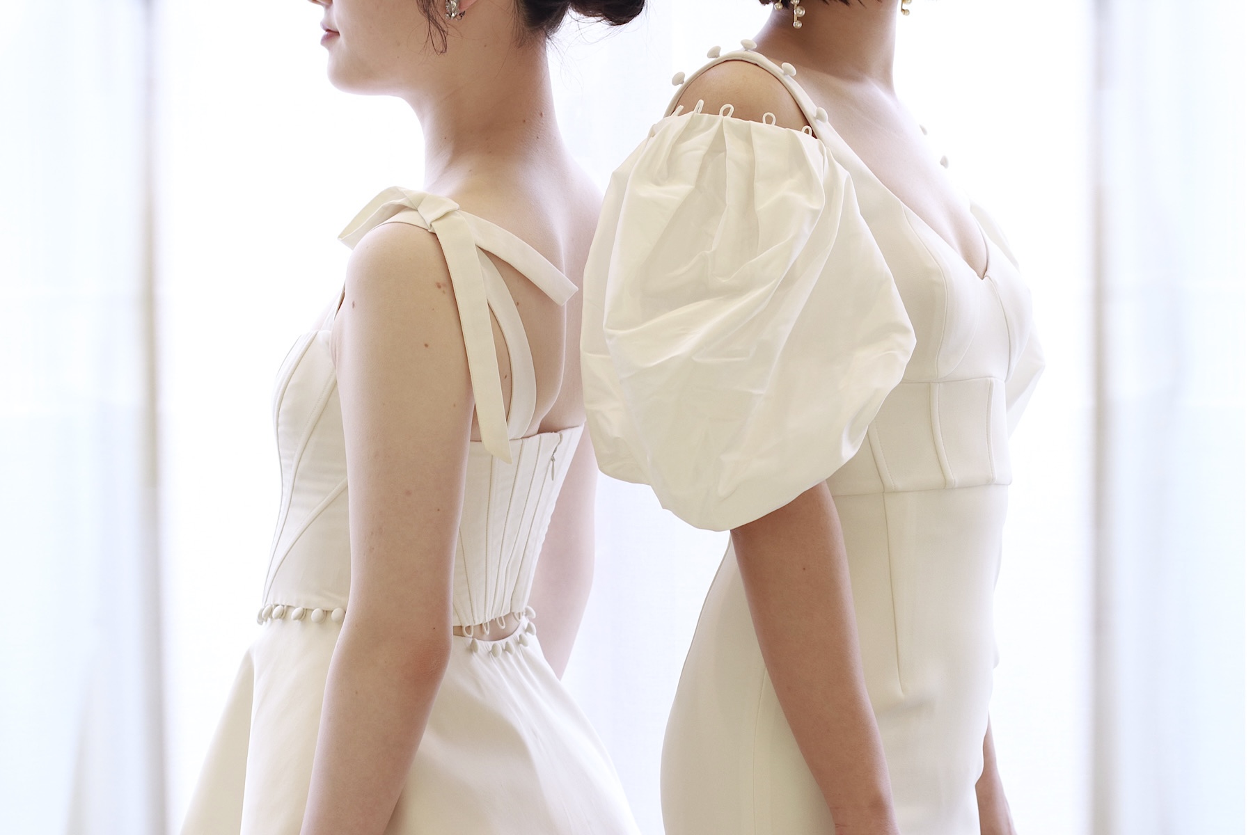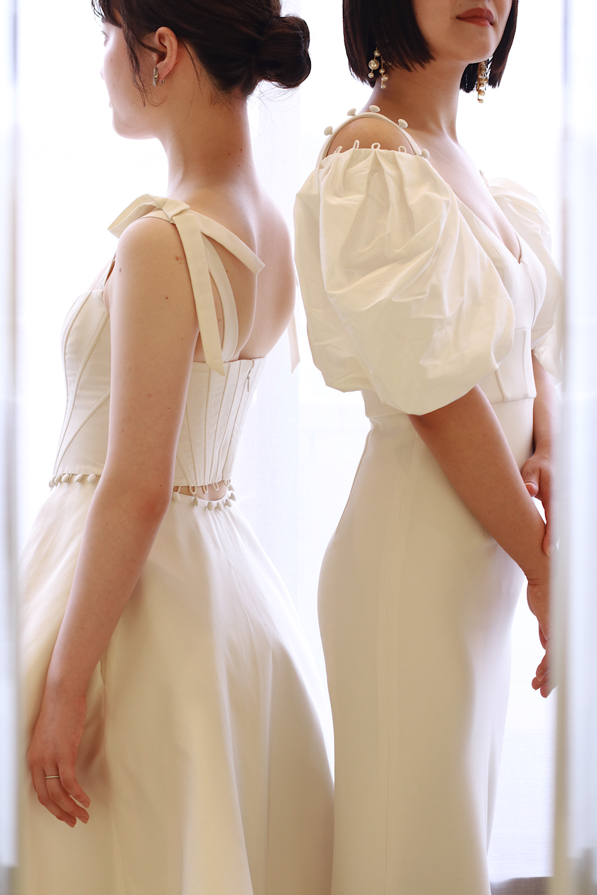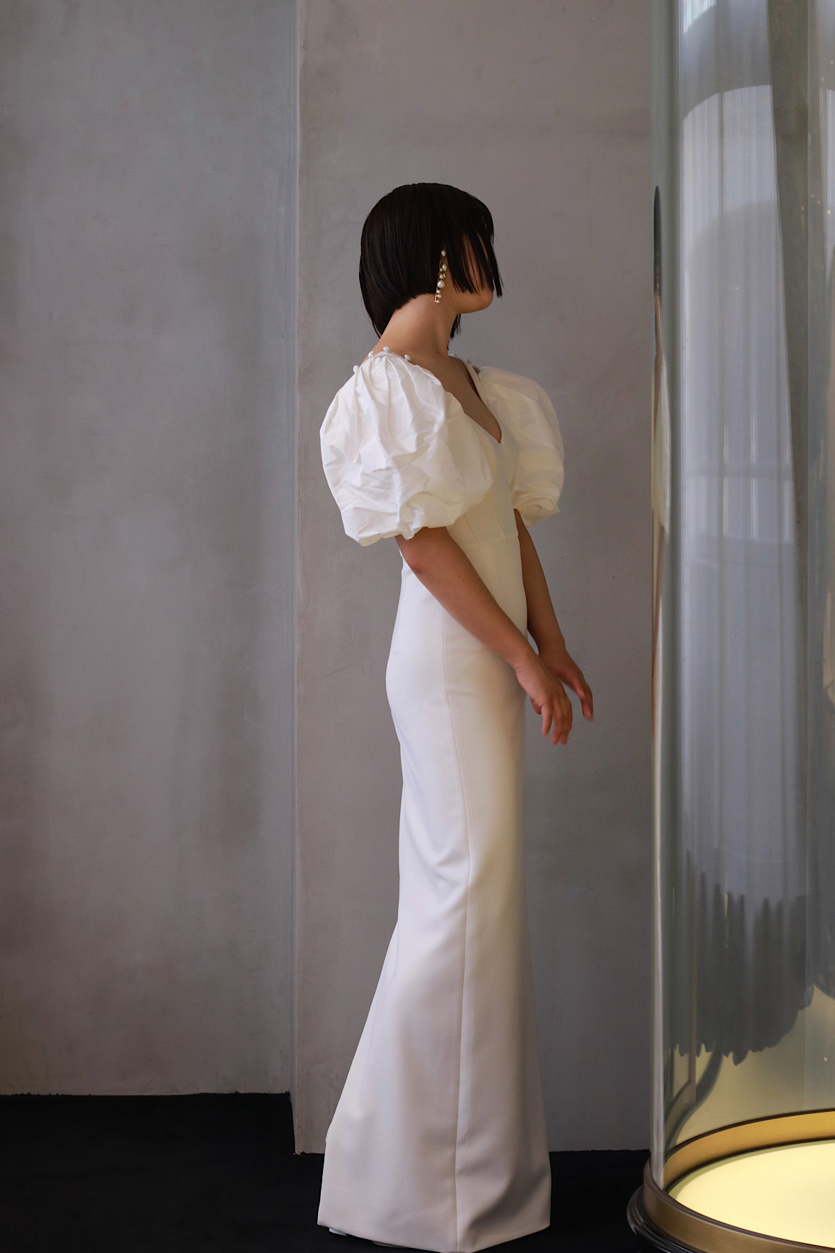 多様的かつミニマルなデザインが特徴的なプラバル グルンらしいスレンダーラインのウェディングドレス。真っ先に目を惹くのは、トレンドのパフスリーブです。実は肩のくるみボタンを外すとオフショルダーデザインとなり、人気のパフスリーブとオフショルダーどちらも楽しめるプラバル グルンらしい多様性のあるデザインなのです。トレンド感あふれるこちらのウェディングドレスは、ファッショナブルなブライズスタイルを叶えたい花嫁にぜひお召しいただきたい1着です。スレンダーラインのドレス本体にはシルククレープが使用されており、シックで洗練された印象に。キャッチーなパフスリーブには異素材のタフタが使用されており、抜け感を感じさせるでしょう。マットでとろみのあるクレープ素材と艶やかでハリのあるタフタ素材を掛け合わせたハイセンスなデザインは、花嫁の心をくすぐります。花嫁のウエストラインを美しくマークするために、縦にボーンを入れたハイウエストデザインもポイント。ダイヤモンド型のネックラインは花嫁の身体に添い、シャープな印象を演出します。トレンド感溢れるモダンなウェディングドレスには、モードな印象のボブヘアスタイルに、デザイン性のある大ぶりなパールイヤリングを覗かせて。モダンでキャッチーなドレスだからこそ、心躍るコーディネートを楽しんでみてはいかがでしょうか。