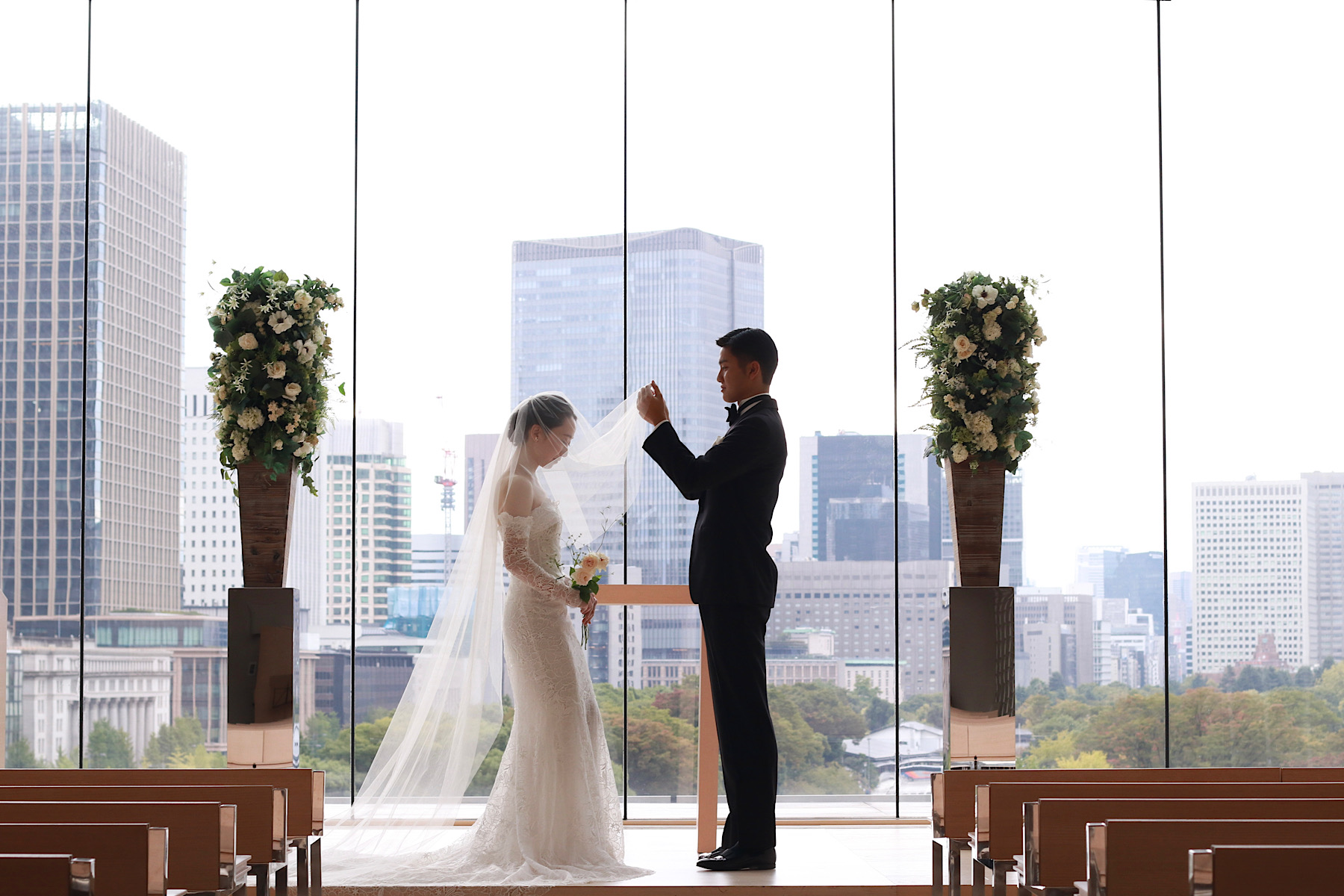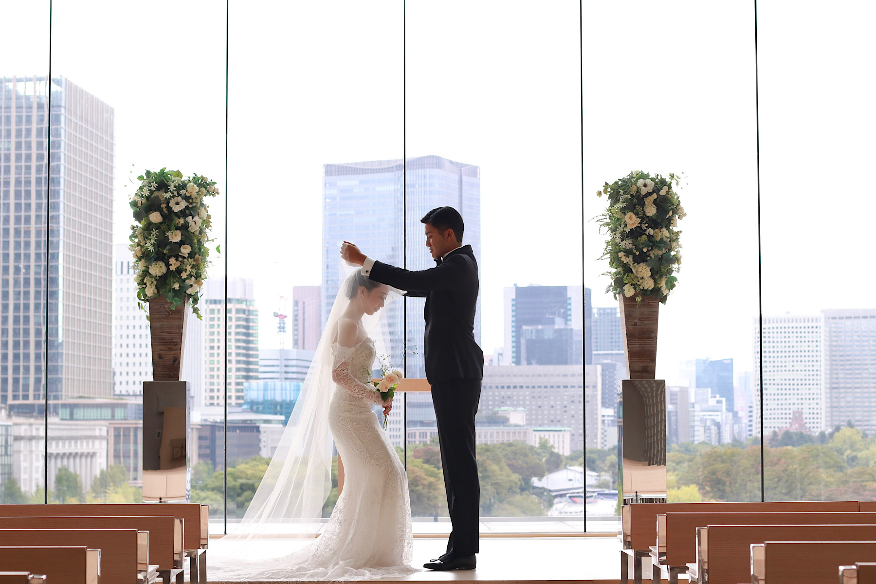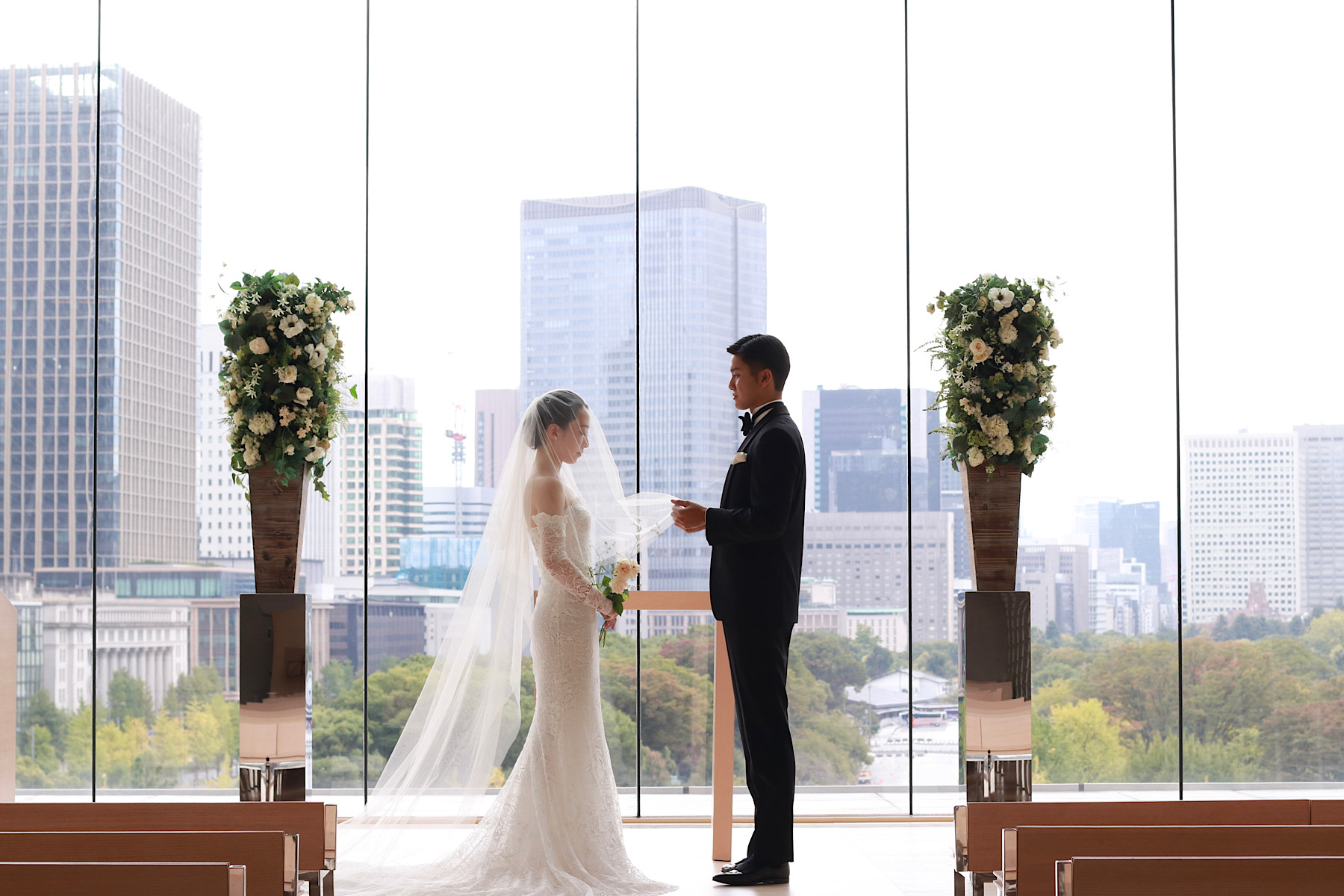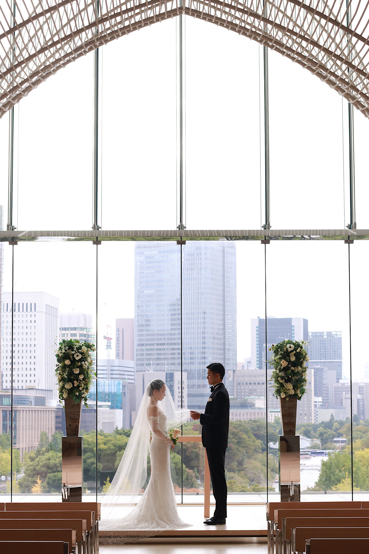 自然光と悠久のときに育まれた深い緑のパノラマが広がるパレスホテル東京のチャペル。ほかにはない凛とした美しさを湛えたチャペルで優しい自然光に包まれて、 一生に一度のウェディングセレモニーがいよいよ始まります。お二人の人生、そしてご両家の絆を紡ぐ挙式。それぞれが揺るぎない決意を胸に、未来への旅立ちの舞台に立つ厳かで温かな誓いのシーンは、心に響く瞬間になるでしょう。美しいハープの音色が響き渡る神聖な空間。繭を思わせる美しいアーチがお二人を優しく見守るパレスホテル東京のチャペルでは、マーメイドラインのウェディングドレスでお二人とゲストの皆様の距離が近い温かなセレモニーを。繊細な総レースは、花嫁が歩みを進めるたびに表情を変え、天からの祝福を受けたかのように光を優しく纏うのです。シンプルで洗練されたパレスホテル東京のチャペルだからこそ、上質でスタイリッシュな総レースマーメイドラインのウェディングドレスを選んではいかがでしょうか。