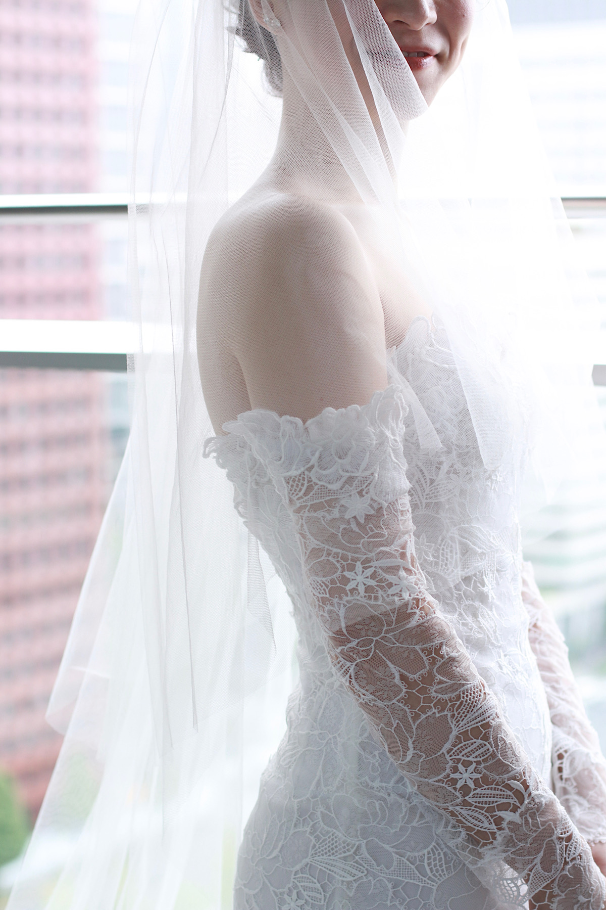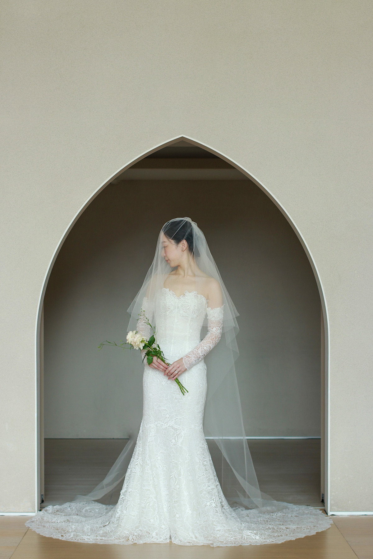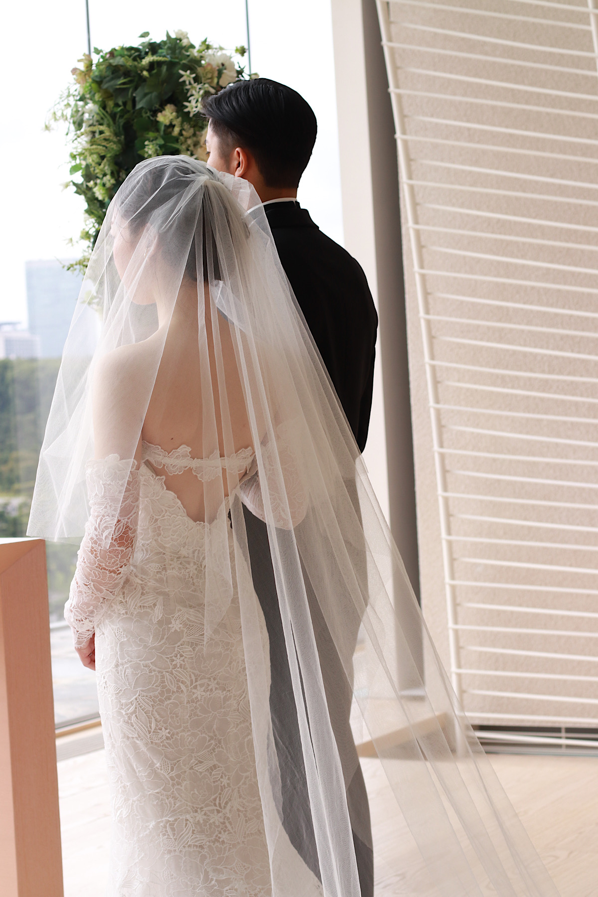自然光と悠久のときに育まれた深い緑のパノラマが広がるパレスホテル東京のチャペル。ほかにはない凛とした美しさを湛えたチャペルで優しい自然光に包まれて、 一生に一度のウェディングセレモニーがいよいよ始まります。お二人の人生、そしてご両家の絆を紡ぐ挙式。それぞれが揺るぎない決意を胸に、未来への旅立ちの舞台に立つ厳かで温かな誓いのシーンは、心に響く瞬間になるでしょう。美しいハープの音色が響き渡る神聖な空間。繭を思わせる美しいアーチがお二人を優しく見守るパレスホテル東京のチャペルでは、マーメイドラインのウェディングドレスでお二人とゲストの皆様の距離が近い温かなセレモニーを。繊細な総レースは、花嫁が歩みを進めるたびに表情を変え、天からの祝福を受けたかのように光を優しく纏うのです。シンプルで洗練されたパレスホテル東京のチャペルだからこそ、上質でスタイリッシュな総レースマーメイドラインのウェディングドレスを選んではいかがでしょうか。