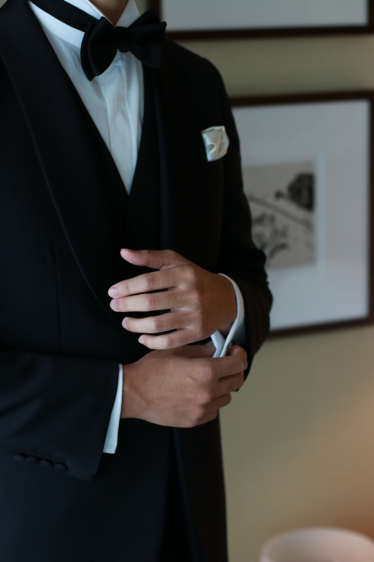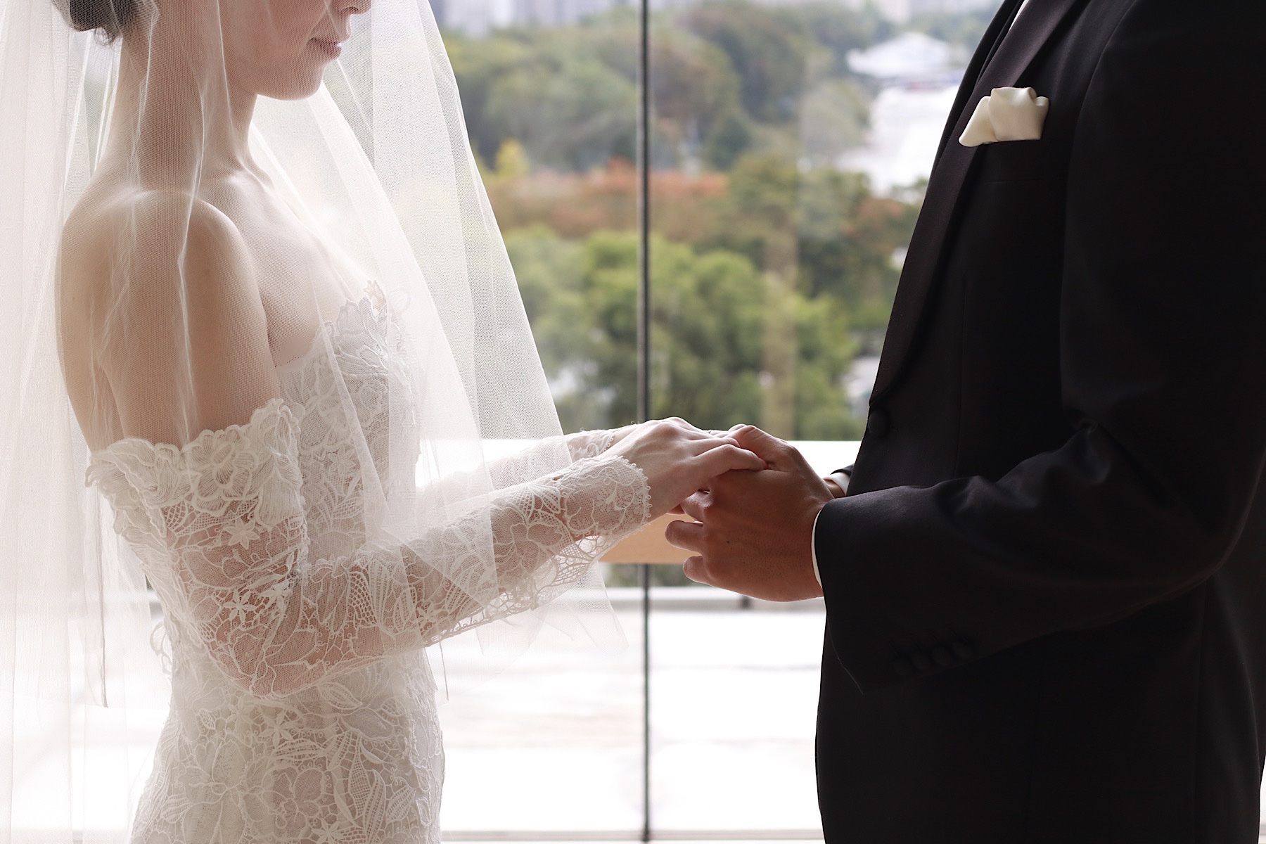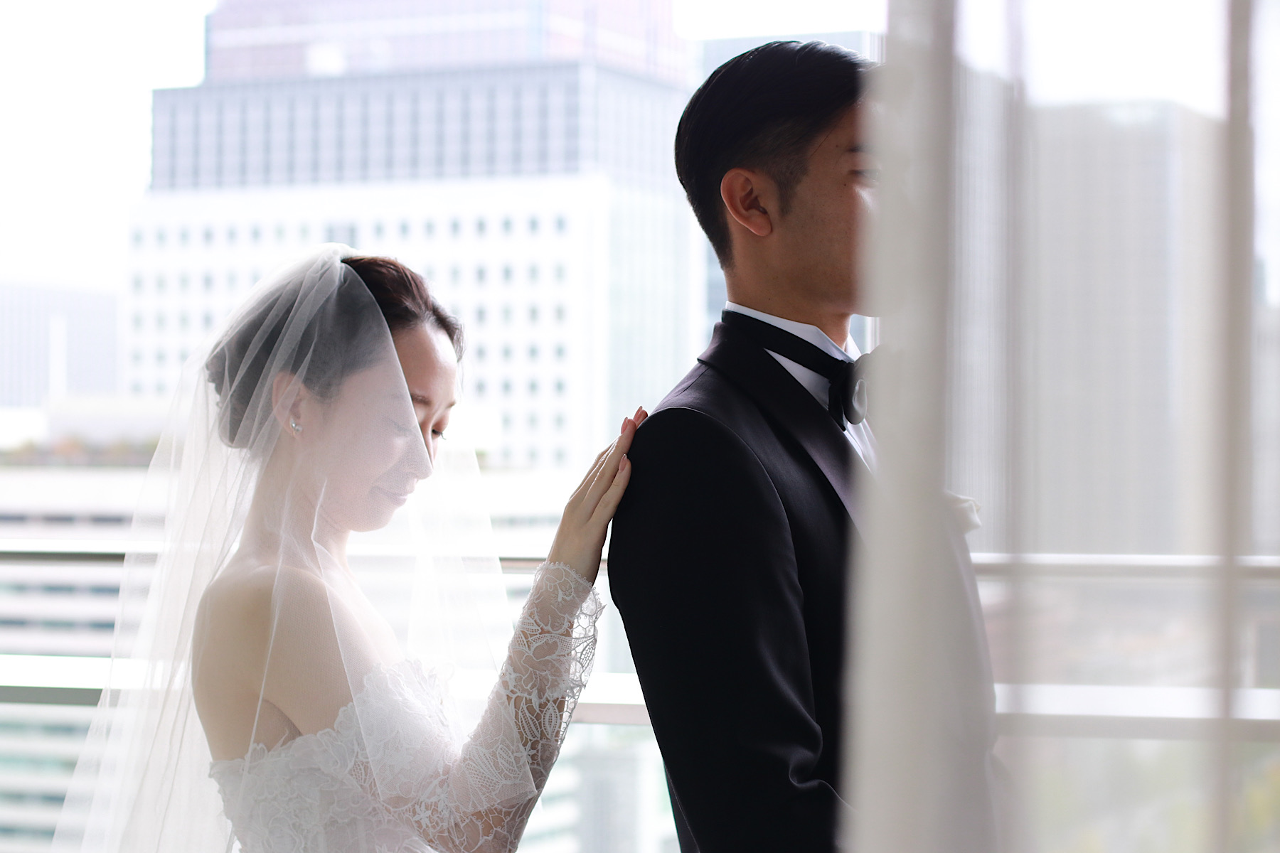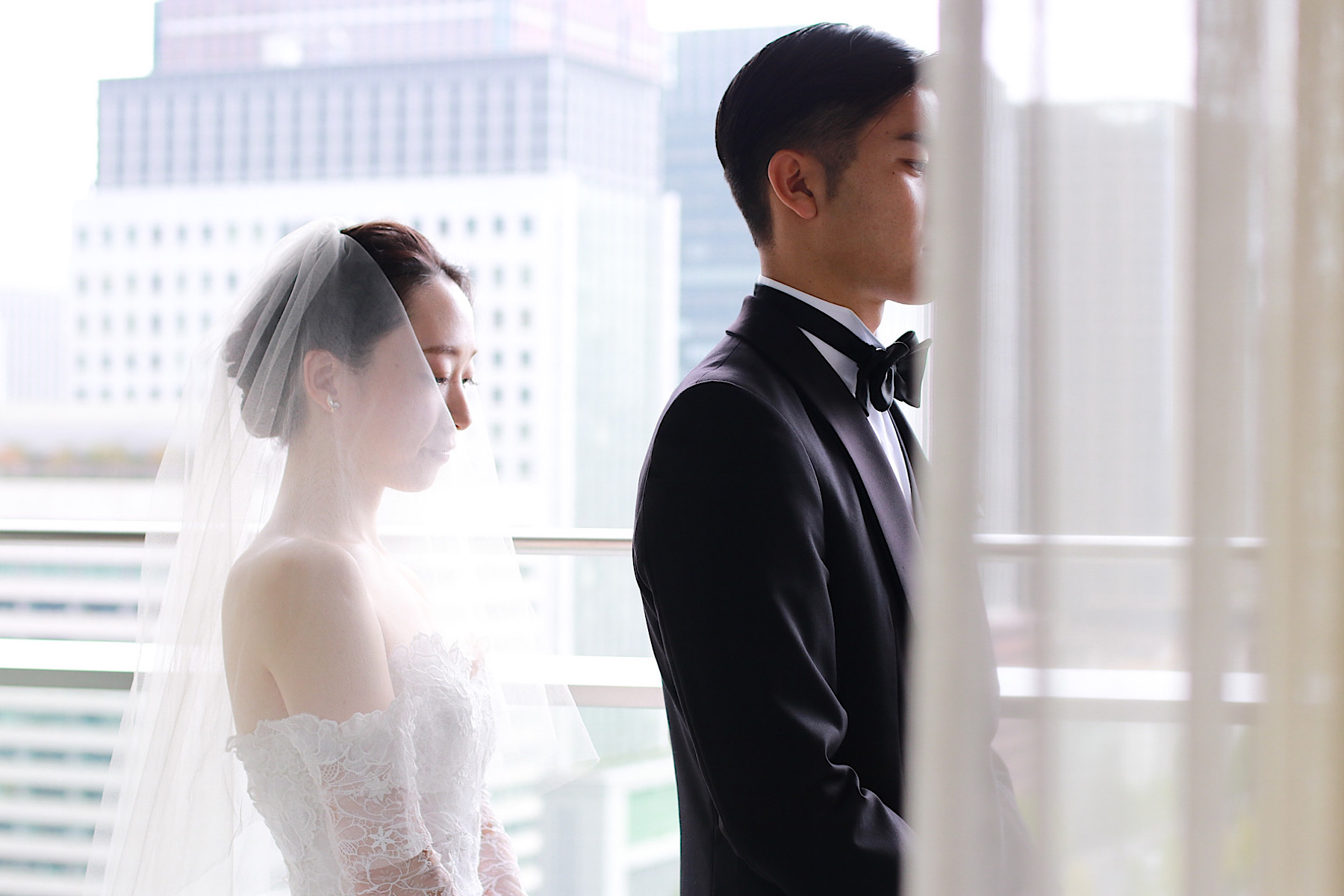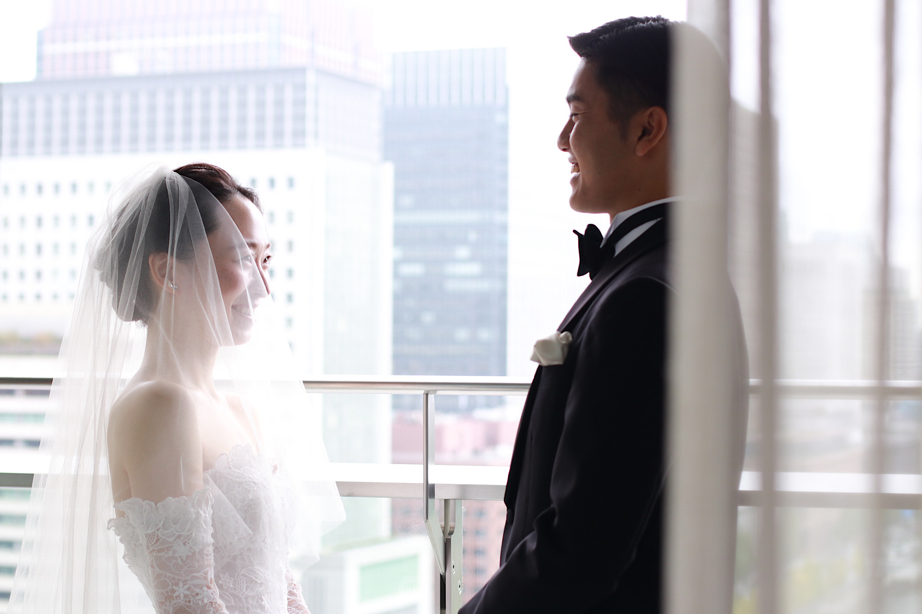 ラグジュアリーでありながらリラックスムード漂うパレスホテル東京の客室。結婚式を翌日に控えたお二人は、これまでのお二人の歩みと明日への溢れんばかりの気持ちを胸に過ごすのです。開放感のある窓から夜明けとともに暖かく差し込む陽の光と共に、特別な一日が始まります。お支度を結び、ドレスアップしたお二人が皇居の豊かな自然に囲まれた開放感あふれるバルコニーで行うファーストミート。緑と風に包まれ心が解きほぐされたお二人のファーストミートはきっと特別な時間となることでしょう。愛するご新婦様のウェディングドレス姿を初めて目の当たりにし思わず笑みを溢すご新郎様と、少し照れくさそうなご新婦様。結婚式が始まる前にプライベート空間で自然体な時間をゆっくりと過ごせることも、パレスホテル東京ウェディングの魅力なのです。