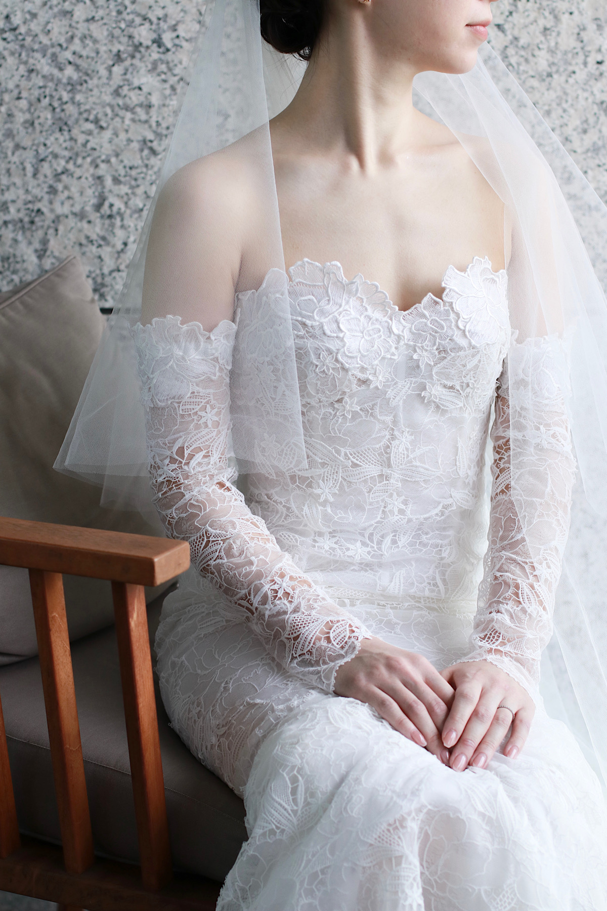 パレスホテル東京での結婚式におすすめしたいのは、繊細なレースが美しいオスカー デ ラ レンタのマーメイドラインのウェディングドレス。世界中の女性を魅了し続け、圧倒的な存在感を誇るオスカー デ ラ レンタ。ウェディングドレスを纏った花嫁は、あまりにも優美で気品があり神々しく惹き立つのです。今回ご紹介する新作ウェディングドレスは、息をのむほど美しい総レースのマーメイドライン。柔らかく花嫁の身体に添い女性らしいしなやかさを演出できるのは、繊細で上質なレースをふんだんに使っているから。そして、そんな上質な素材を扱えるのはオスカー デ ラ レンタの培ってきたクチュールテクニックがあるからこそなのです。柔らかな光を浴びて花嫁の肌に浮かび上がるレースは、繊細ながらも凛とした強さを感じさせます。そんな美しいレースが光を纏い花嫁を柔らかく包み込んだ姿は幻想的で、ゲストの皆様を魅了することでしょう。