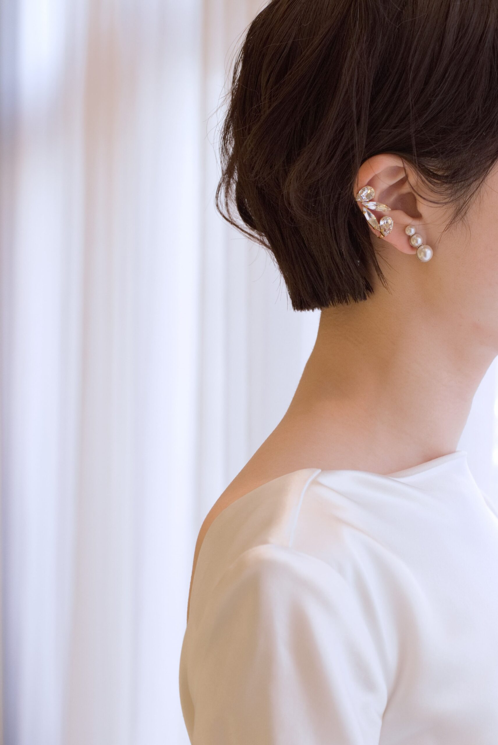 フロントのデザインからは考えられないほど大胆に空いた背中のデザイン。そんなバックコンシャスなウェディングドレスも、ダニエル フランケルであれば上品に纏うことが叶います。結婚式という非日常な一日だからこそ挑戦できる特別なデザインは、360度すべての角度に魅力を与え、ゲストにサプライズをもたらします。フロントには一切の縫い目がなく一枚の生地で仕立てられ、デコルテは鎖骨の上まで覆われます。縫製技術の高いダニエル フランケルだからこそ叶えられるこのシルエットにより、すらりとした印象とクリーンな美しさを感じていただく事ができるのです。揺らめく袖元とバックコンシャスな背中のデザインをどのように楽しむかは、ドレスを纏う花嫁次第。運命のドレスとの出会いをさらに特別なものへと昇華する、あなただけの着こなしに。時にはアクセサリーを重ねてつけてみたり、ショートヘアーをくるくると巻いてみたり…。いつも通りの自分らしさにプラスアルファのアイデアを加えて、シンプルなウェディングドレスだからこそのオリジナルを楽しんでみてはいかがでしょう。きっと、自分らしく居られる着こなしと、ダニエル フランケルの圧倒的な美しさが、360度魅力的な花嫁姿を叶えてくれるはず。