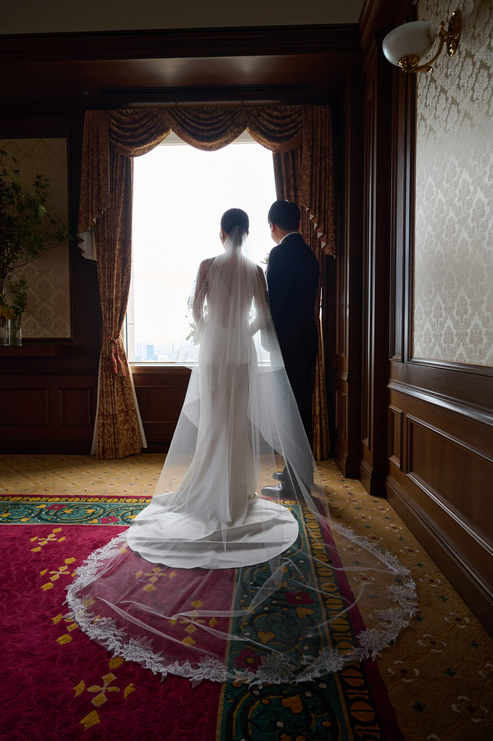 ご新婦様がドレスと同じくらいこだわって選んだのはベールです。このドレスを纏ったご新婦様が、霞山会館の大きな吹き抜けの窓の前に立たれる瞬間を想像してご提案させていただきました。目の前から柔らかな自然光が差し込む時、ドレスの広がりに重なるベールの透明感。そんなドレスとベールの間に生まれる光の空間は絶対に美しい。そう確信しておりました。お式を終えられたご新婦様からは、その瞬間が美しすぎて何度も見返しているとお話しもいただきました。ぜひこれからお式を控える花嫁にもこだわっていただきたいアイテムの一つです。ゲストの皆様が花嫁姿を初めて見る瞬間に、どんなコーディネートで過ごされたいかをイメージしながら選んでみてはいかがでしょうか。ご新婦様はこのアムサーラのウェディングドレスを様々なコーディネートで着こなしてくださいました。どのシーンでもご新婦様がご自身らしく柔らかな表情で過ごされているのが印象的で、このウェディングドレスに出会って頂けたことを心から嬉しく思います。