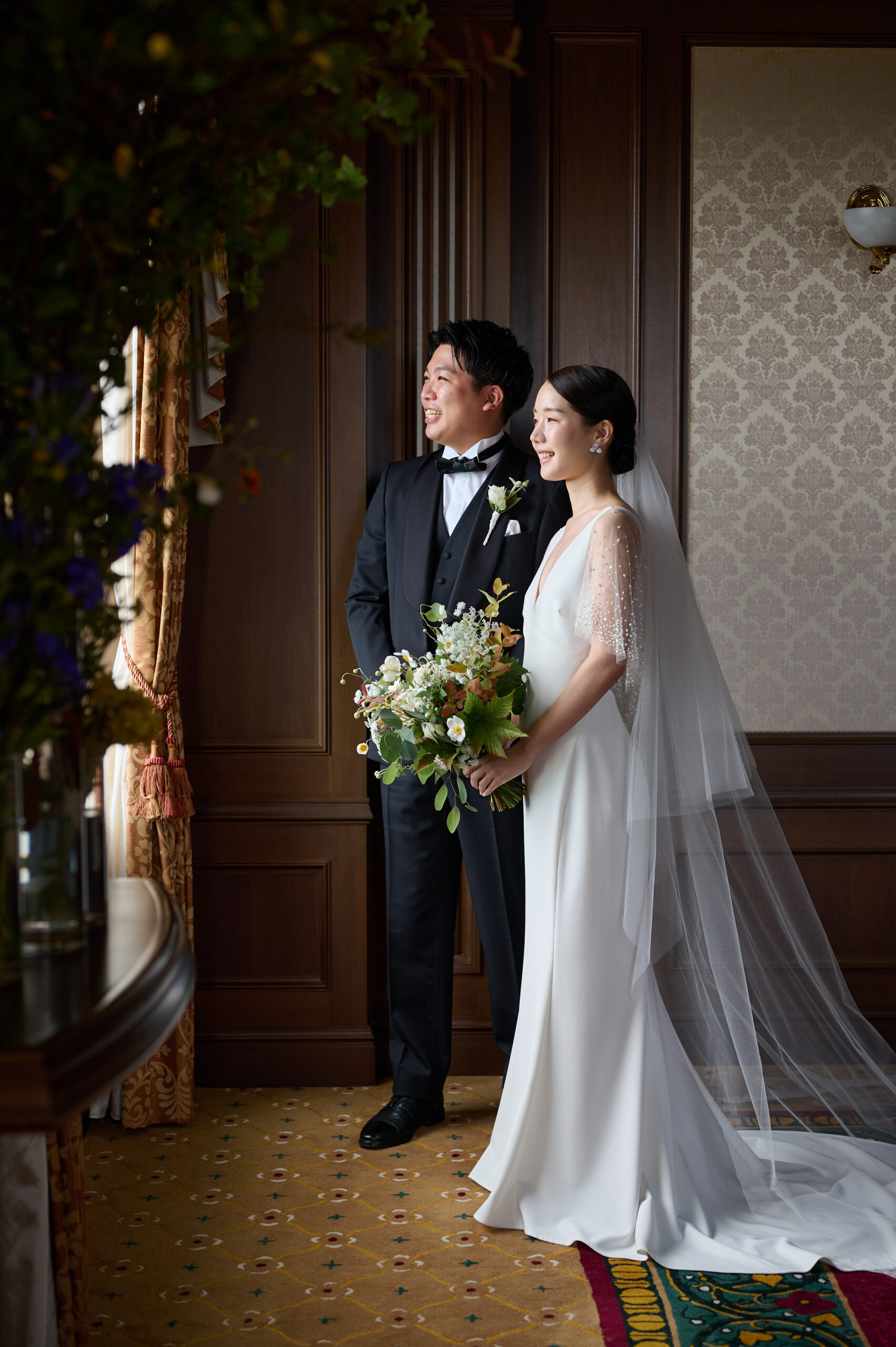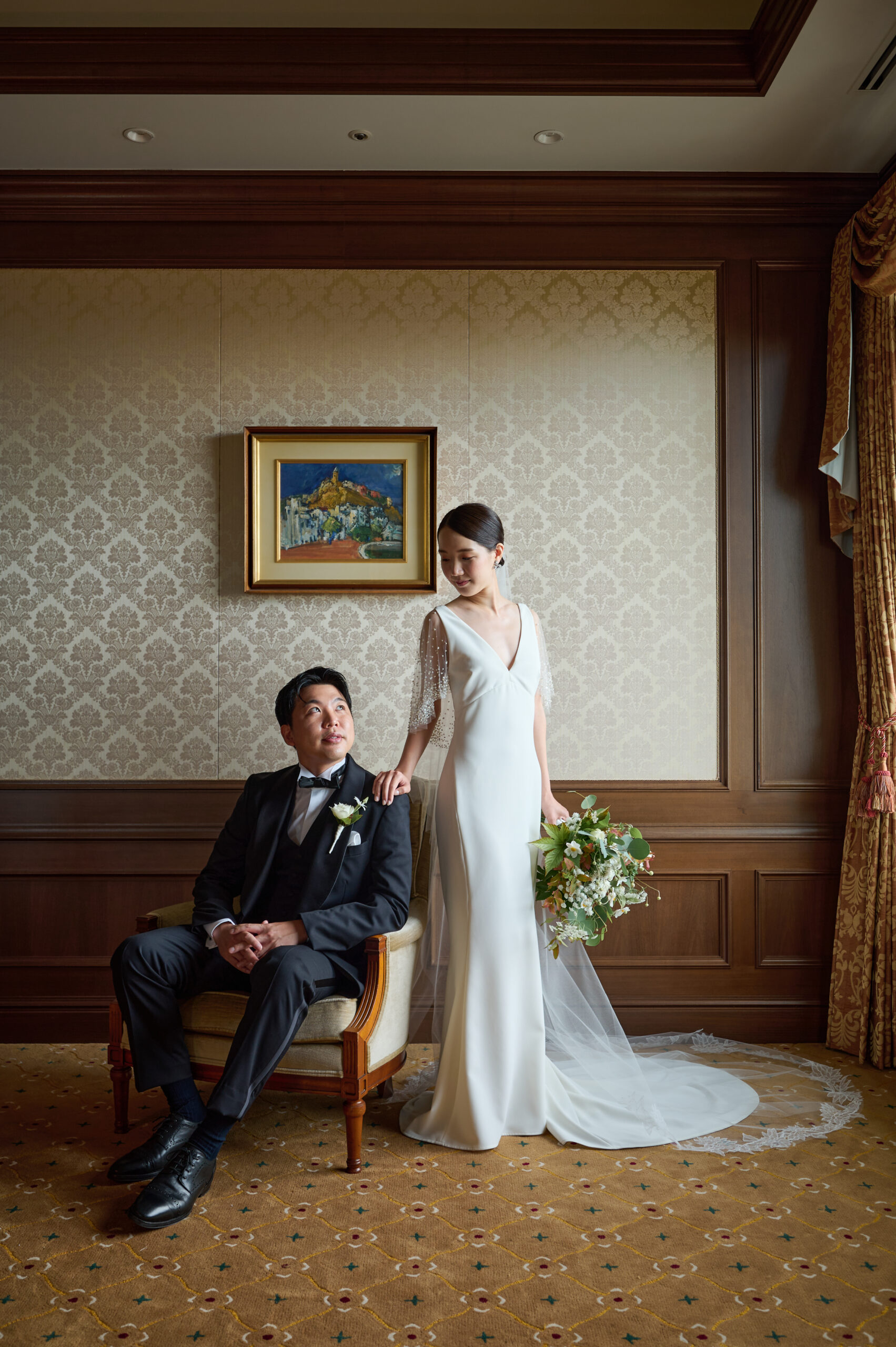 パレスホテル東京が運営する霞山会館のクラシカルな館内で、お二人の魅力を引き出すウェディングドレスとタキシードは、いつの時代も変わることのない普遍的な美しさを体現します