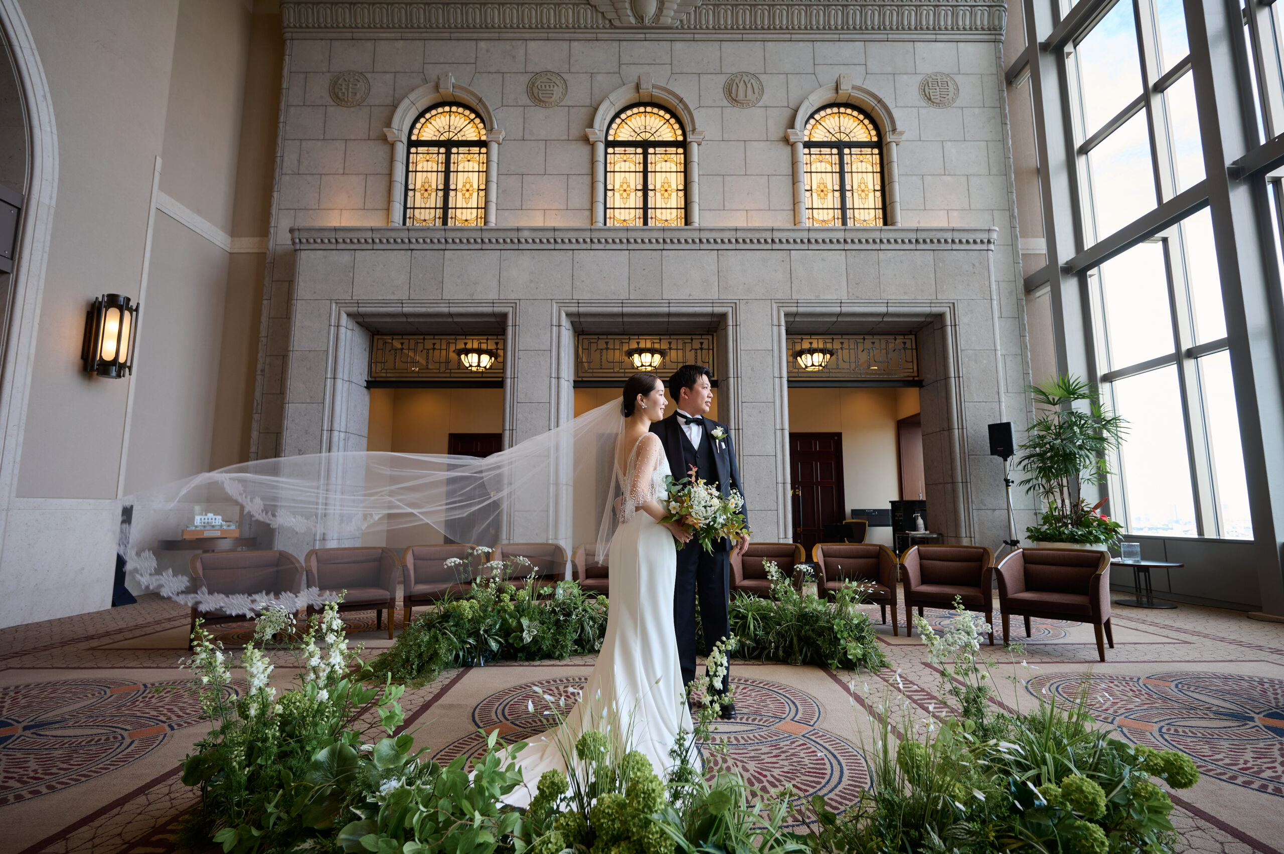 幼い頃からずっとそばでお二人を見守ってきたご親族のみで行われた挙式、披露宴。旧霞山会館の建築美をそのまま残したファザードと、大きな窓と吹き抜けのロビーで行われる挙式は、重厚感と開放感が融合する特別な空間です。東京の景色を一望できる窓から差し込む自然光はお二人とゲストの皆様のこれからを健やかに照らします。