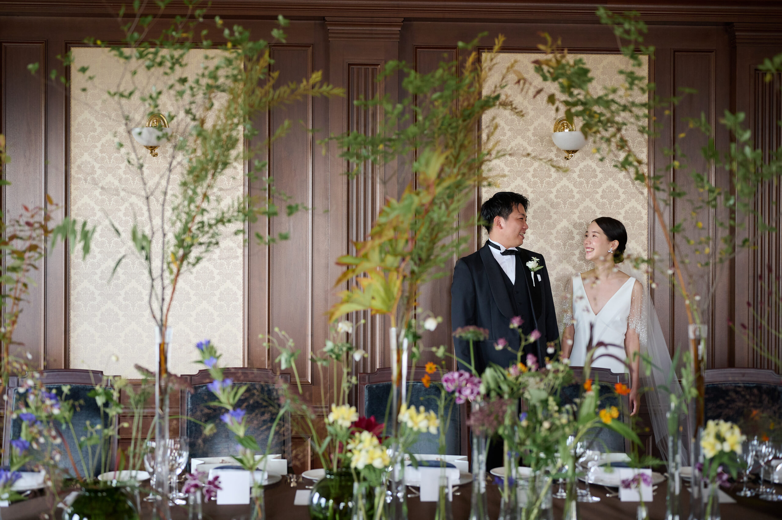 パレスホテル東京の運営する霞山会館のクラシックな館内にナチュラルな自然あふれる温かな空間を作り出し、向かい合うご新郎ご新婦様