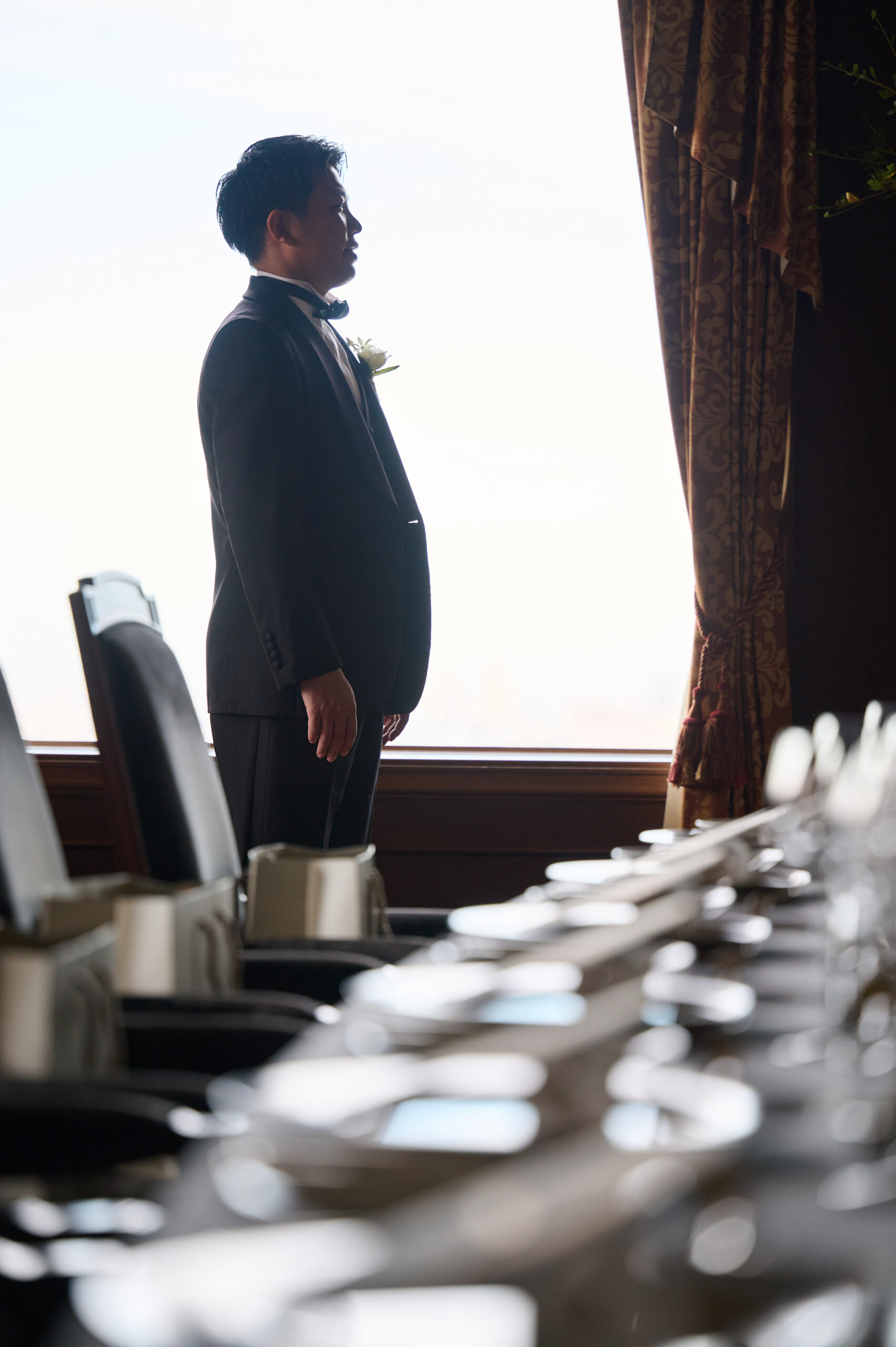 ザトリートドレッシングのオリジナルブランド、トリートジェントルマンのブラックのタキシードに身を包むご新郎様は霞山会館のクラシックなしつらえにぴったりです