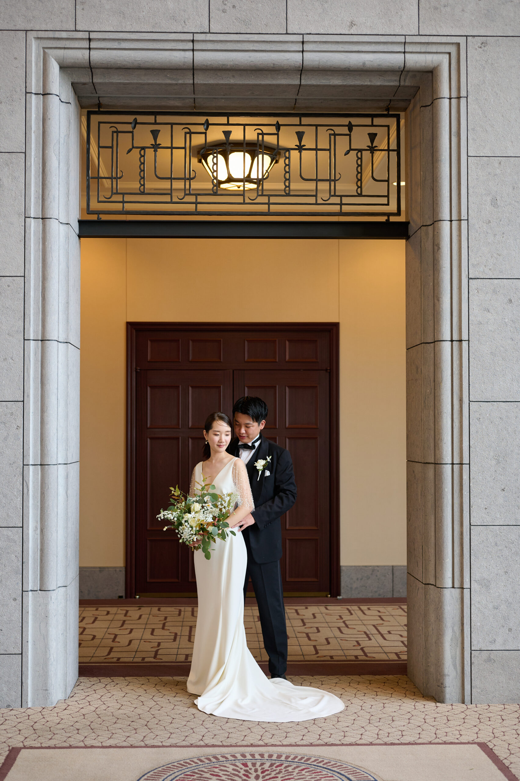 パレスホテル東京の運営する霞山会館の印象的な場所、旧霞山会館の美しい建築をそのまま移転したファザードの前で思い出の一枚を残すご新郎ご新婦様