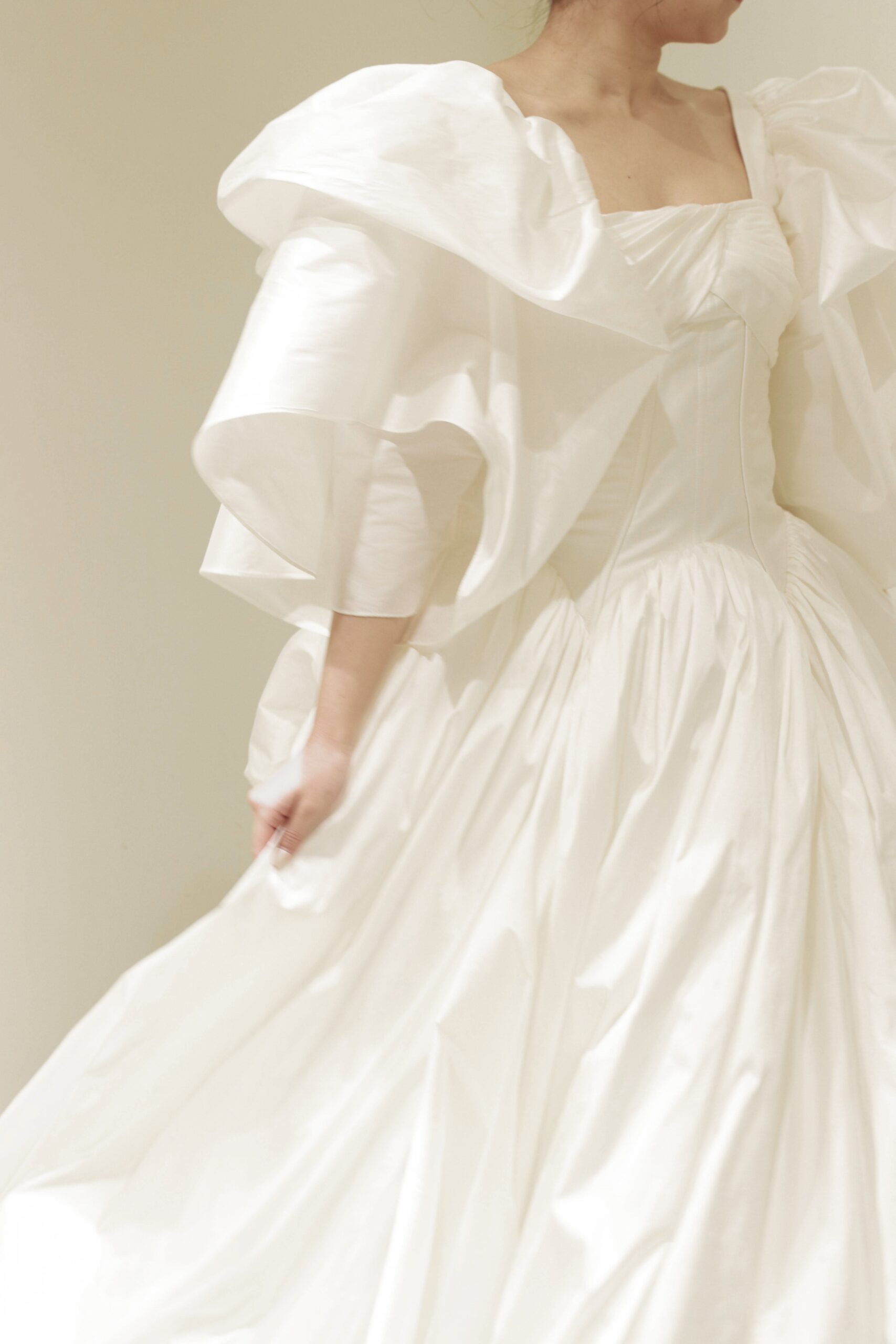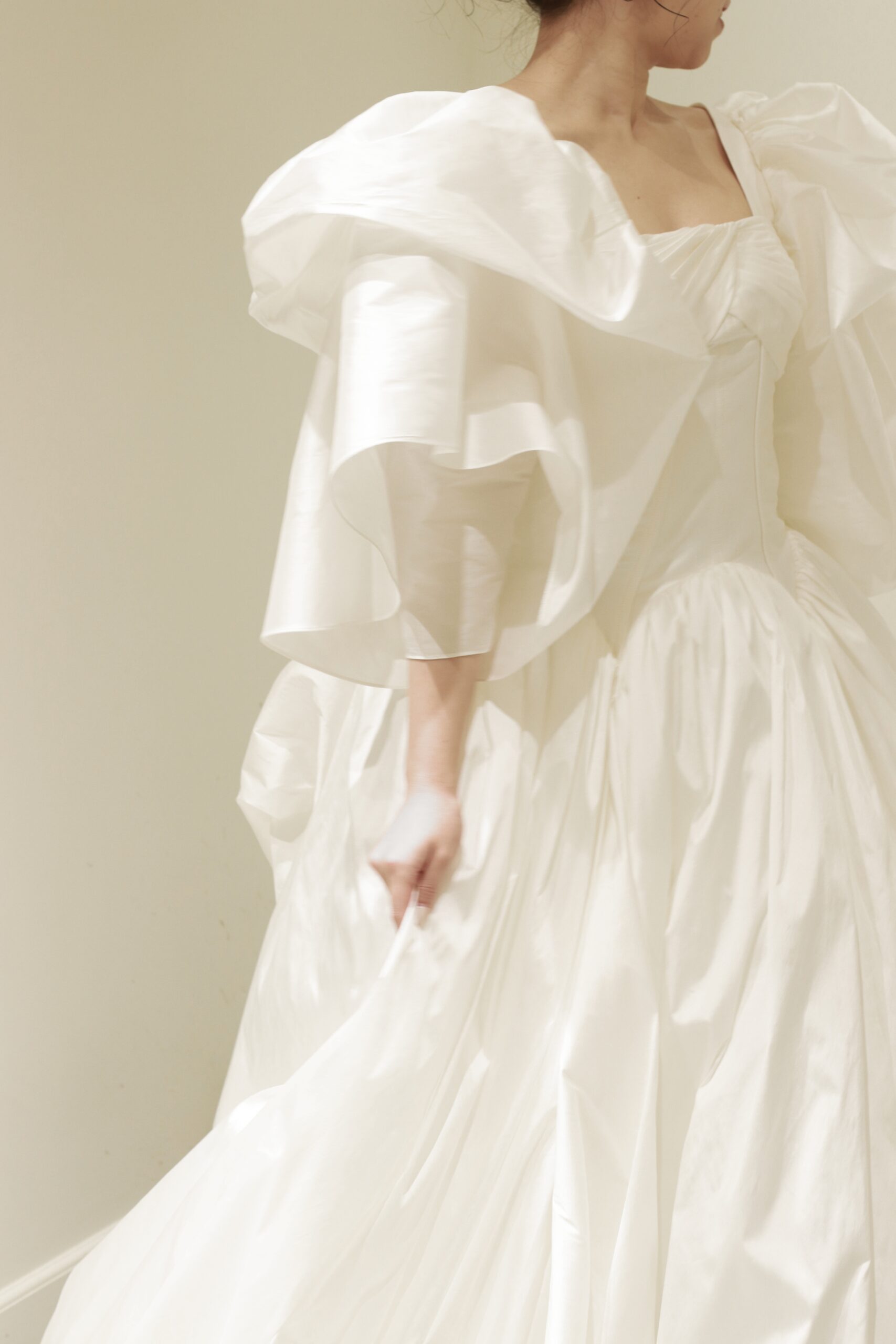 ショルダー部分の大きな花びらをイメージしたようなデザインが特徴的なウェディングドレス。シルエットはまるで夜になると大胆に咲き溢れる花のように、ボリュームやトレーンが華やかにデザインされています。また、緻密で程よい光沢感がある軽やかなシルクタフタを贅沢に使用することで、生地が重なった際や光の加減でできる陰影でさえもデザインの一部となります。重たさを感じさせない空気を纏ったかのようなシルクタフタのファブリックと、腰元の細やかに寄せられたタックが、ふんわりと広がるプリンセスラインのシルエットを演出し、ラグジュアリーで気品あふれる優美な女性像を想像させるのです。