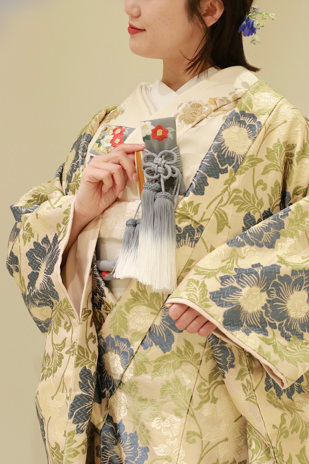ザトリートドレッシングアディション店に入荷したトリートオリジナルの新作色打掛、春夏の結婚式や前撮りにおすすめの、柔らかい黄緑色や青色の色彩がおしゃれな印象です
