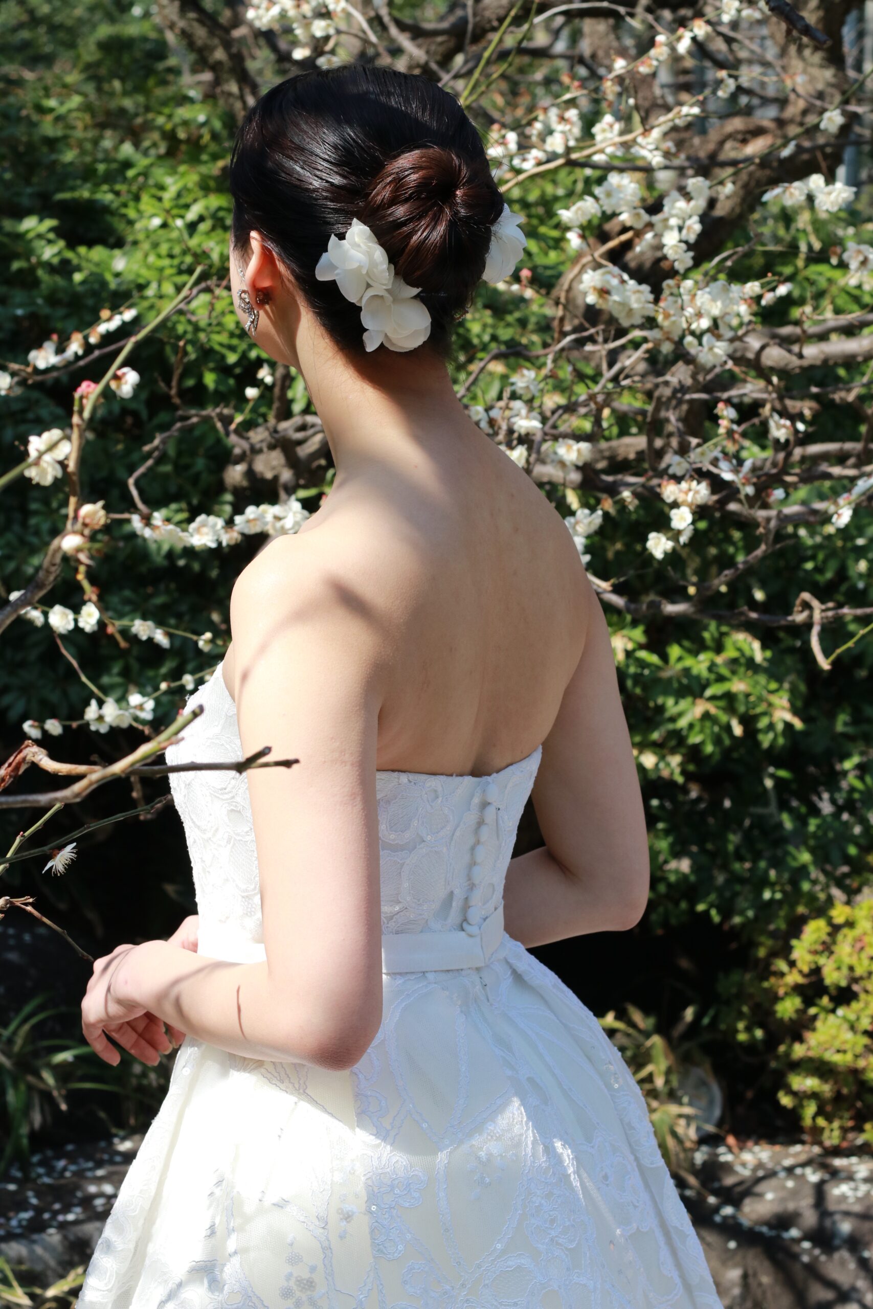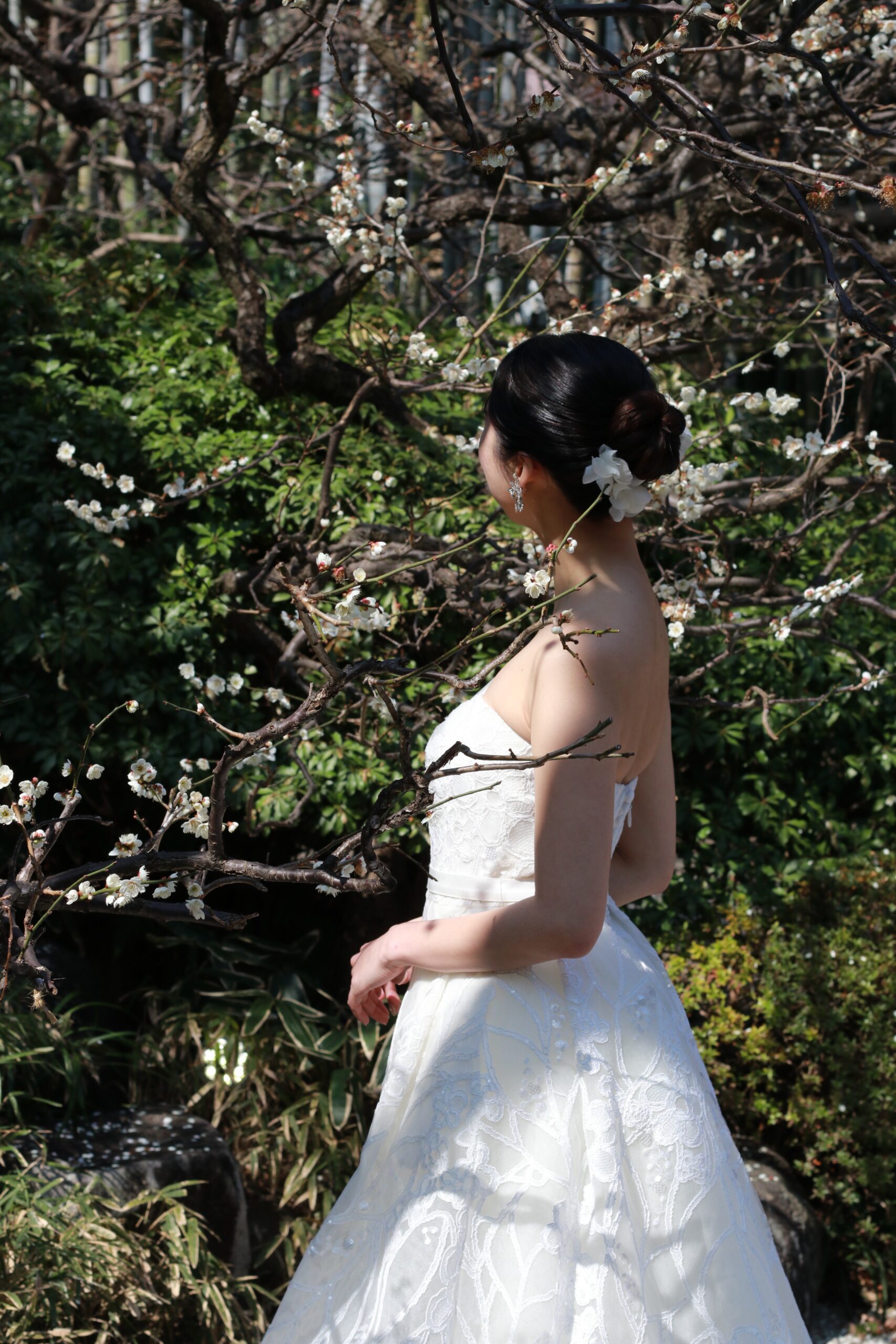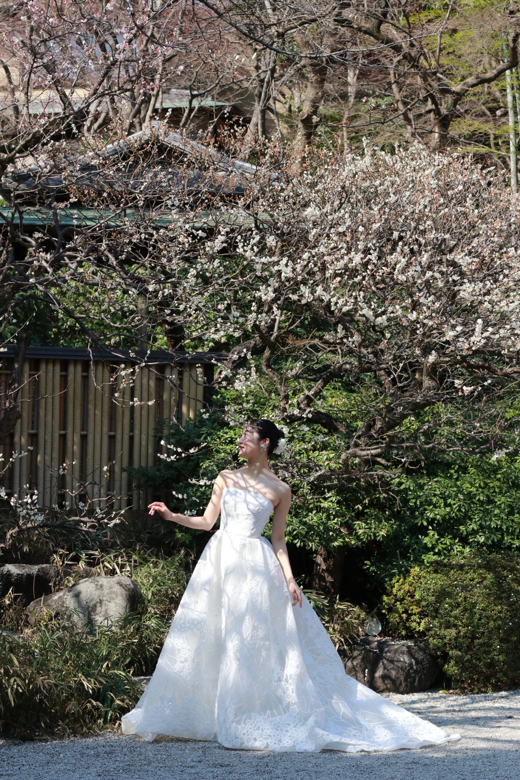 THE TREAT DRESSING ADDITION店の新提携結婚式会場八芳園におすすめのELIE SAAB BRIDEのウェディングドレスは自然光溢れる八芳園に映えます