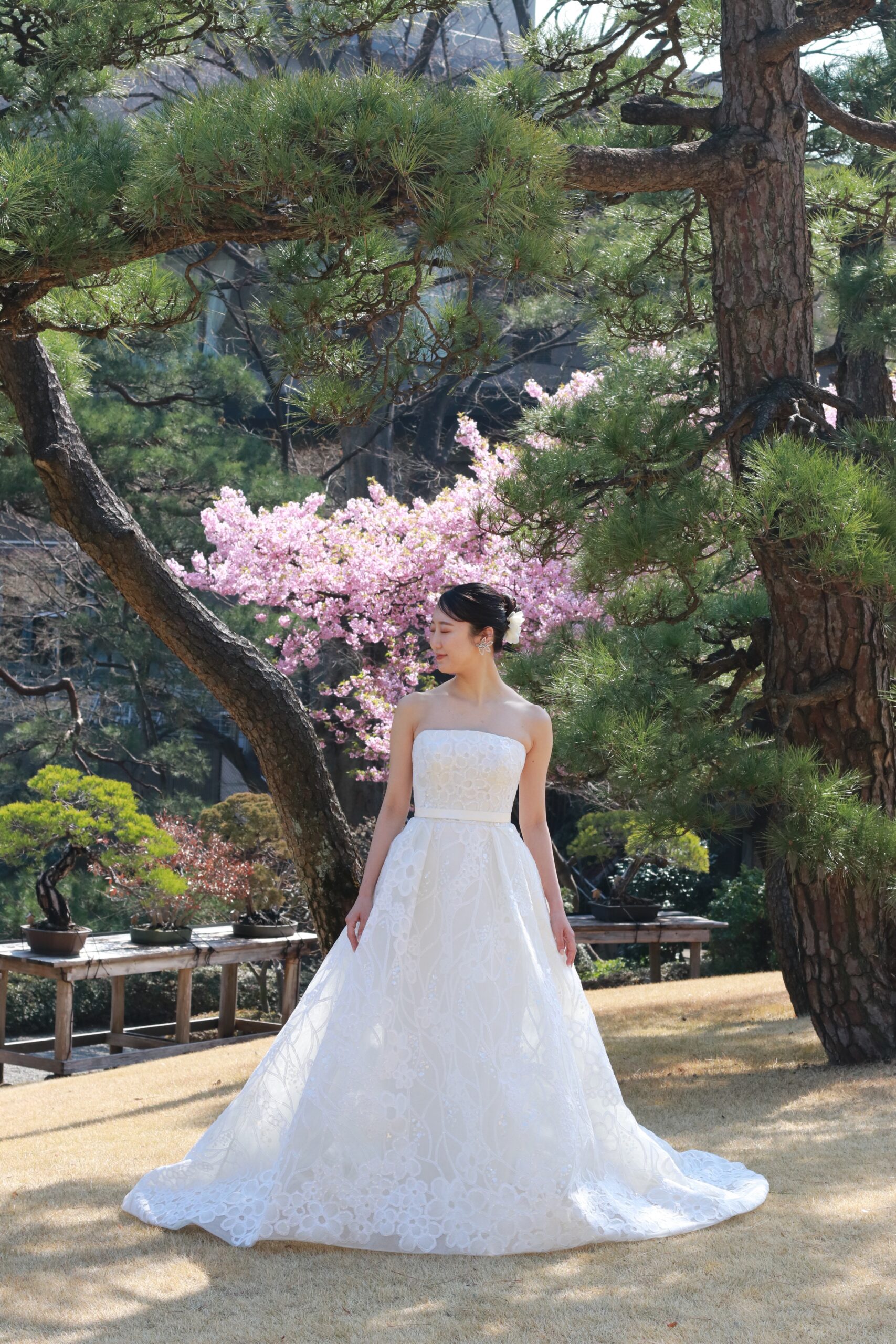 春への移ろいを感じる八芳園の美しい庭園とともに、ELIE SAAB BRIDAL(エリー サーブ ブライダル)のウェディングドレスが生み出す幸福感溢れる世界をご堪能ください。