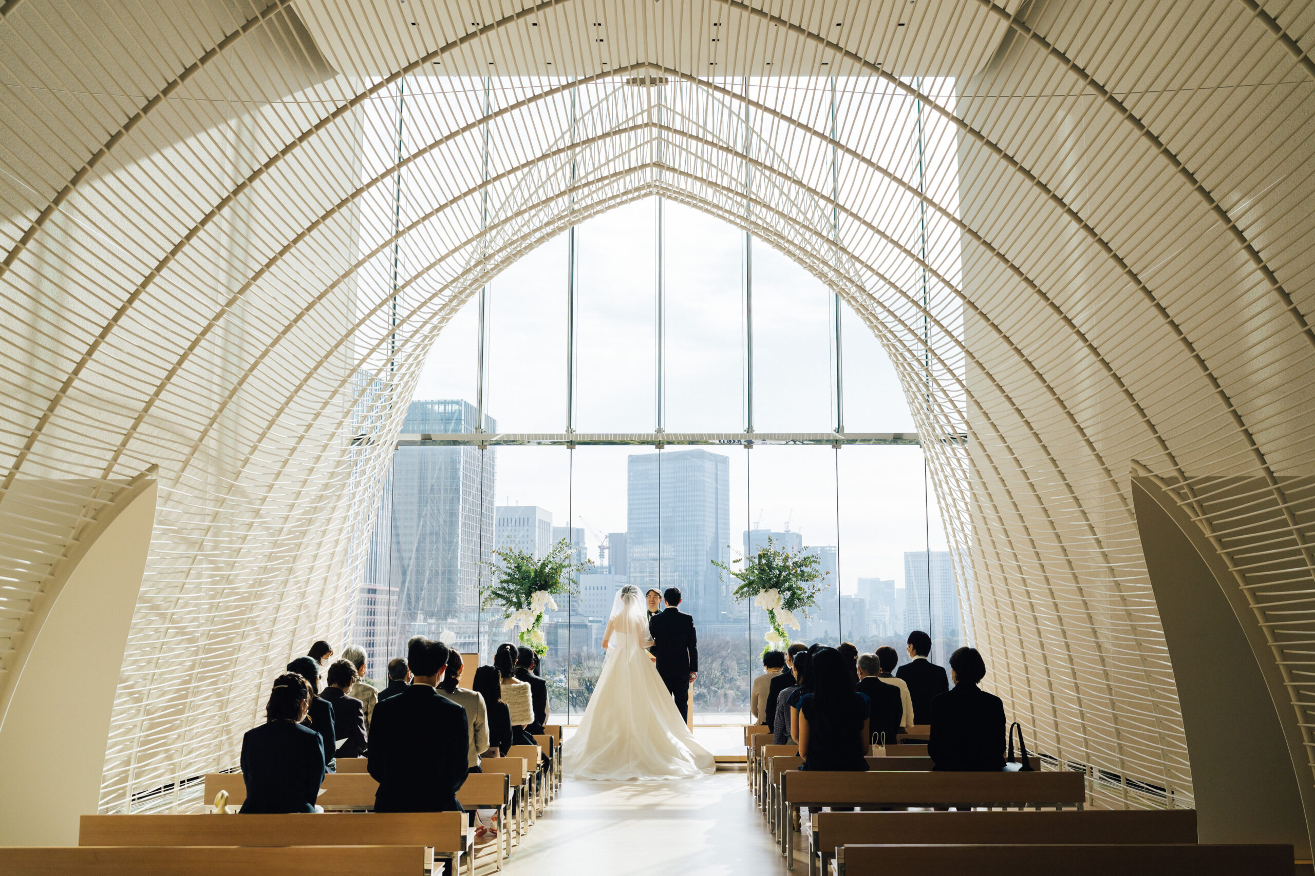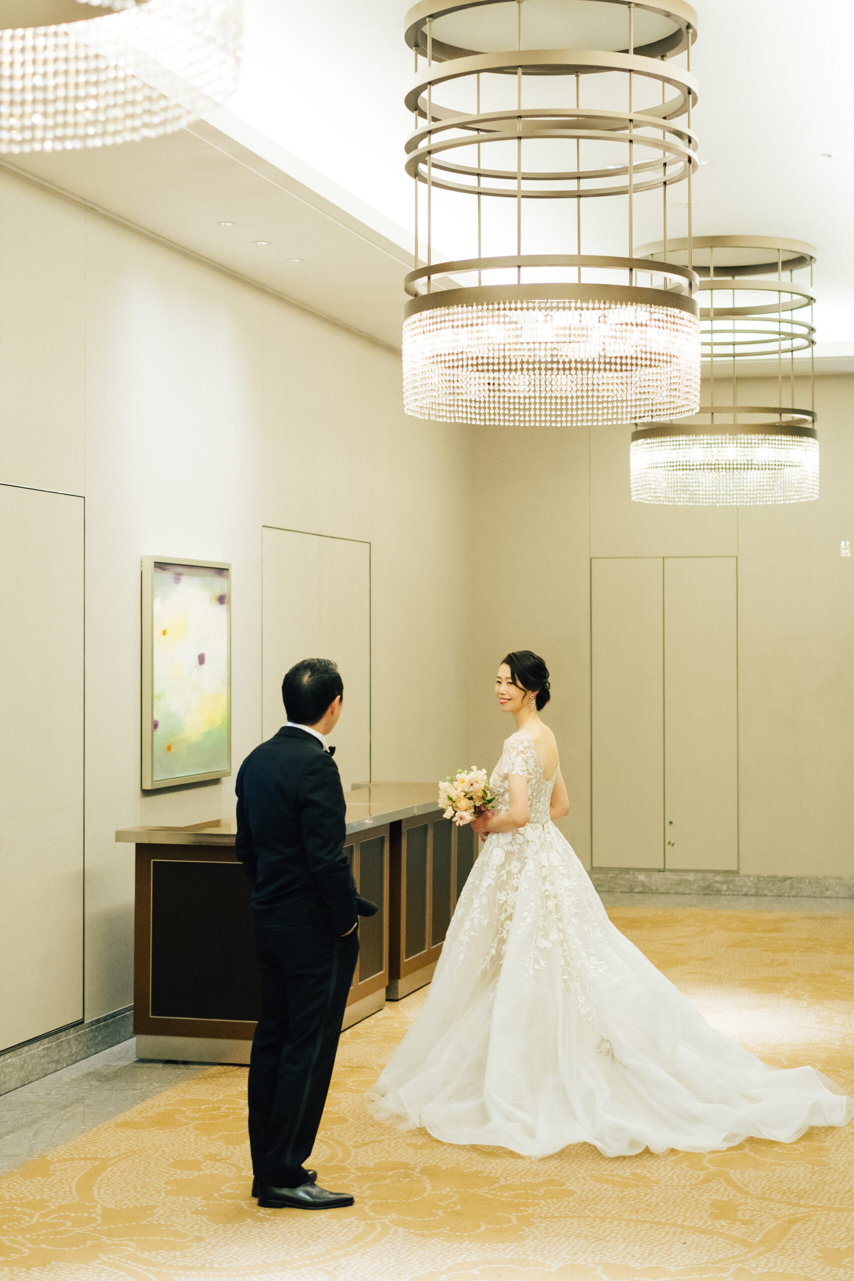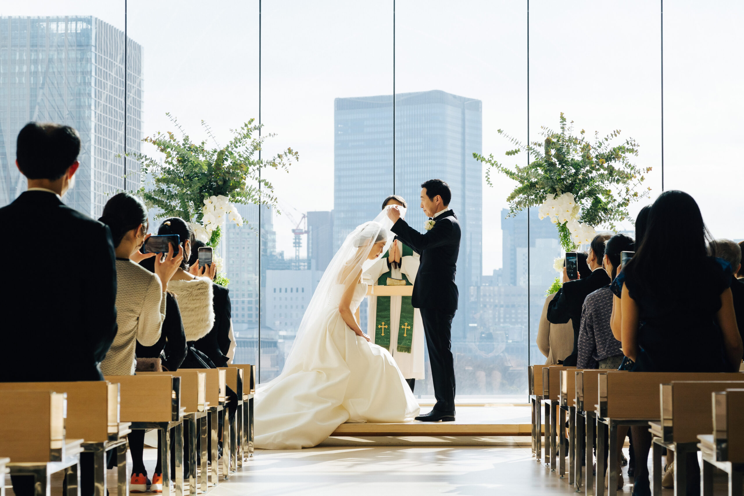 パレスホテル東京のチャペルには、幸せなひとときを迎えるご新郎ご新婦様を包みこむ柔らかな光が溢れ、お二人の先には広大な緑が広がります。ELIE SAAB BRIDAL(エリー サーブ ブライダル)のクラシックなウェディングドレスに身を包み、迎える結婚式。上質なミカドシルクとプリンセスラインのシルエットが生み出すクラシックなウェディングドレス。最高級のミカドシルクはパレスホテル東京のチャペルに注ぐ自然光により、より一層美しくオーラを放つのです。胸元にはまるで花が開くかのようにあしらわれた美しいドレープ、そして緻密に計算され広がるトレーンは柔らかな女性らしさを生み出します。最高品質の素材を用いて細部の仕立てにまで丁寧にこだわり、職人の手作業により時間をかけて生み出された本物のウェディングドレス。花嫁が持つ真の美しさを引き出し、輝かせるELIE SAAB BRIDAL(エリー サーブ ブライダル)のウェディングドレスは、気品と優しさに溢れる美しいご新婦様にとってまさに運命の一着でした。艶っとタイトにまとめたシニヨン、耳元にはパールを合わせたエレガントでクラシックなコーディネートは、ご新婦様の凛とした美しさをさらに引き立たせます。そこには、時代を超えて輝く花嫁のタイムレスなブライズスタイルがあったのです。