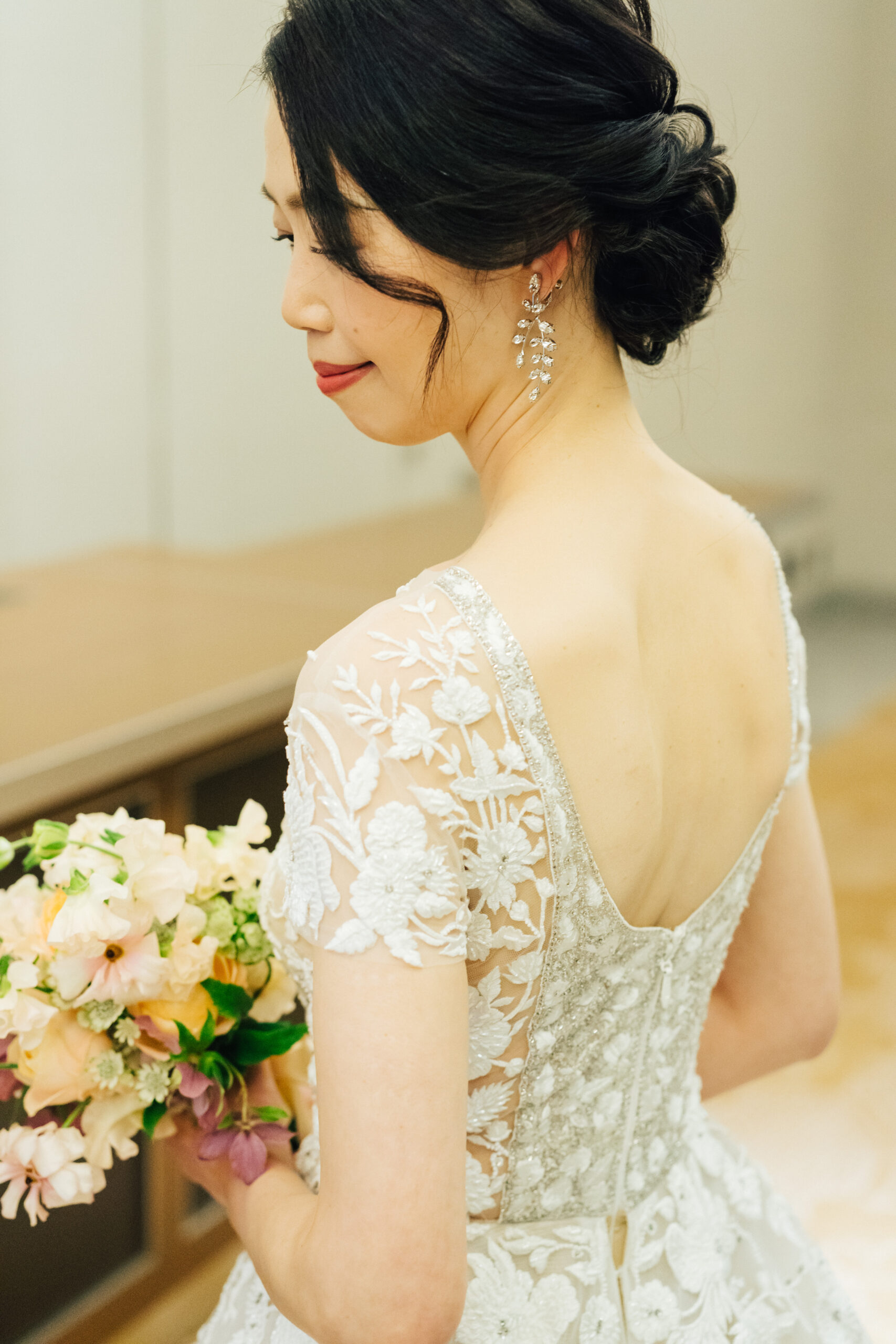 “結婚式を通して、家族に幸せな会話が増えてほしい。振り返った時に皆が幸せで笑顔になれるような一日にしたい。” そう涙ながらに話してくださった初回のフィッティング。お二人にとって大切な一日を、心に残る特別な一日にするお手伝いがしたいと強く感じたことを今でも覚えています。挙式を終え、どこかリラックスされたお二人。披露宴からはご新婦様の自然体な美しさを引き立たせることができるよう、緩やかなローポニーに動きのあるゴールドのパールのイヤリングをセレクト。大切な皆様と笑顔を交わしながら、今までのかけがえのない思い出と素晴らしい未来を語り合ったひとときの思い出は、これから先のお二人とご家族を優しく包み込んでくれることでしょう。