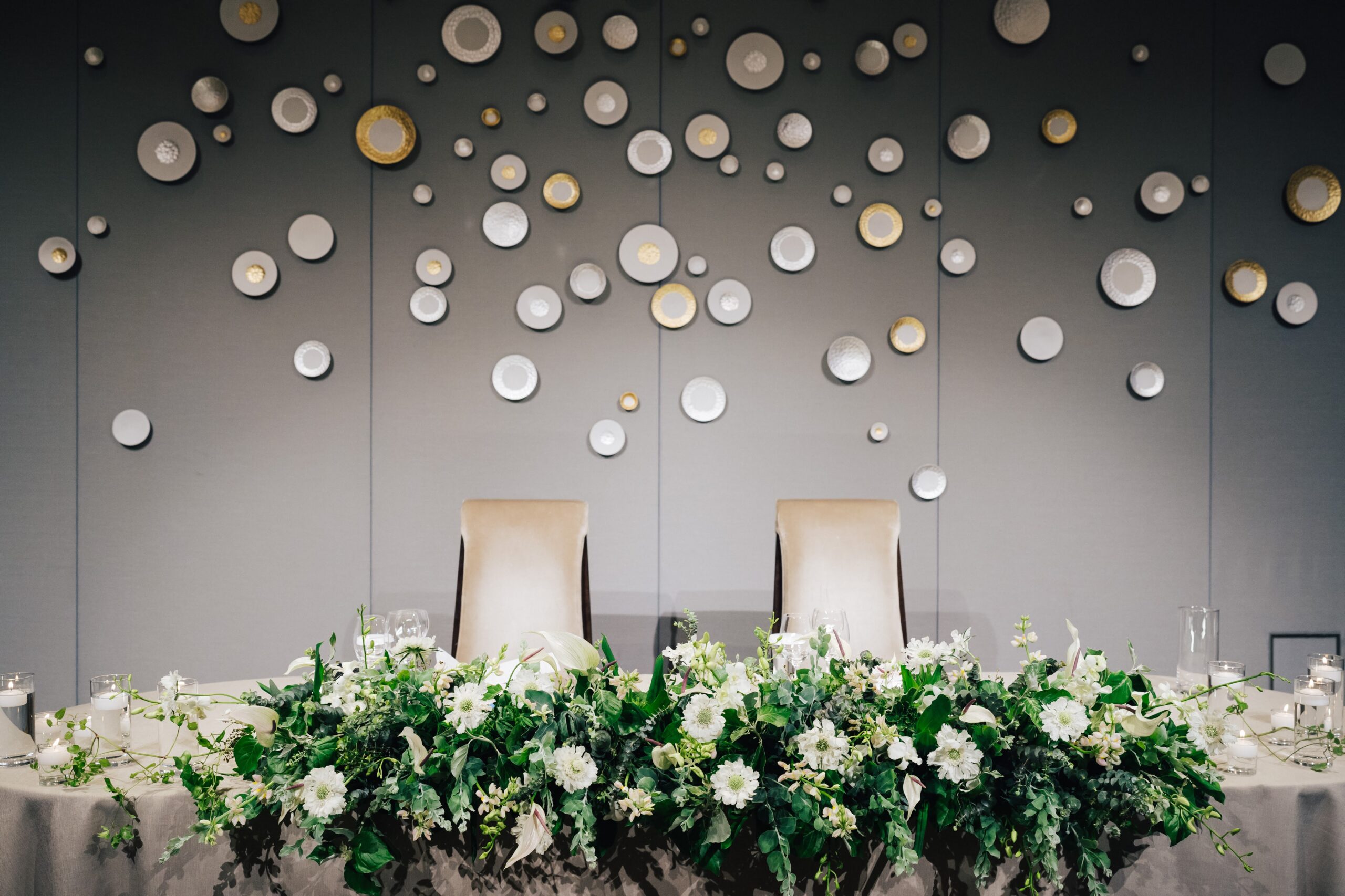お二人がゲストの皆様へのおもてなしの場として選ばれたのは、リニューアルしたばかりの山吹の披露宴会場。エレガンスなグレーを基調とした空間に、和田倉濠を望む専用のホワイエの窓から自然光が降り注ぐ、自然との調和を体現した会場です。メインバックのアートワークは、山吹の形をガラス細工で表現しており、お二人のお席を華やかに演出いたします。