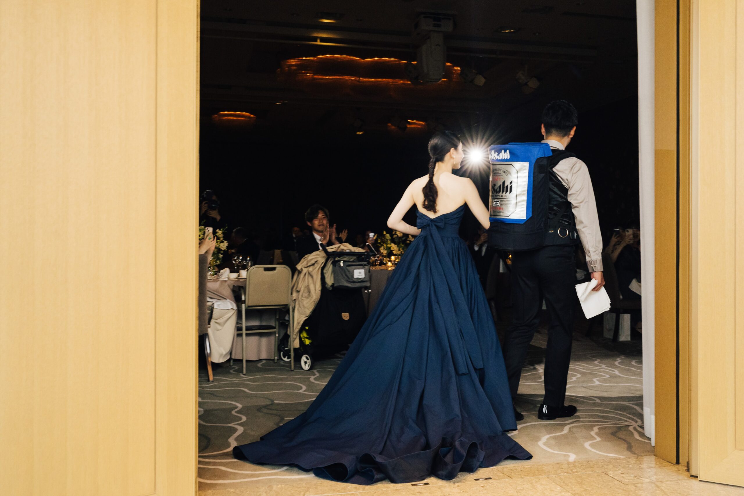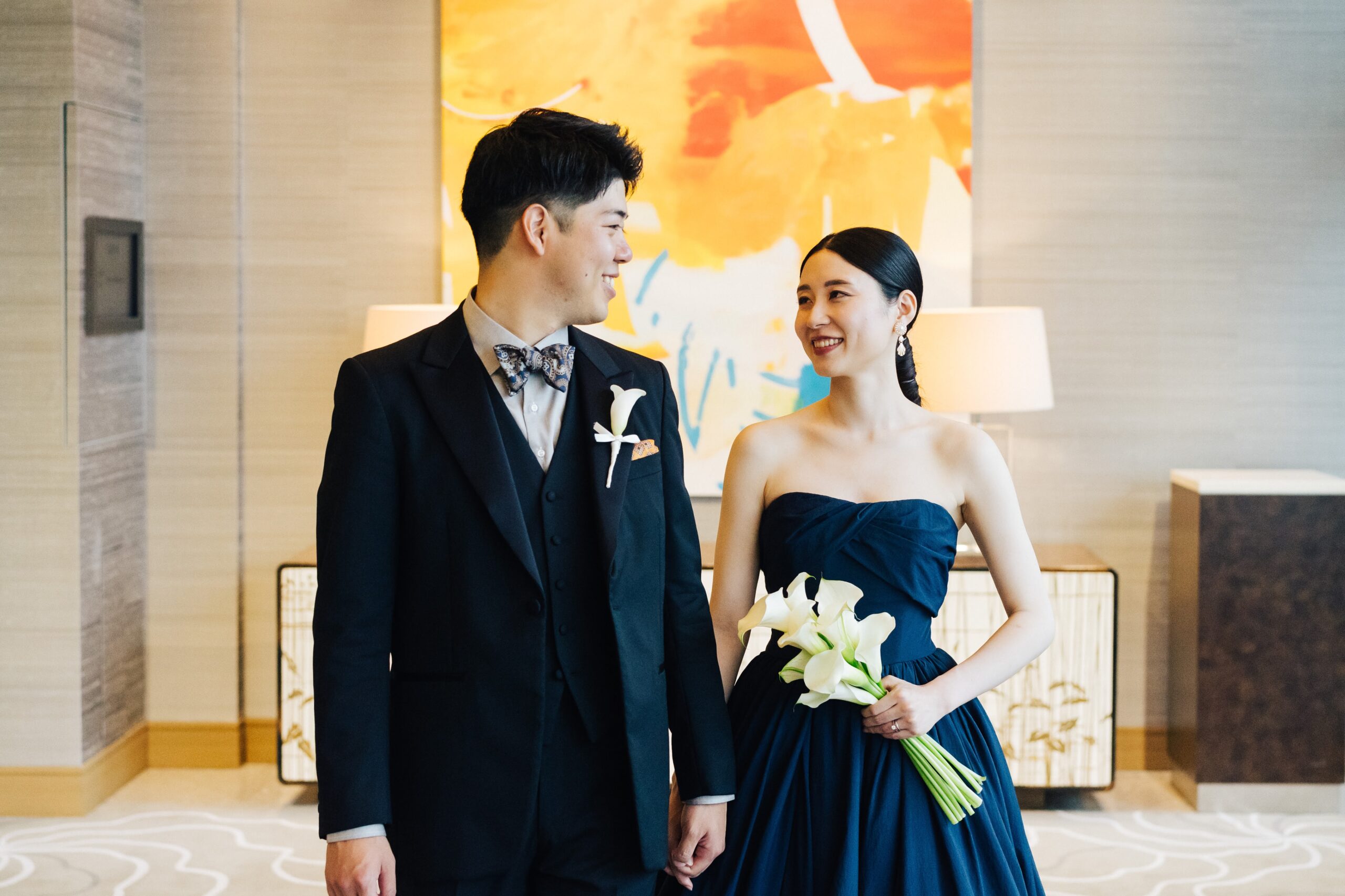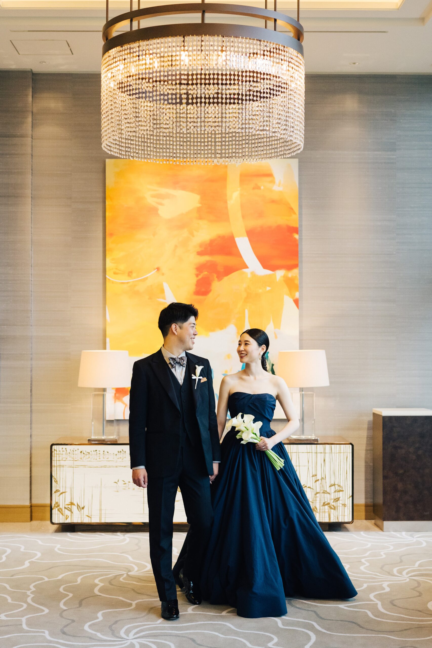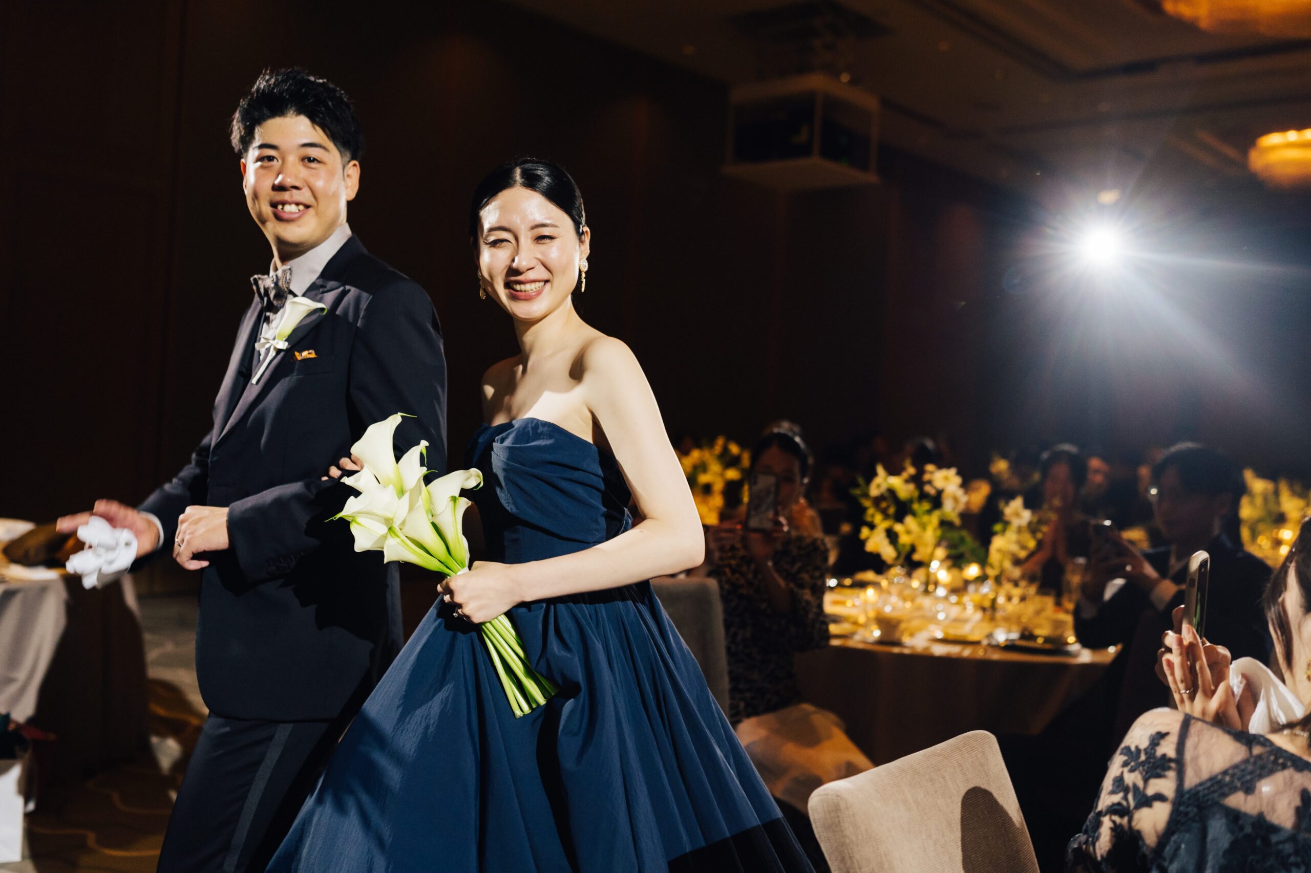 お色直しはザ トリート ドレッシングのアトリエから誕生したオリジナルブランド、TREAT MAISON(トリート メゾン)のネイビーのカラードレスをお選びいただきました。マットなタフタ素材がサテンとは異なる洗練された軽やかさを演出いたします。絶妙なローウェスト切り替えがウェストカーブを美しく見せながら、たっぷりと生地を使用したギャザーによるスカートのボリュームがドラマティックな印象に…。深いネイビーの色味がご新婦様の肌をより一層明るく魅せます。ご新郎様も小物で着こなしをチェンジして、お二人のトータルコーディネートが完成いたしました。お二人揃ってダークトーンのコーディネートは高貴な印象になり、高身長なお二人に大変お似合いでした。