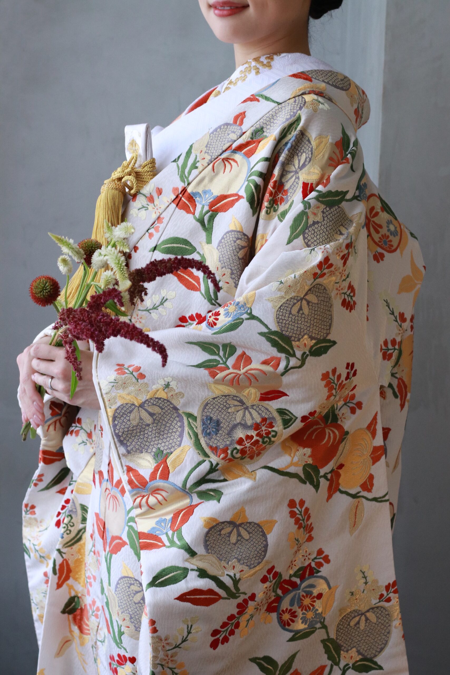 胸元のお小物と半衿は、明るい白色と金色に統一し、華やかさを出しつつも、色打掛の美しい柄行が引き立つような色合わせに。重衿には、差し色として鮮やかな橙色を合わせ、たおやかな雰囲気の中にも凛としたアクセントを。柔和なシャンパンゴールドと朱色が目を惹くお草履を合わせ、深みのあるコーディネートに。お手元には、秋の深まりを感じる色味の花々を添えました。少しのモダンさを感じながら、長年愛される和装本来の美しさを引き立たせる佇まいは、目にする全ての方を魅了することでしょう。