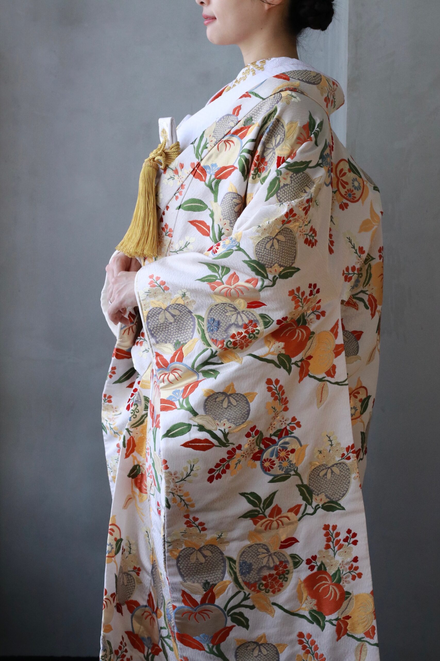 ザトリートドレッシングアディション店の白地に橘とからの柄が美しい色打掛に金色の小物と半衿を合わせた華やかなコーディネート