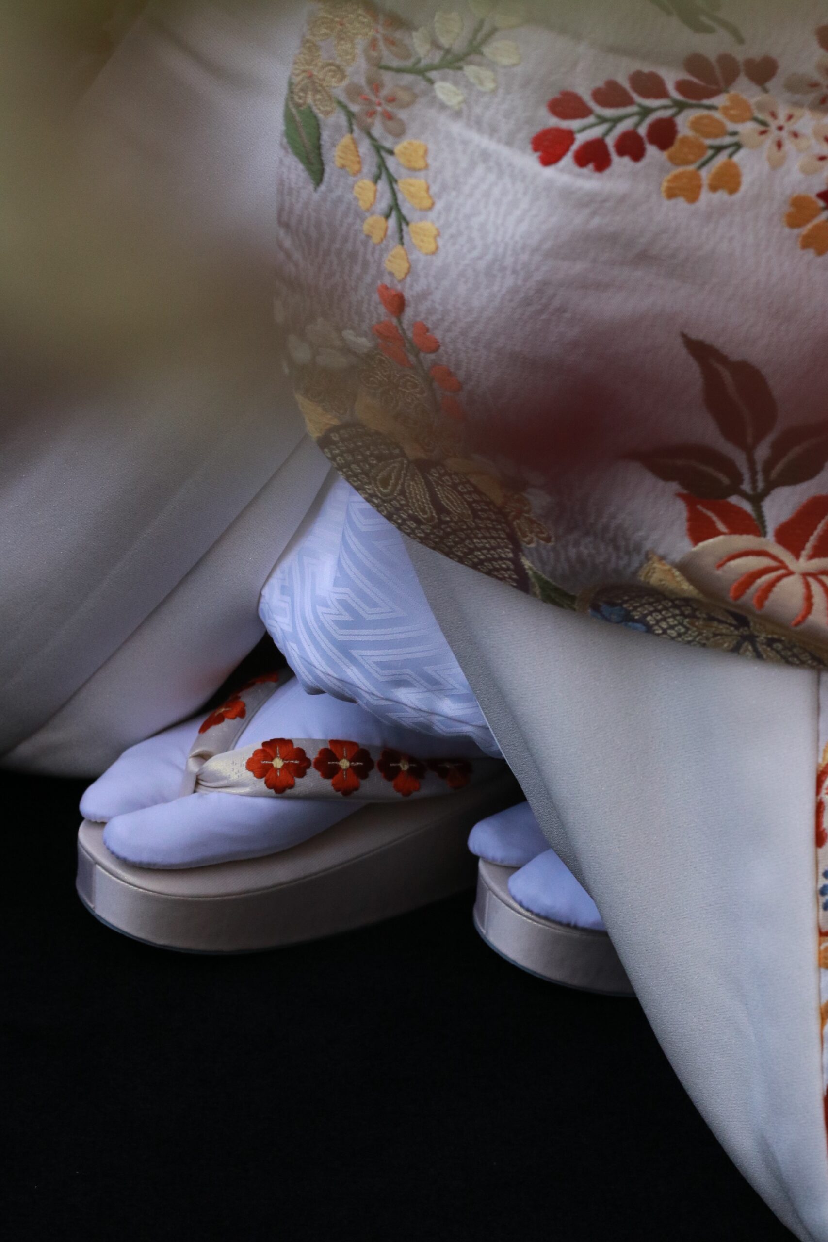 白地の色打掛の足元にはゴールドに朱色の刺繍が美しい草履を合わせるのがおすすめです