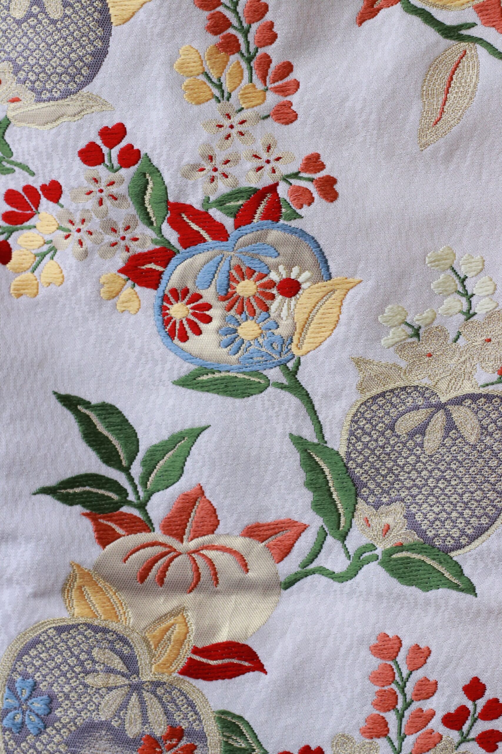 明るく澄んだ白色の地に、彩られた橘と桐の花。暖色を基調としながら、アクセントとして藤色や御空(みそら)色で描かれ、凛とした雰囲気の白地と相まって、上品な印象とともに可憐さを与えます。