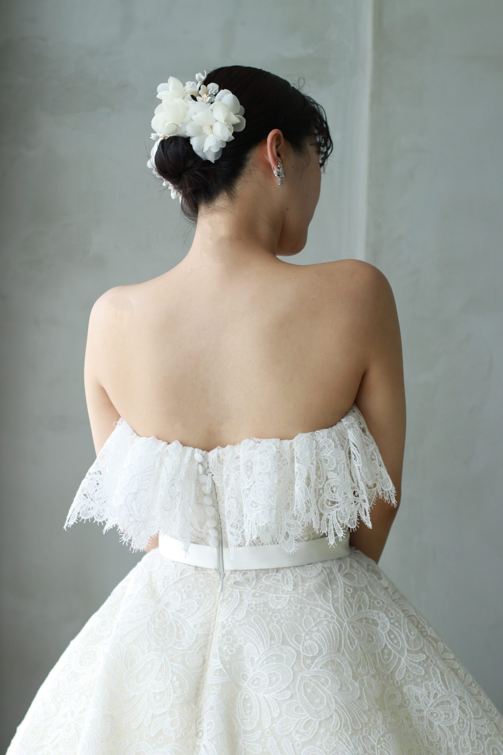 その中でも今回ご紹介するこちらのウェディングドレスは、上質なシルクで編まれた糸が織りなすマクラメレースが繊細かつダイナミックな印象を生む一着です。光がドレスに差し込むとその幾何学模様が瞬く間に浮かび上がり、見る人の視線を惹きつけることでしょう。触れることも躊躇ってしまうくらい繊細で透明感が溢れ、それでいて圧倒的な存在感を放つ華やかさとのバランスはエリー サーブ ブライダルのクチュリエたちの巧みの技です。胸元にはスカートと同じマクラメレースを重ねて、まるで花が開く瞬間を表現したかのようなラッフルのデザインが施されています。ウェディングドレスを纏った花嫁が動くたびにふわっと舞うラッフルのデザインは、優美さを感じさせます。ダイナミックなレースでありながらも柔らかさを感じさせるのは上質なシルクをふんだんに使用しているからこそ。柔らかな光の中に佇む花嫁姿は、言葉では言い表せない感動とときめきにつつまれます。前髪はふわっと軽やかな巻きを加え、バックはタイトなシニヨンに。そこにオーガンジーを重ねてつくられたフラワーのヘッドパーツや本物のフラワーをそのまま模したようなモチーフを添えたコーディネートで過ごしてみてはいかがでしょうか。