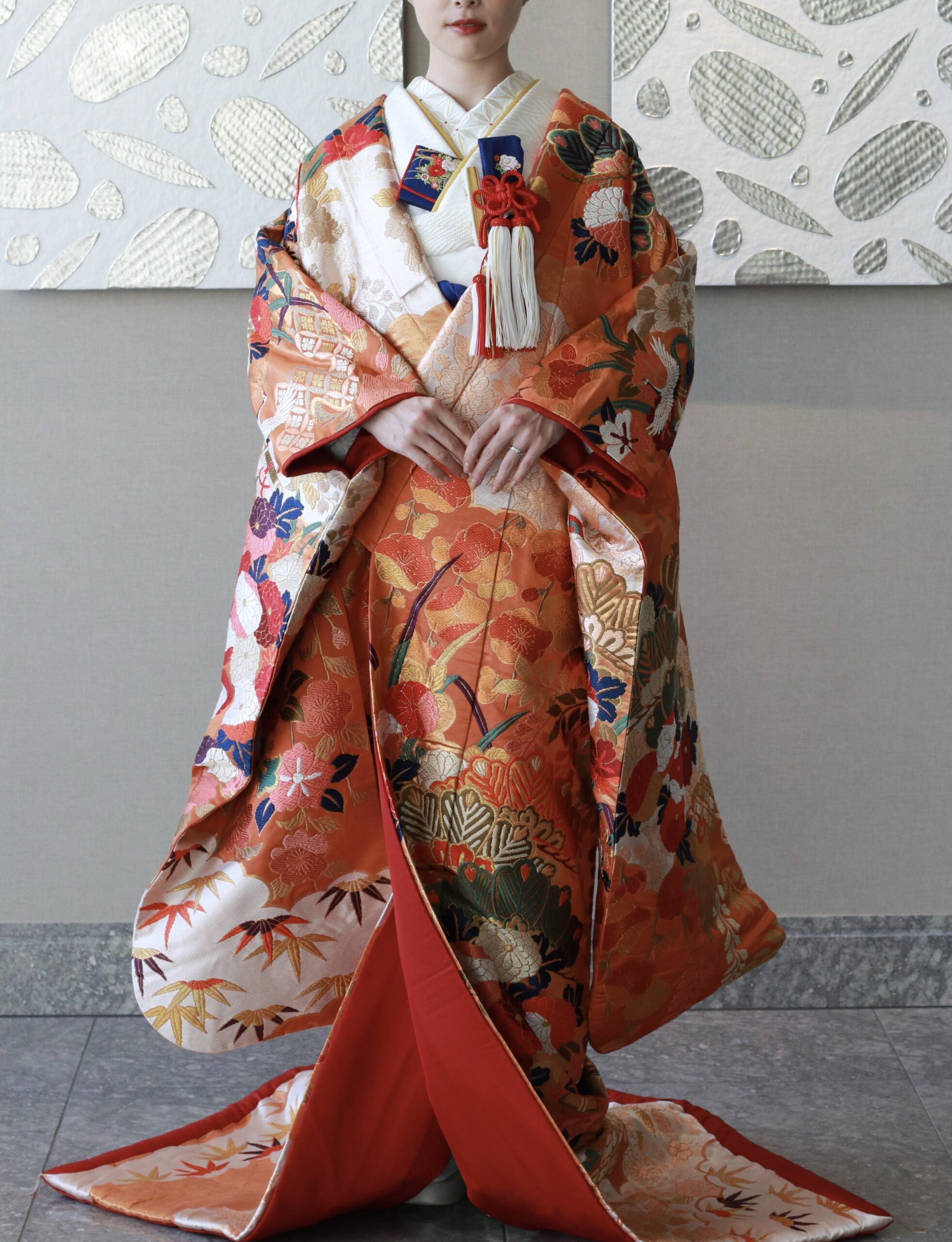 ザトリートドレッシングアディション店が提携しているパレスホテル東京にて結婚式をあげられる花嫁にご紹介したい華やかでありながらも女性らしい柔らかさを感じさせる朱赤のレンタル色打掛のご紹介