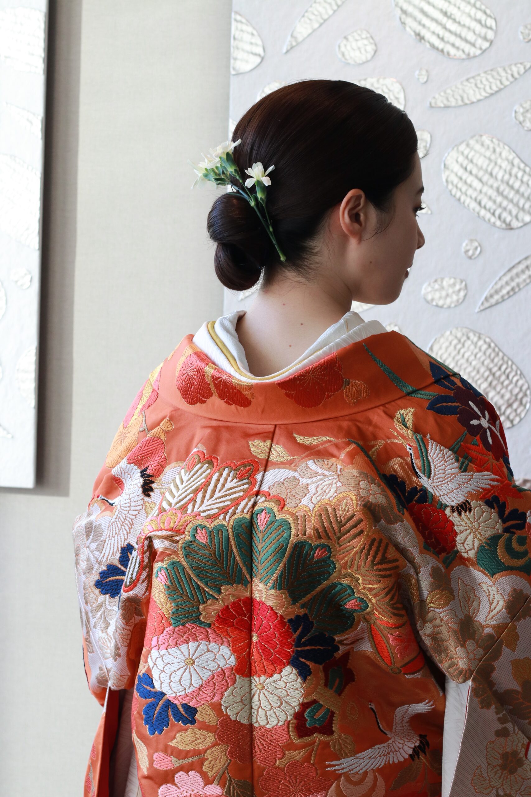 さらには刺繍と間違われるほどに、糸の盛り上がりによる立体感を織物表面に浮かせて織りあげる唐織ならではのふっくらした存在感は、格調高くもどこか優しさを感じさせます。色彩豊かで重厚な雰囲気が最大の特徴であり、天井高や広さのある式場などにも映える絢爛豪華な色打掛なのです。まさにアディション店が提携している東京エリアのラグジュアリーホテル、パレスホテル東京や何百年という歴史をもつ庭園を構える八芳園にて花嫁におすすめしたい一着です。