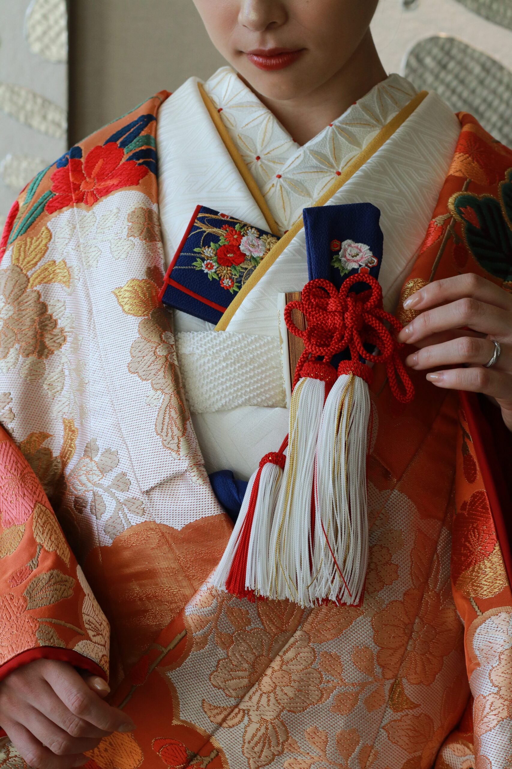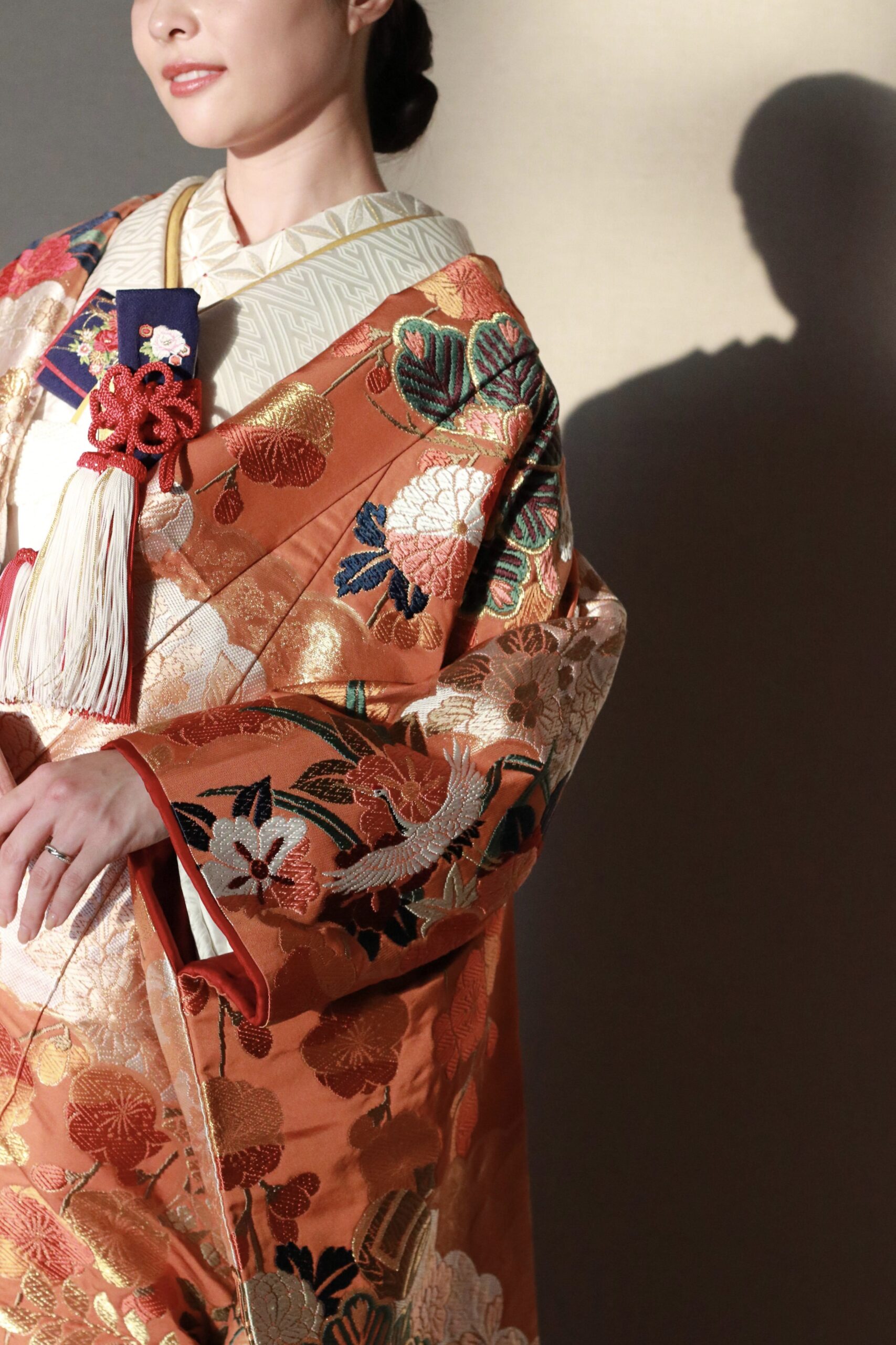 古典的な朱赤の色打掛には、和の伝統的な美しさを大切にしたコーディネートがおすすめです。色打掛の朱赤を引き立てるように胸元に差し込まれた花嫁道具である懐剣、箱迫は色打掛にも配色された群青色とを掛け合わせることで、まとまりのある古典的なコーディネートへと導きます。お顔周りは、黄色の重衿を添えて明るく華やかな印象に仕上げました。遊びのあるコーディネートもモダンさがあり素敵ですが、時代を超えて愛される普遍的なコーディネートでお過ごしいただくのも素敵ですよね。色打掛は半衿や胸元の小物だけでなく、掛下や草履までお選びいただく小物ひとつで大きく印象を変えることができ、あなたが叶えたいコーディネートを楽しむことが可能です。色打掛に描かれた草花や鶴等の柄行を活かしながらも、色打掛ならではの小物遣いでコーディネートを楽しんでいただきたいのです。