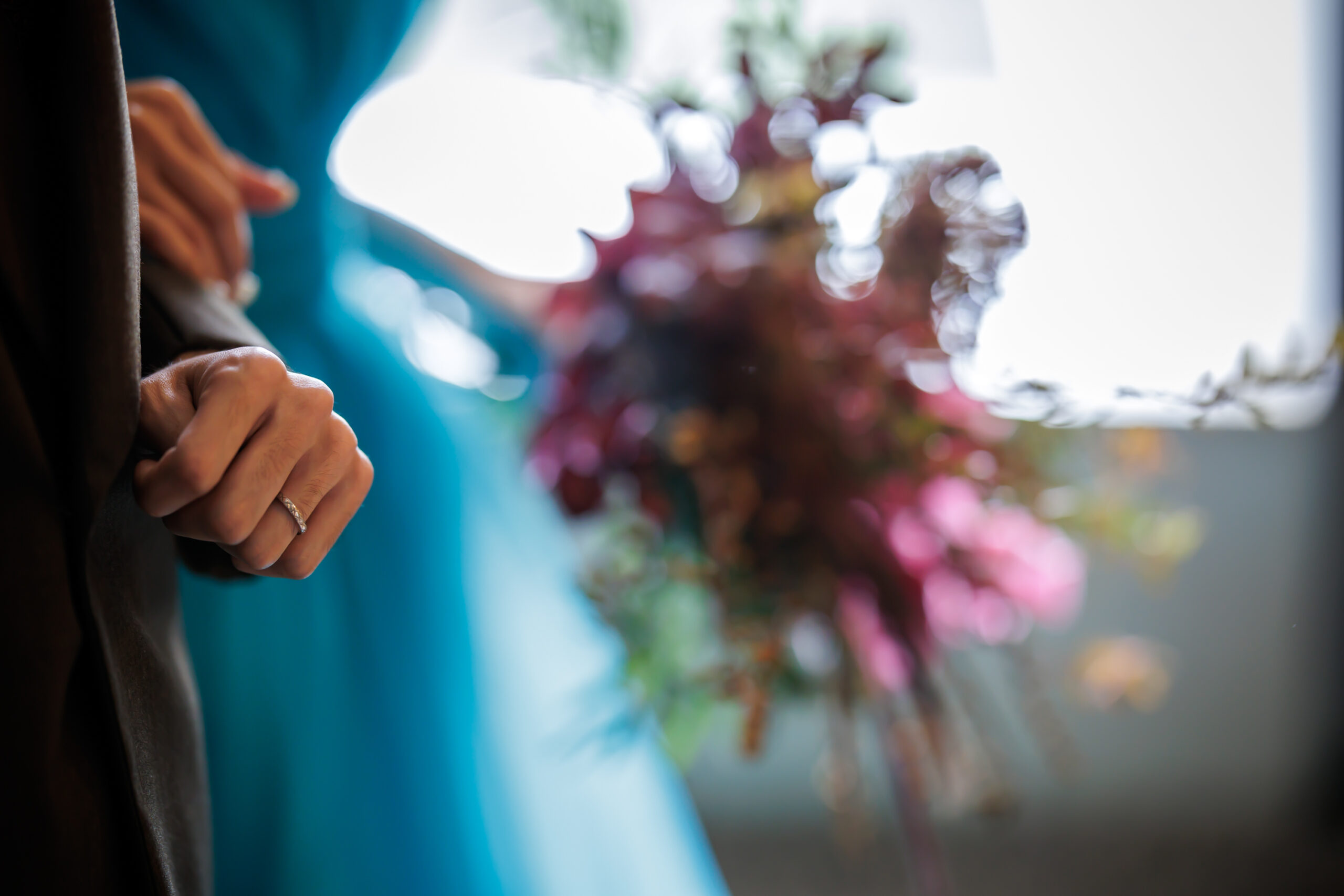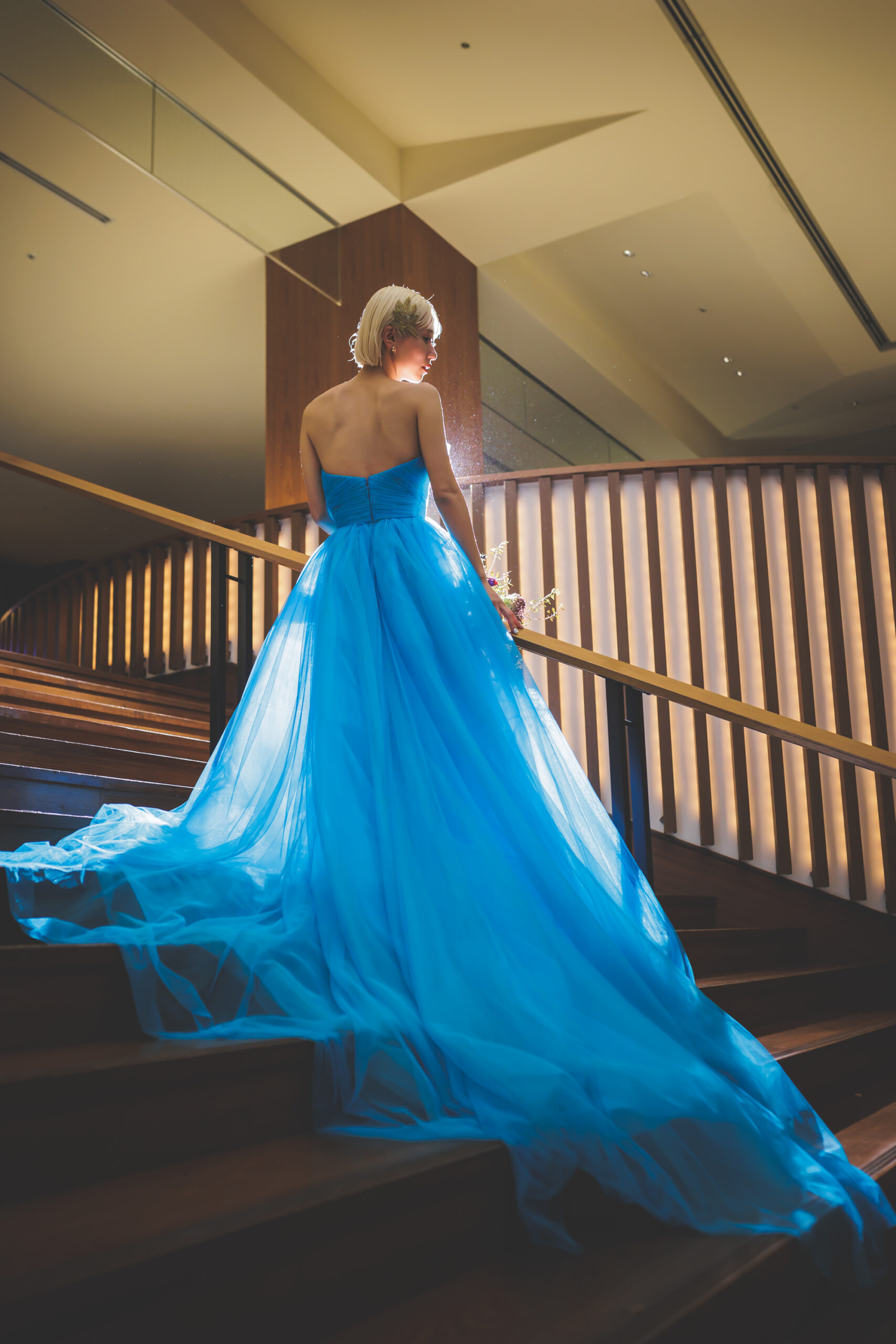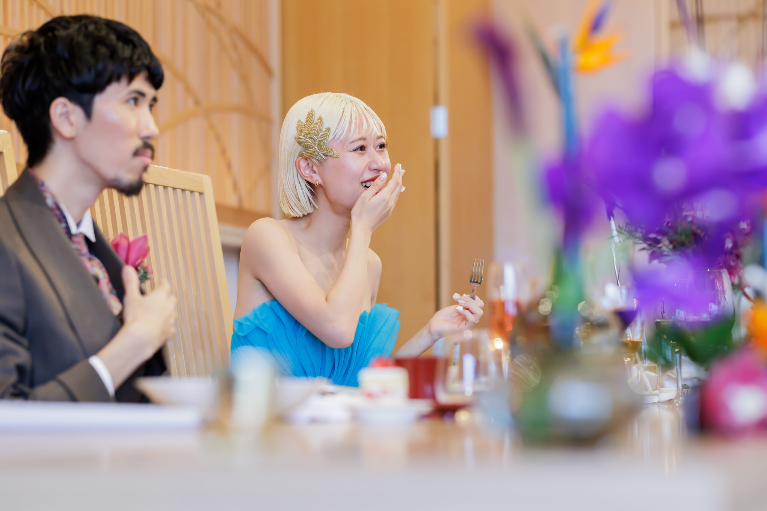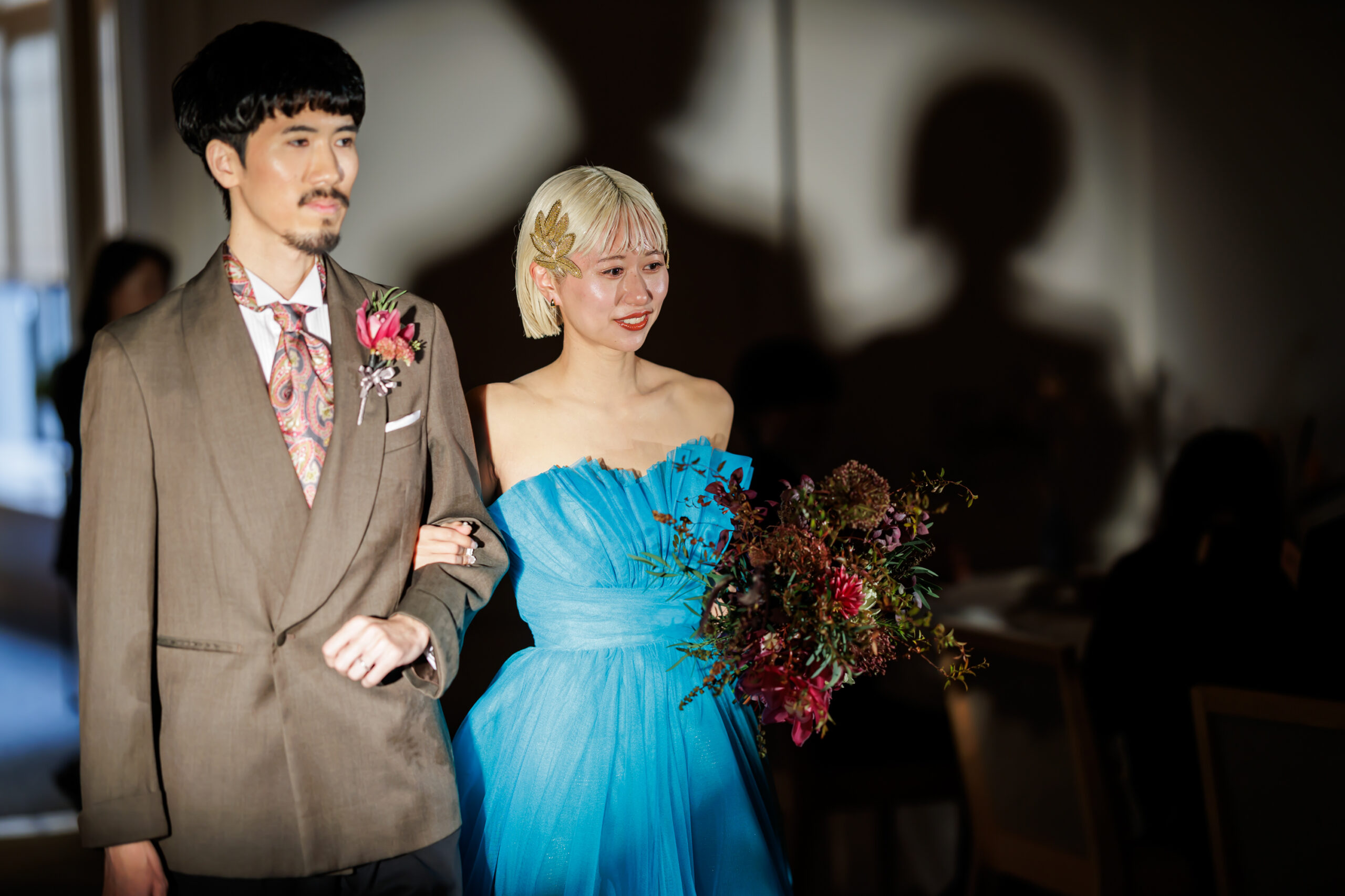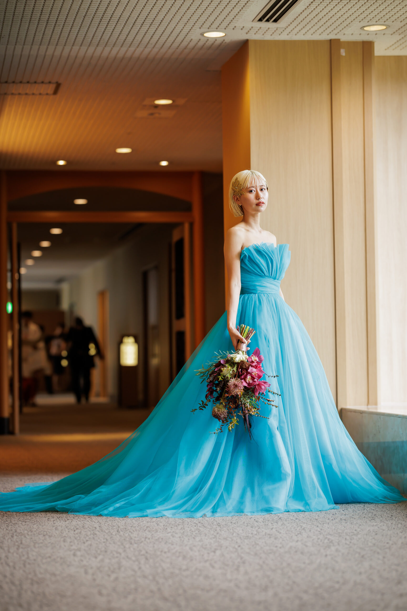 ご新婦様がお色直しにセレクトされたのは、ビビットなブルーのカラーが目を引くMonique Lhuillier(モニーク ルイリエ)のカラードレス。立体的な胸元のカッティングに引き締まったウエスト、腰元からふわりと立ち上がり足元にかけて柔らかなドレープが広がるプリンセスラインのシルエットは、ゴージャスで圧倒的な存在感を放ちます。ハイトーンのヘアカラーに、ご自身のスタイルを表現するハイセンスなファッションを楽しむご新婦様。実際にこちらのMonique Lhuillier(モニーク ルイリエ)のカラードレスを身に纏った際のオーラは格別でした。肌を美しく魅せる奥行きのあるブルーのチュールは、立体感を出す特別な縫製技術で仕立てることで一色で完成しているとは思えないほどの華やかさを叶えます。ドレスを纏い登場するご新婦様に降り注ぐ、自然光や華やかなスポットライトによって、シルエットの美しいスカートはより存在感を放つのです。お隣に並ぶご新郎様はセレモニーのTREAT Gentleman(トリート ジェントルマン)がセレクトするブラックタキシードから一変、お色直しではこなれ感のあるブラウンのジャケットにチェンジ。首元には、ご新婦様の持つブーケのカラーをスカーフでワンポイント加えました。八芳園ならではの上質さと暖かさを演出する柔らかなベージュを基調としたしつらえに、ビビットなブルーのカラーを合わせることで誰ともかぶることのない特別なブライズスタイルは完成しました。チュールでプリンセスラインのドレスでありながらも、甘すぎずトレンド感のあるロマンチックさを演出できるのは、世界中の女性たちを魅了するモニーク ルイリエだからこその特別な一着です。