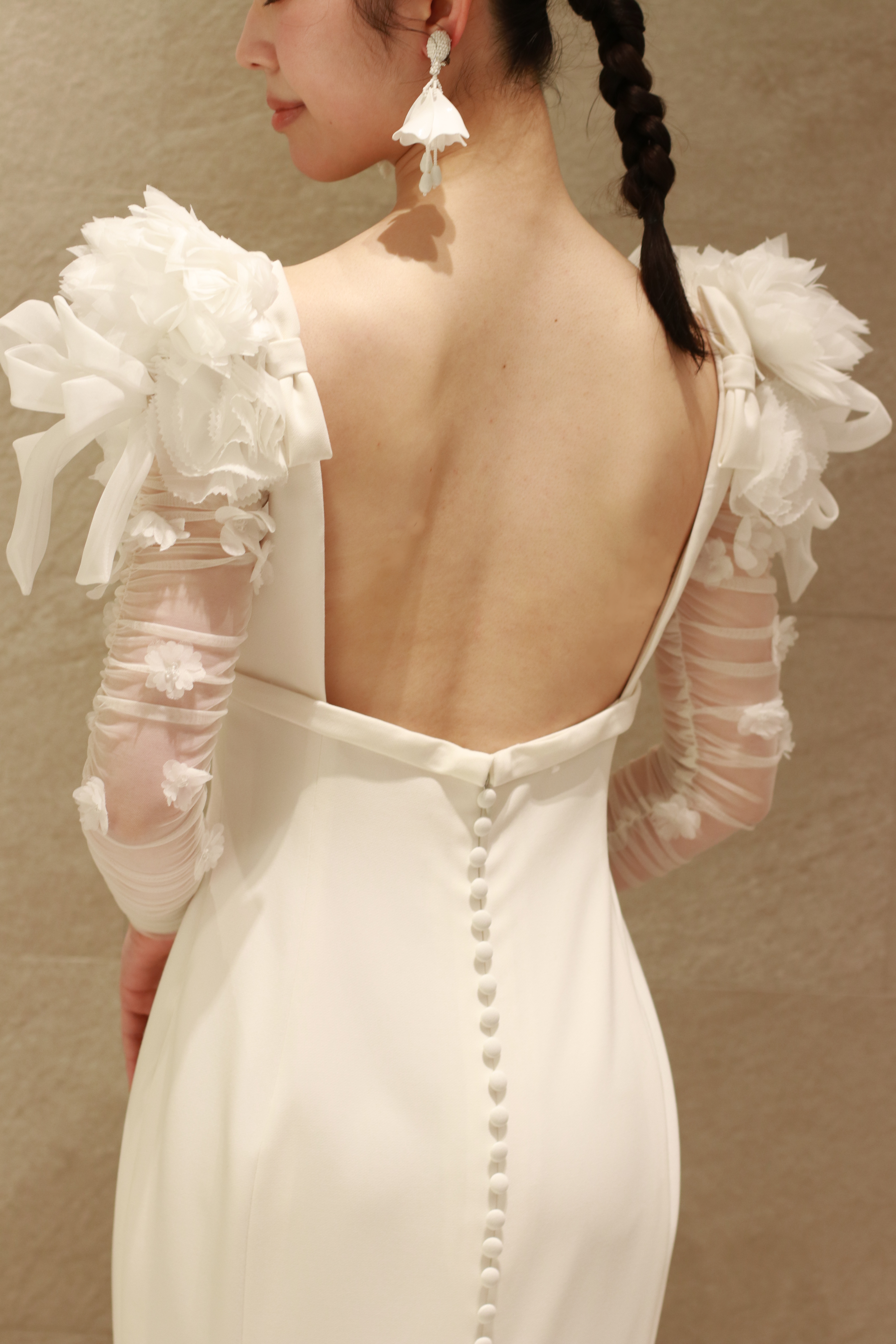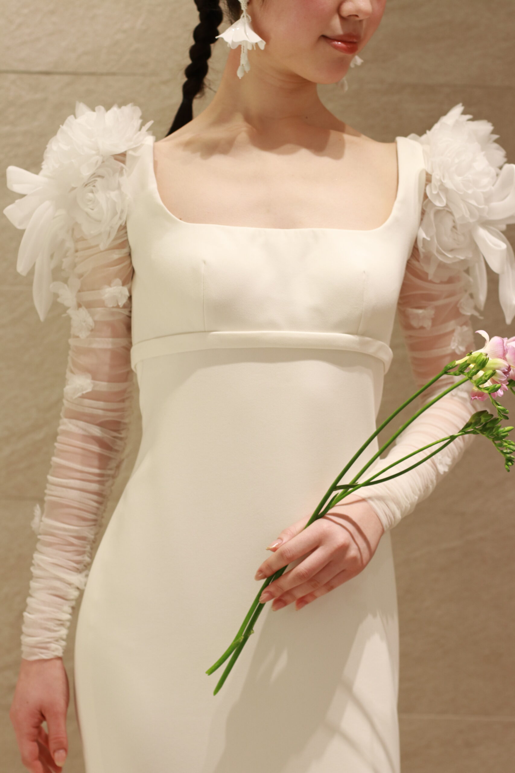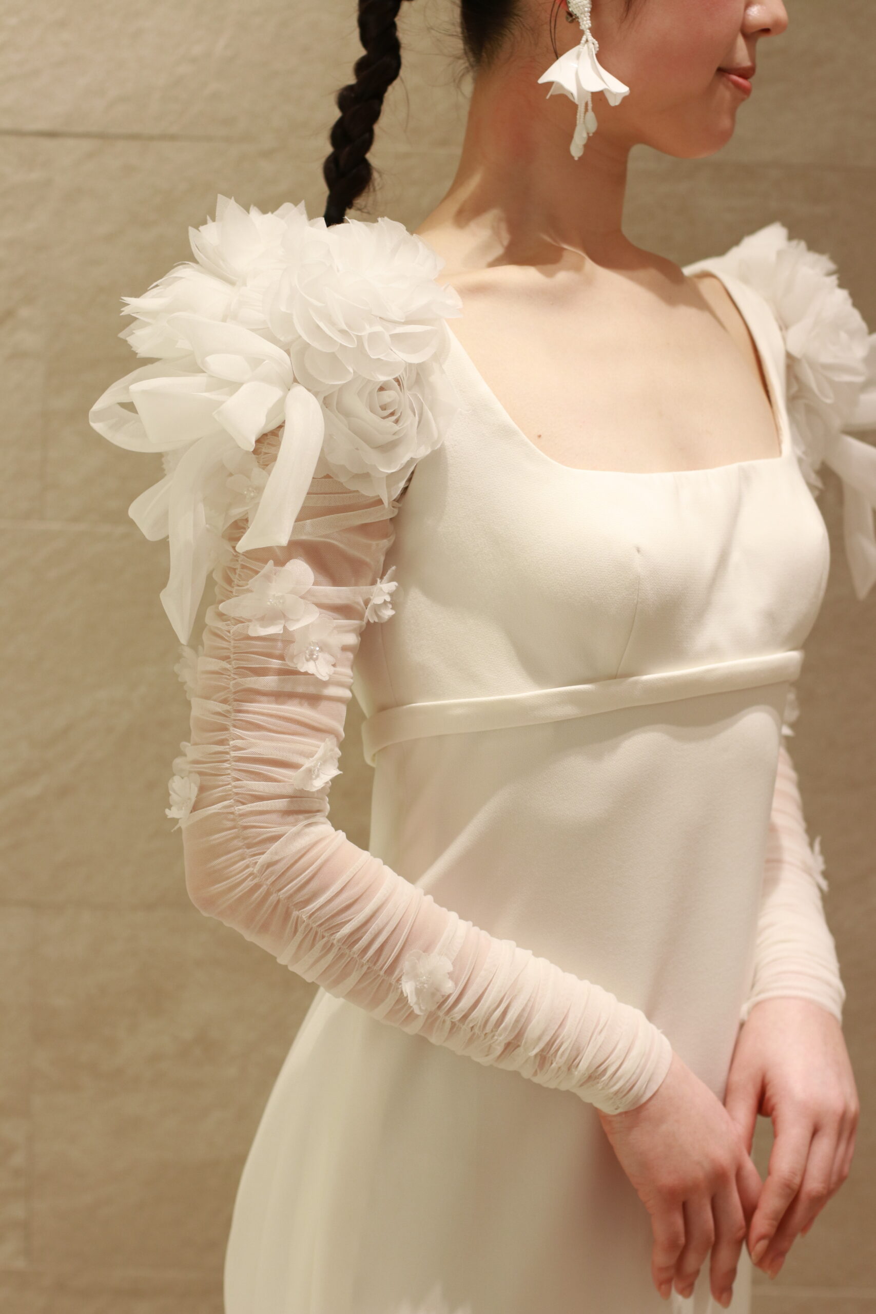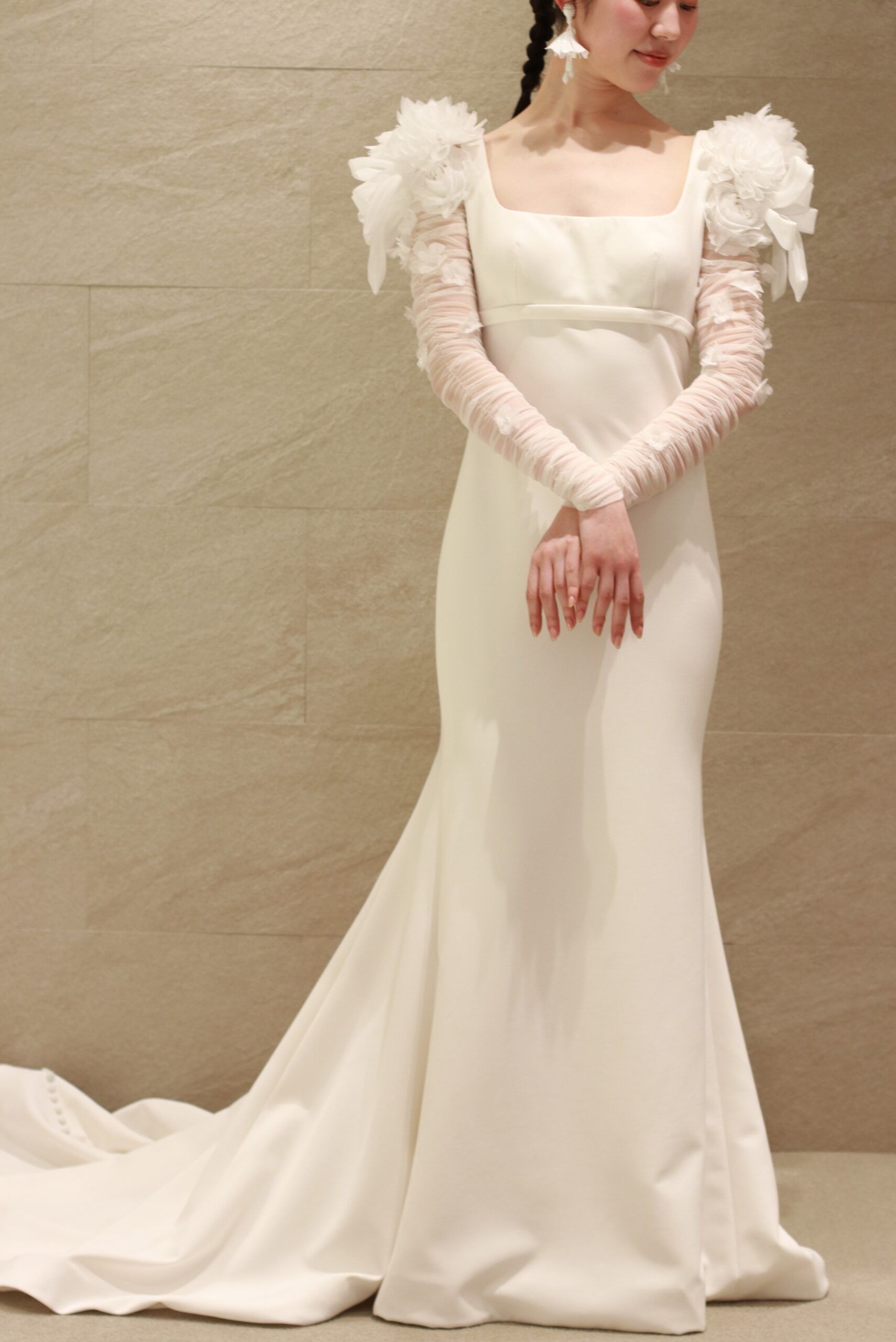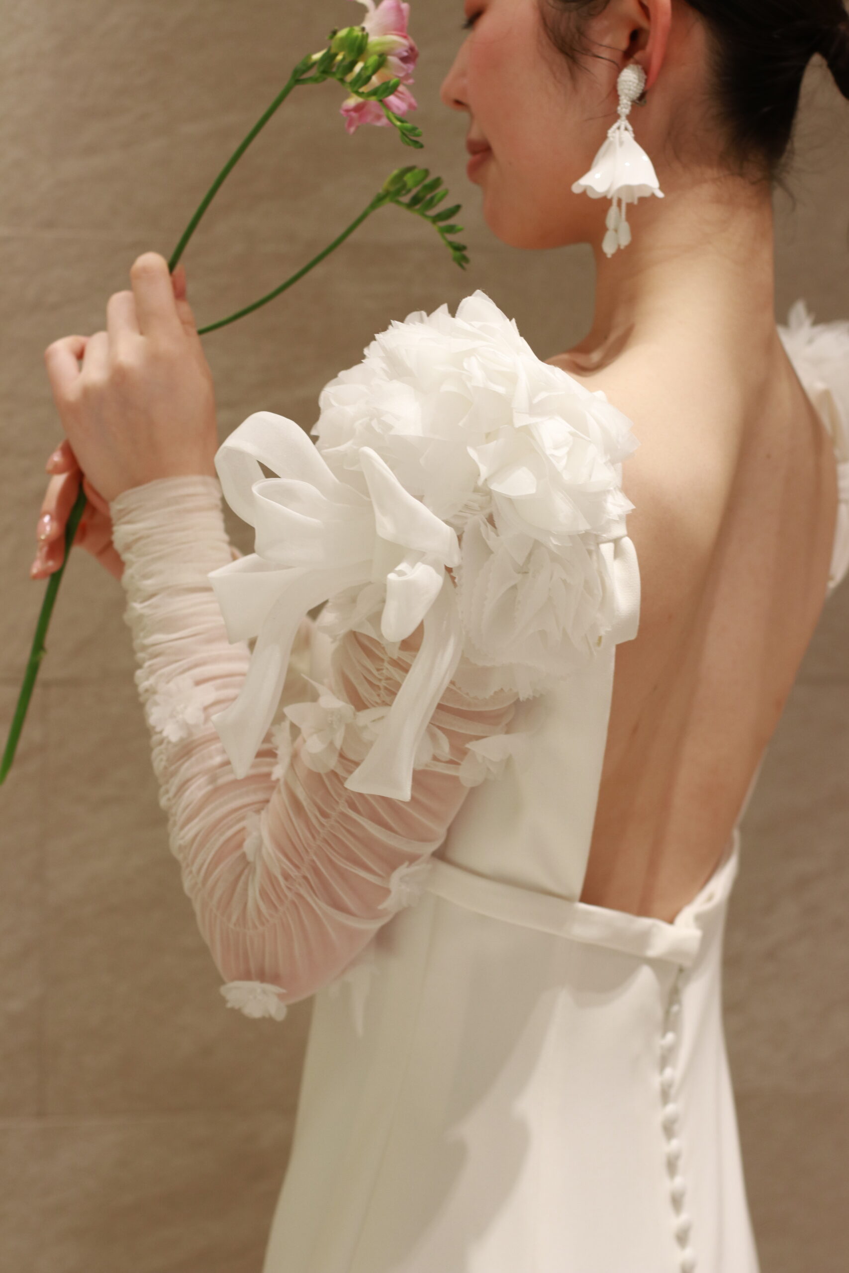 骨格ウェーブの花嫁におすすめのソフトマーメイドラインのウェディングドレスをご紹介いたします。VIKTOR&ROLF MARIAGE(ヴィクター アンド ロルフ マリアージュ)からご紹介する上半身が映えるウェディングドレスは、ヴィクター アンド ロルフ マリアージュらしいファッショナブルかつエレガントな一着。アートを愛する二人の男性デザイナーが手掛けるヴィクター アンド ロルフ マリアージュのウェディングドレスの数々は、ウェディング業界に新たな風を吹き込み続けています。そんなヴィクター アンド ロルフ マリアージュから、骨格ウェーブの花嫁におすすめするのは、上半身のフラワーモチーフが華やかに映えるソフトマーメイドラインのウェディングドレス。骨格ウェーブの華奢な上半身に映えるフラワーモチーフがふんだんに施されたウェディングドレスはヴィクター アンド ロルフ マリアージュらしいキャッチ―で目を惹くデザイン。透明感のあるオーガンジーと繊細なチュールで手掛けられた存在感のあるフラワーモチーフは、骨格ウェーブの花嫁の柔らかい肌質にぴったりの一着です。腰元の曲線がしなやかで、ボディラインに優しく沿うソフトマーメイドラインは、骨格ウェーブの花嫁だからこそお召いただきたいスタイルアップの効果のあるシルエットです。とろけるようなマテリアルが特徴の上質なヴィクター アンド ロルフ マリアージュのクレープ素材が、カジュアルすぎない上品な印象を演出します。ゲストの方との距離感が近いアットホームで上質な一日をイメージされている花嫁へ是非お召いただきたいウェディングドレスなのです。