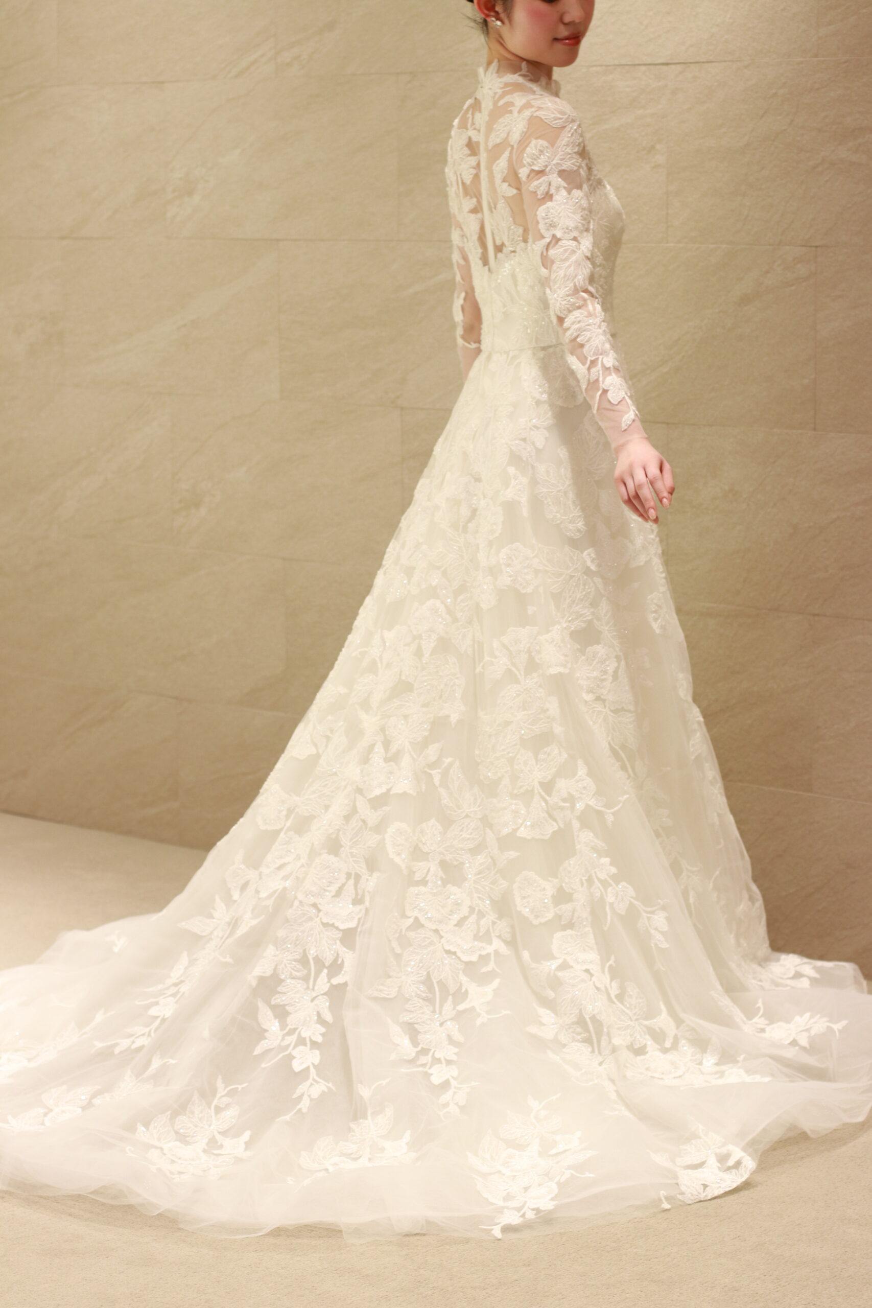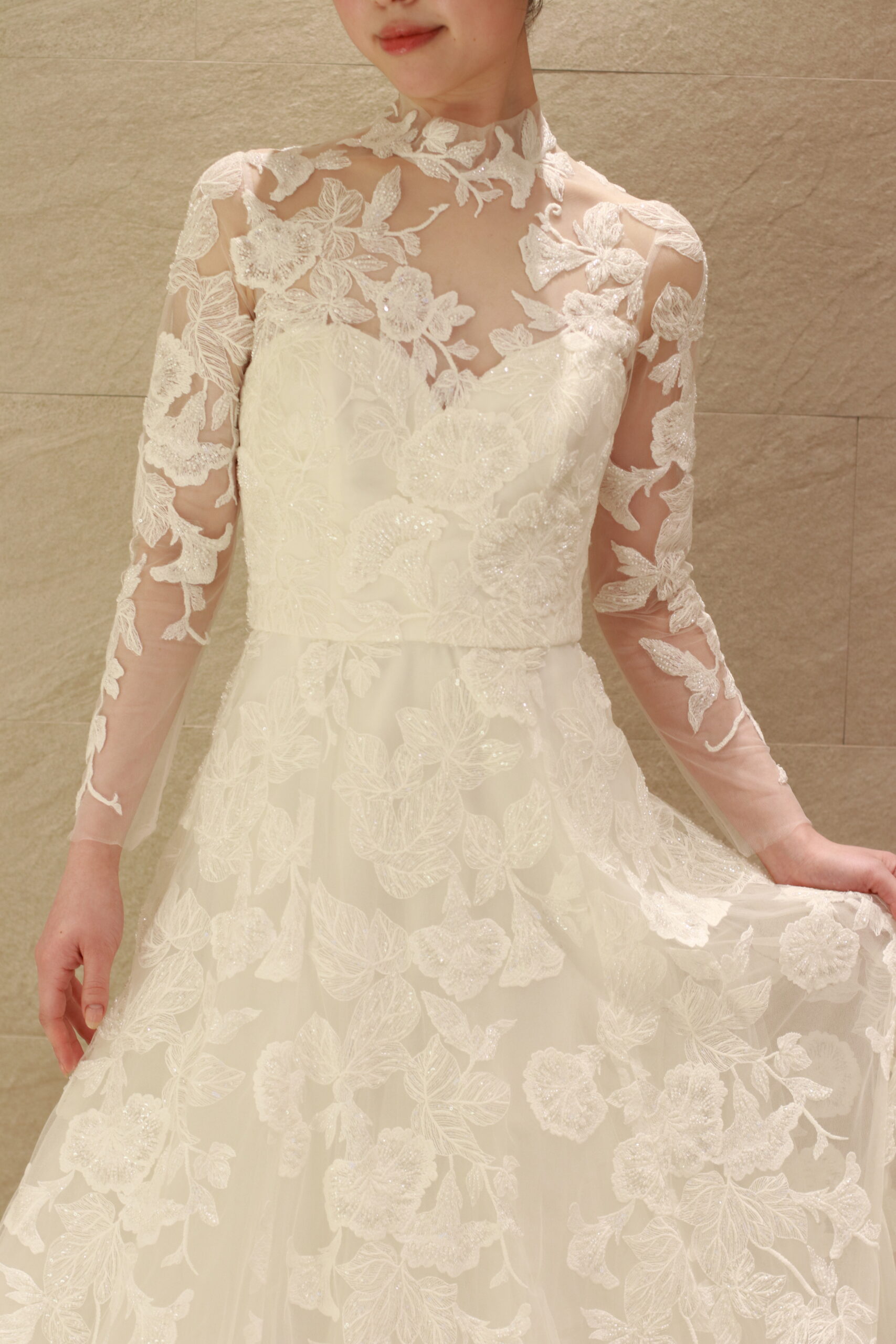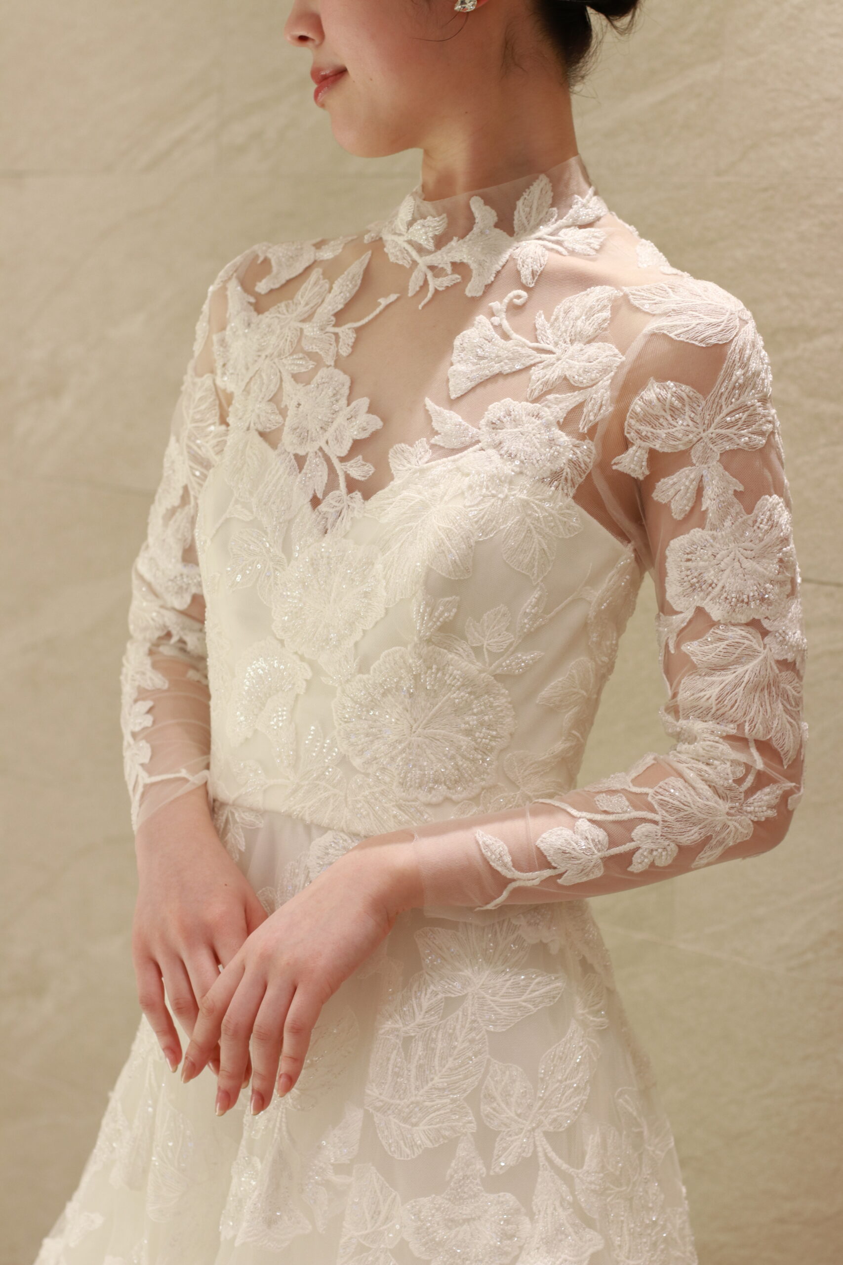 デコルテが華奢で美しい骨格ウェーブの花嫁におすすめのAラインのウェディングドレスをご紹介いたします。“Forever Modern”のコンセプトをもとにウェディングガウンを手掛けるAMSALE(アムサーラ)は、どの時代も変わらずにずっと愛されるクラシックなウェディングドレスを数多く生み出し続けるブランドです。結婚式を結ばれ、何年経っても色褪せない運命の一着であることはもちろん、結婚式当日に参列される大切なゲストの方々の、どの年代からも愛される花嫁姿をアムサーラのウェディングドレスは叶えます。本日ご紹介する骨格ウェーブの花嫁におすすめのAラインのウェディングドレスも、都会的で洗練されたデザインでありながら存在感を放つ、アムサーラらしい一着。繊細ながら存在感のある刺繍と、 煌びやかな輝きを放つビーディングが美しいハイネックのデザインは、骨格ウェーブの華奢なデコルテと細くて長い首をより美しく魅せ、お顔回りを華やかに演出します。また、広がりすぎないAラインのシルエット骨格ウェーブのしなやかな曲線に自然に沿い、花嫁の華奢なボディラインをより美しく昇華させます。気品ある上品な雰囲気を叶えたい花嫁へ是非おすすめしたい一着です。