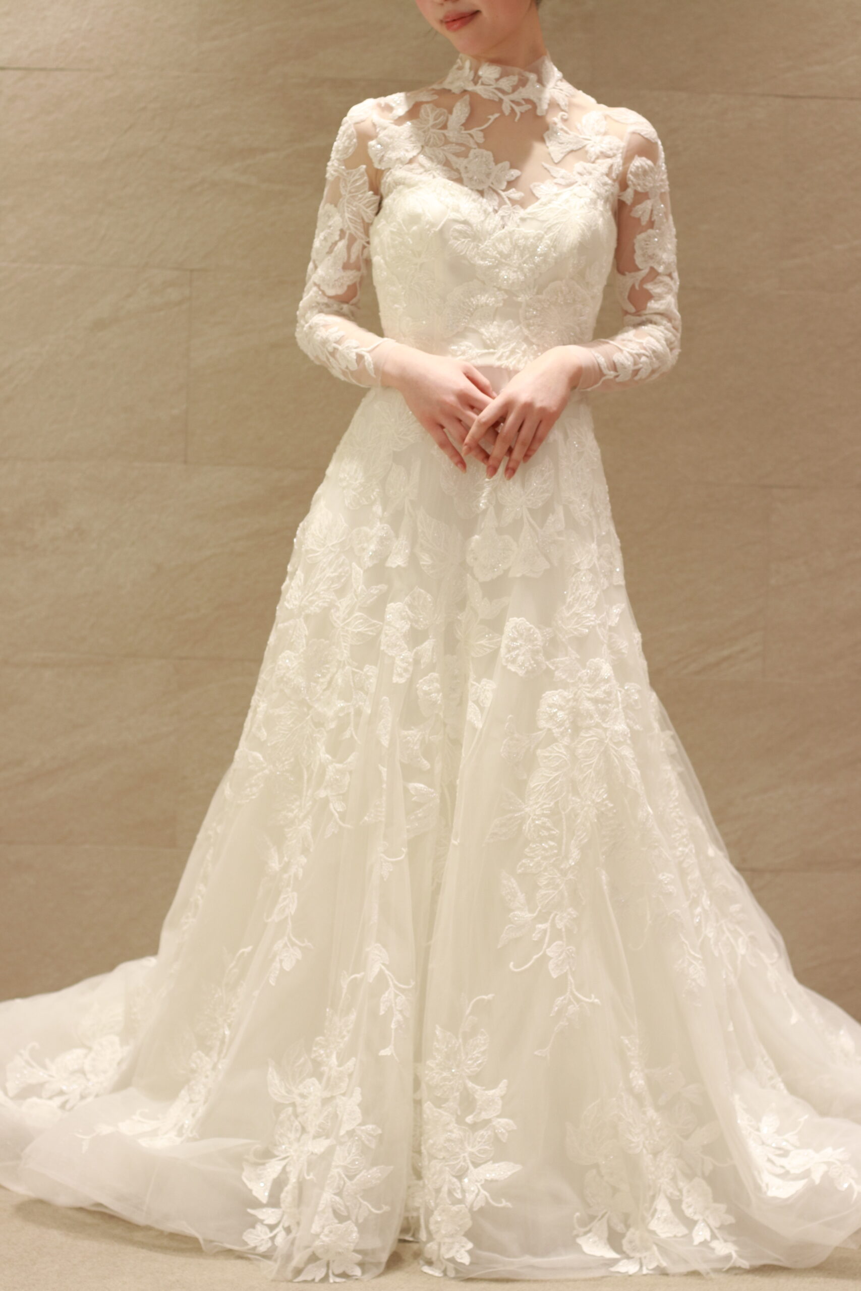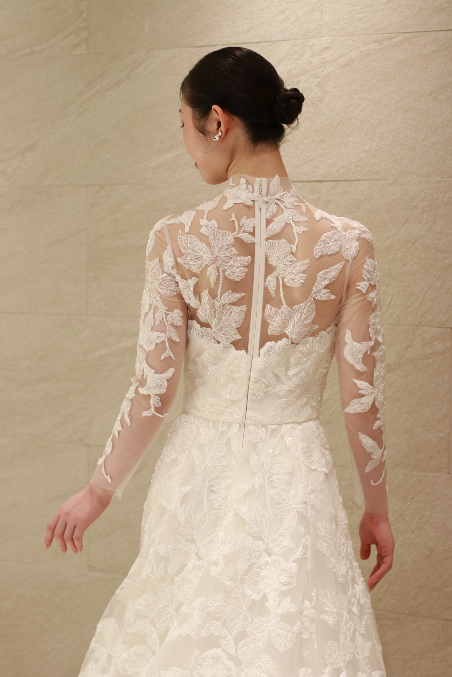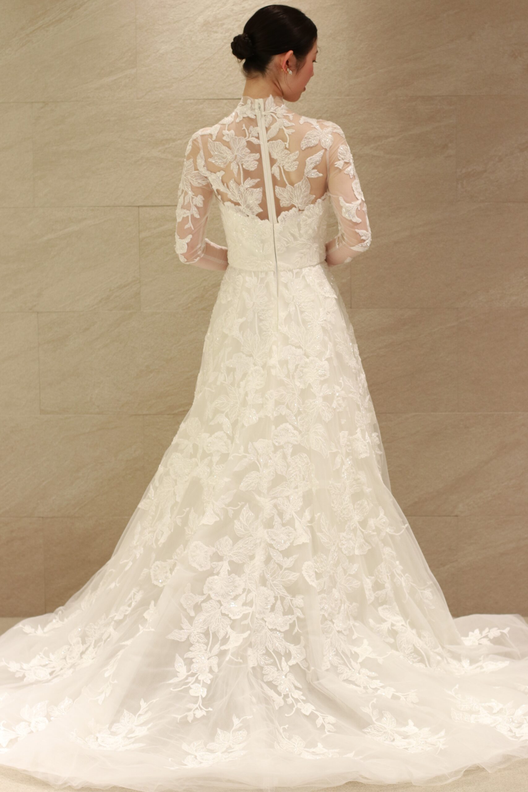デコルテが華奢で美しい骨格ウェーブの花嫁におすすめのAラインのウェディングドレスをご紹介いたします。“Forever Modern”のコンセプトをもとにウェディングガウンを手掛けるAMSALE(アムサーラ)は、どの時代も変わらずにずっと愛されるクラシックなウェディングドレスを数多く生み出し続けるブランドです。結婚式を結ばれ、何年経っても色褪せない運命の一着であることはもちろん、結婚式当日に参列される大切なゲストの方々の、どの年代からも愛される花嫁姿をアムサーラのウェディングドレスは叶えます。本日ご紹介する骨格ウェーブの花嫁におすすめのAラインのウェディングドレスも、都会的で洗練されたデザインでありながら存在感を放つ、アムサーラらしい一着。繊細ながら存在感のある刺繍と、 煌びやかな輝きを放つビーディングが美しいハイネックのデザインは、骨格ウェーブの華奢なデコルテと細くて長い首をより美しく魅せ、お顔回りを華やかに演出します。また、広がりすぎないAラインのシルエット骨格ウェーブのしなやかな曲線に自然に沿い、花嫁の華奢なボディラインをより美しく昇華させます。気品ある上品な雰囲気を叶えたい花嫁へ是非おすすめしたい一着です。