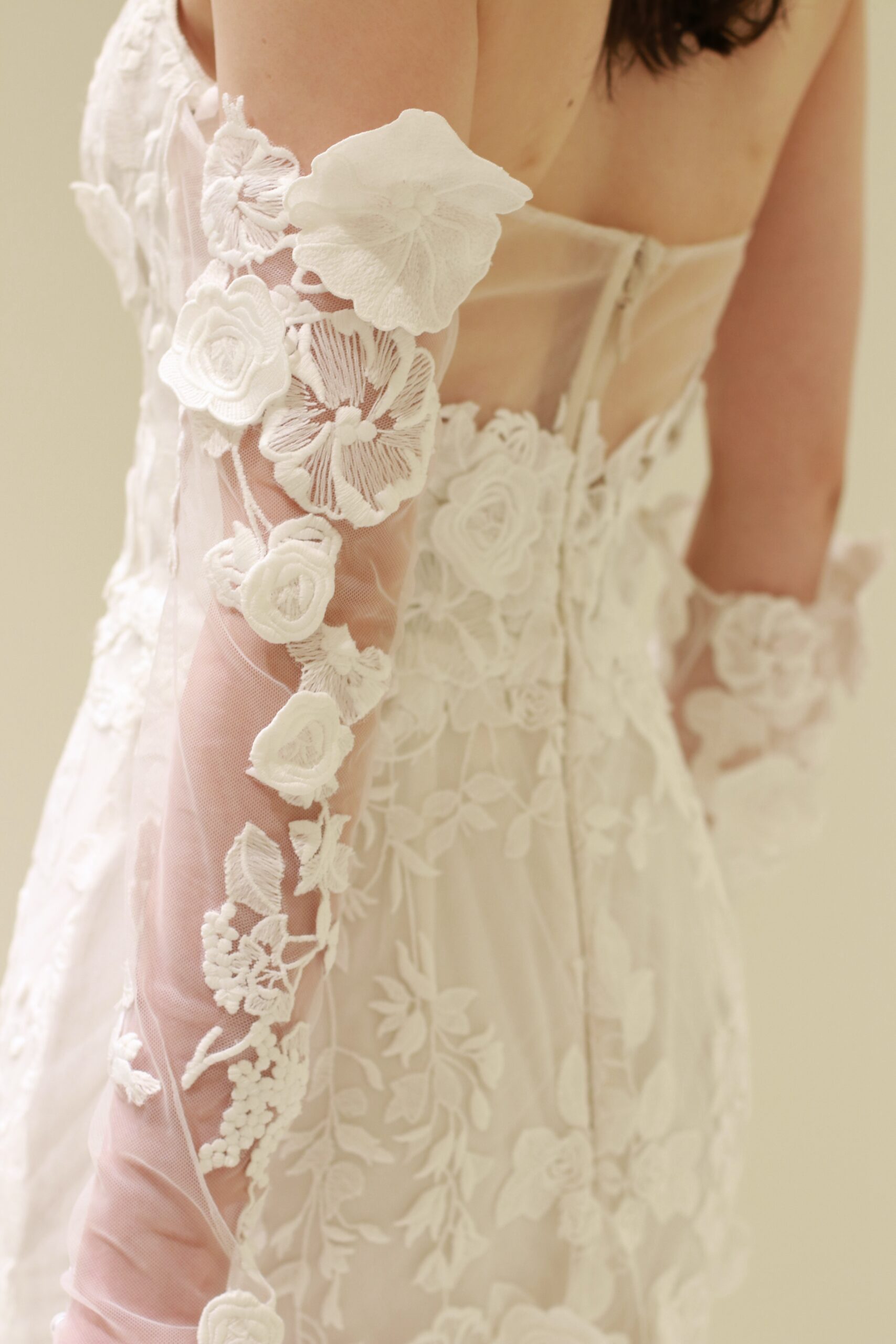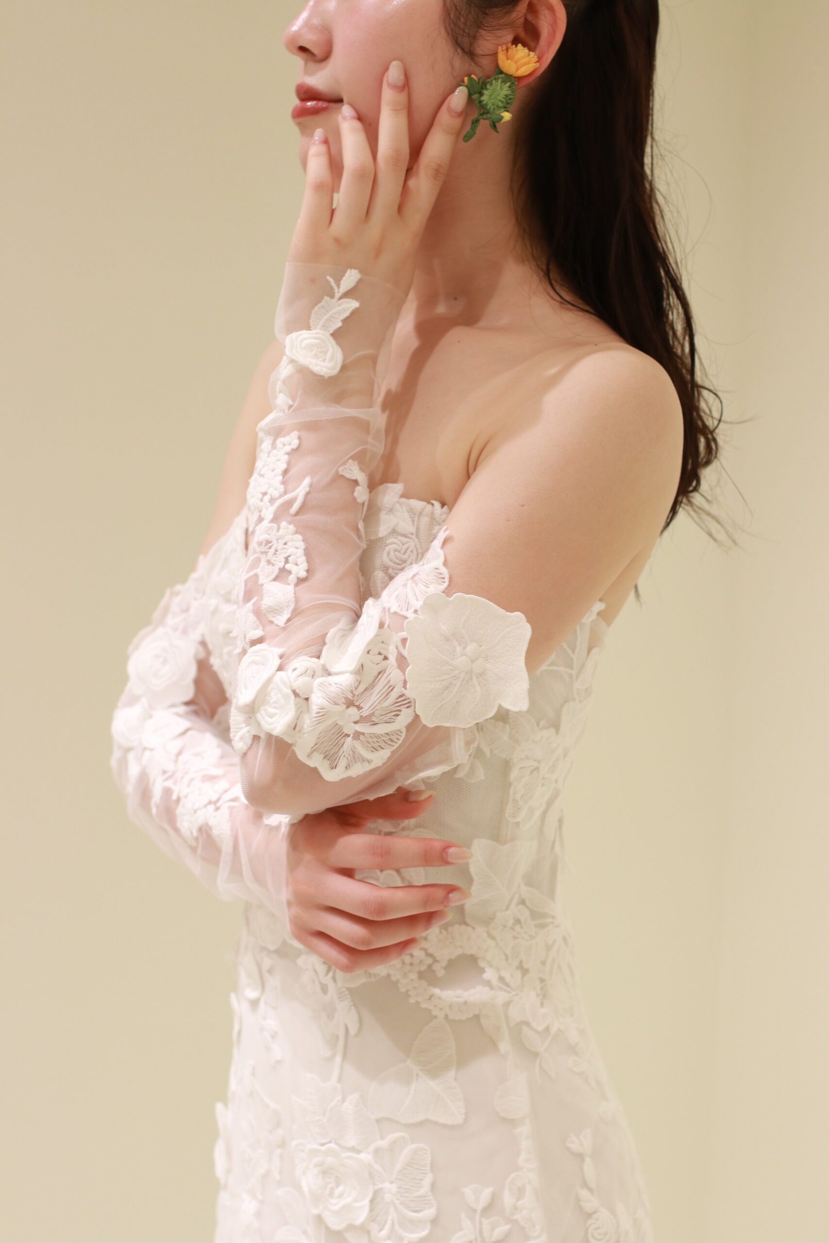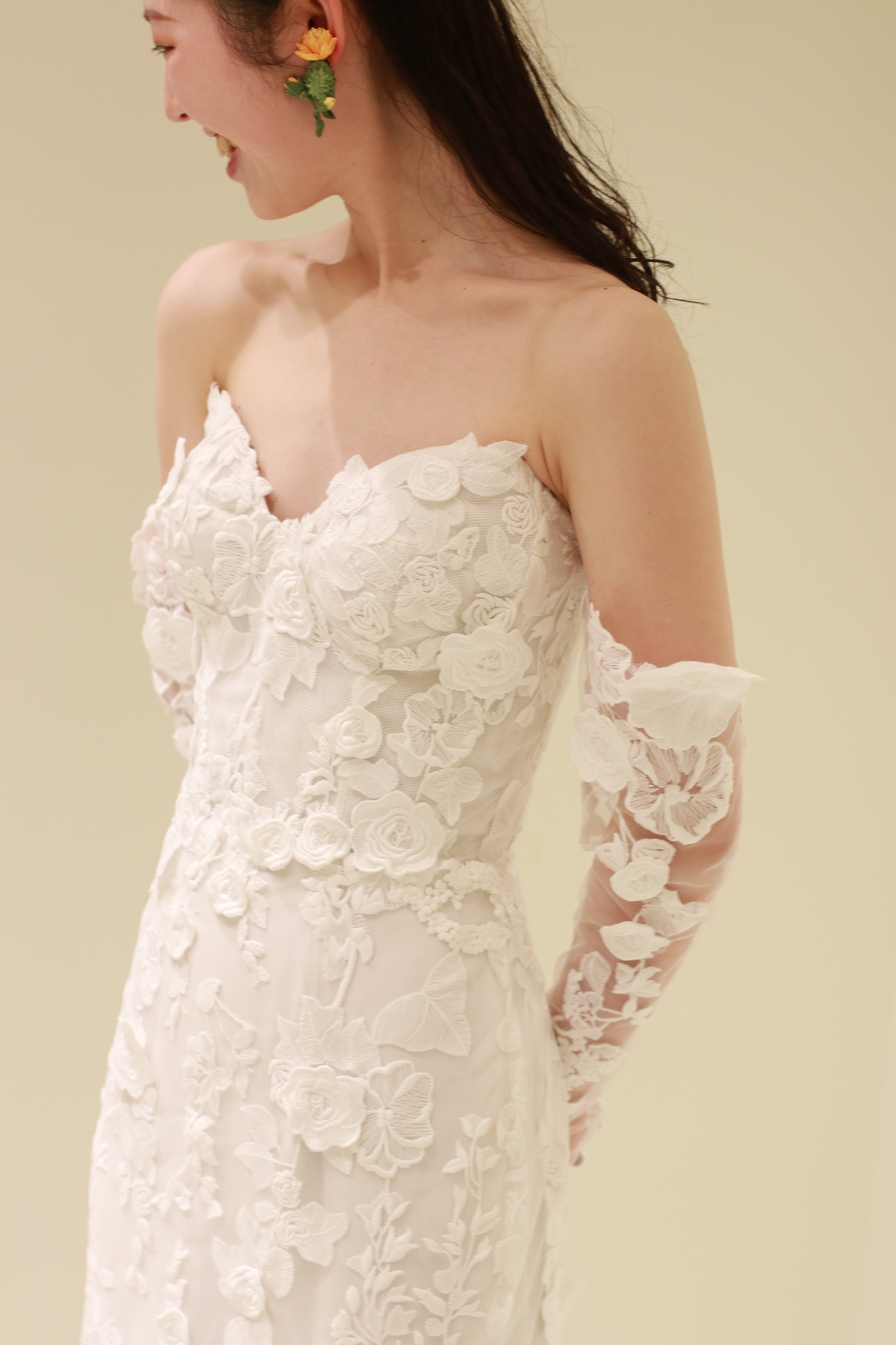 挙式の神聖な雰囲気とは一変、ゲストとの距離感が近いアットホームなパーティシーンには、オフショルダーのロングスリーブを付けるドレスダウンしたスタイリングがおすすめ。洗練された挙式のシーンとは印象を変える、華やかでアットホームな雰囲気を醸し出し、結婚式の一日の中でシーンに合わせて雰囲気を変えることができるのも2WAYのデザインの魅力です。今回は、スリーブを付けることによって肩肘張らないエフォートレスな雰囲気を叶え、耳元にはフラワーのデザインがキャッチーなOscar de la Renta(オスカー デ ラ レンタ)のイヤリングを合わせることによって明るい華やかな空気感を演出いたしました。十分丈のロングスリーブは上品な印象でありながら、お肌に直接乗るかのような3Dのフラワーモチーフがフェミニンでロマンティックな花嫁姿を叶えます。グラスを片手に、ゲストの方との会話やお食事を楽しんでいただけるアットホームで温かいパーティーに是非お召いただきたい一着なのです。挙式のタイトなヘアスタイルとはうって変わり、ナチュラルなウェーブのダウンヘアにすることで、作り込み過ぎない自然体なスタイリングが抜け感を演出します。