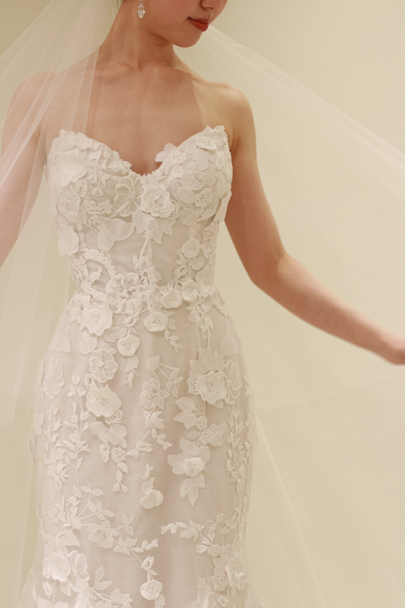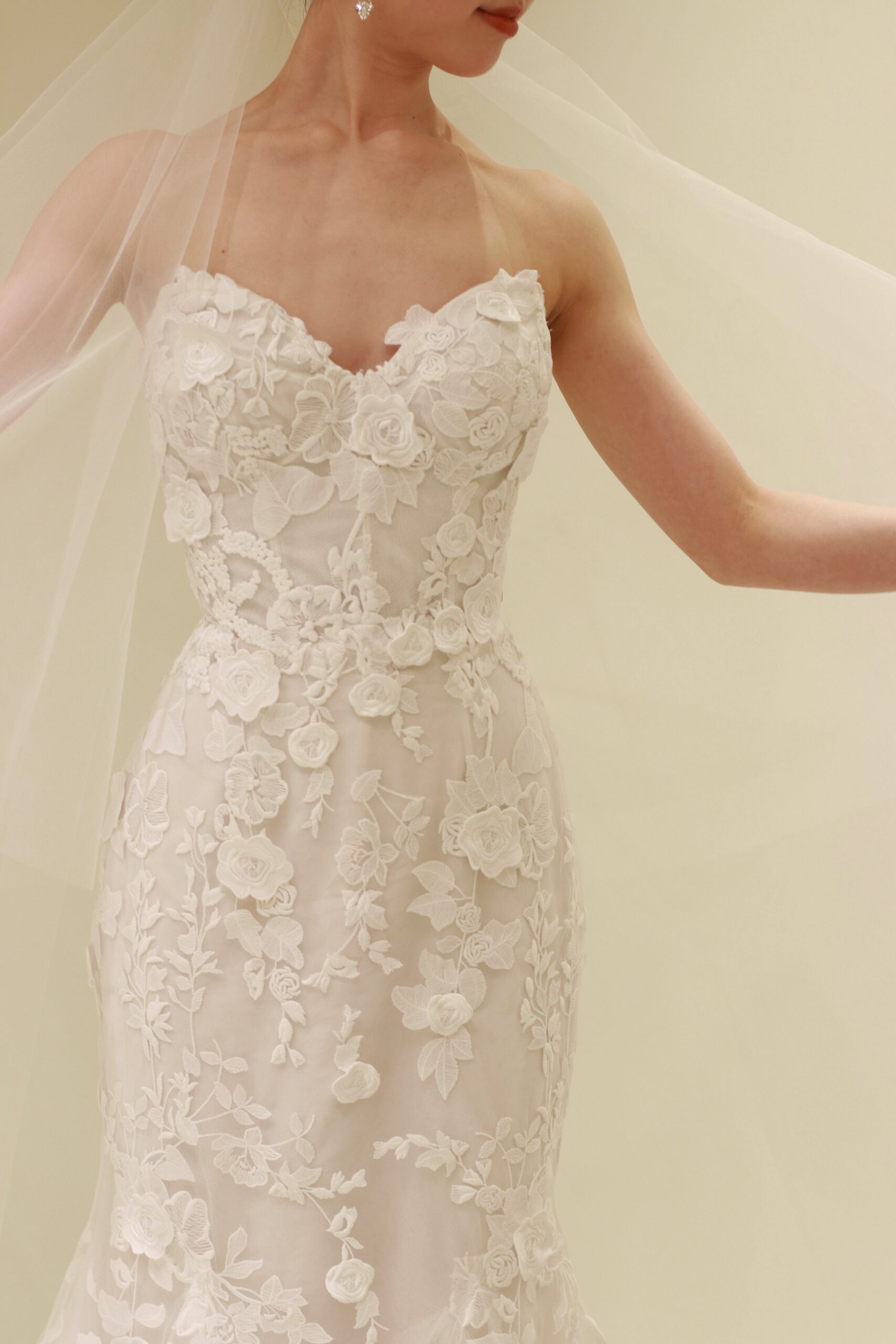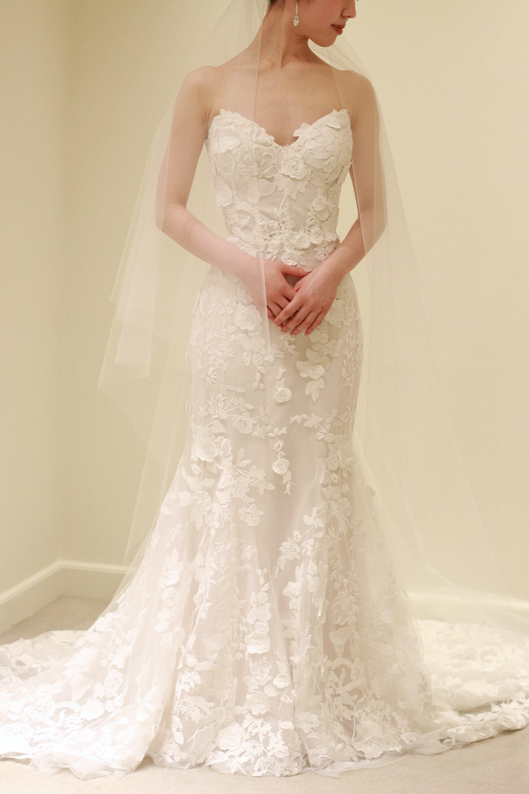フラワーモチーフの総レースが上品なマーメイドラインの新作ウェディングドレス。モニーク ルイリエならではのフラワーモチーフは、大人っぽい上品なマーメイドラインのシルエットを活かしながらも、可憐な雰囲気をも演出します。ドレス本体に施されたレースの上から一つひとつ手作業でカッティングされたフラワーのモチーフを立体的に縫いつけることで奥行きが生まれ、総レースでありながらも重厚感がありすぎない抜け感を感じさせるのです。裾元まで美しくあしらわれる総レースのデザインは、バージンロードを歩まれる花嫁の動きに合わせて表情を変え、一生に一度の特別な時間をより幸福感の溢れる雰囲気に昇華してくれます。イヤリングはスタイリッシュで洗練された長さのあるデザインを合わせることで凛とした印象に。花嫁姿には欠かせないベールは、神聖な雰囲気を醸し出すシンプルなロングベールを合わせることで、華美になりすぎない上品な印象を叶えます。