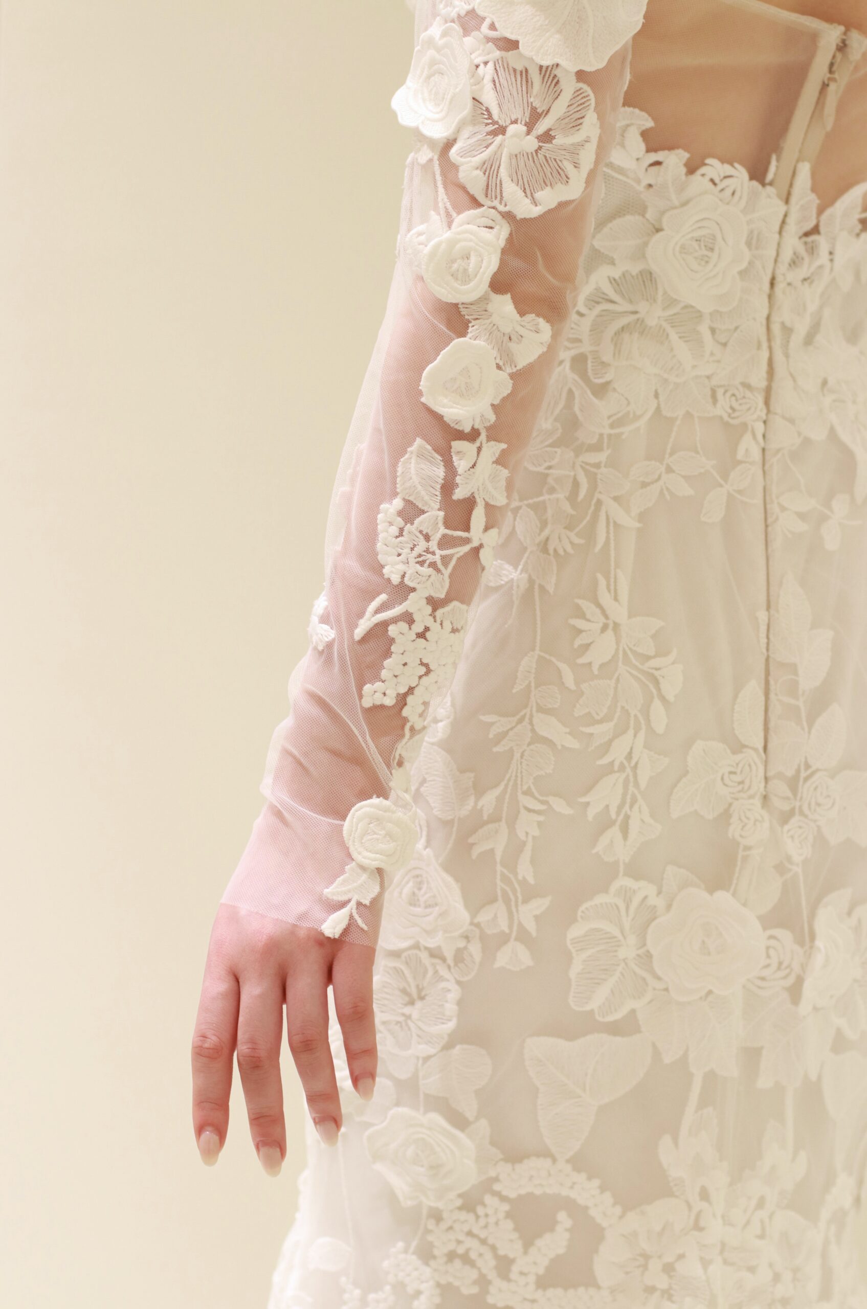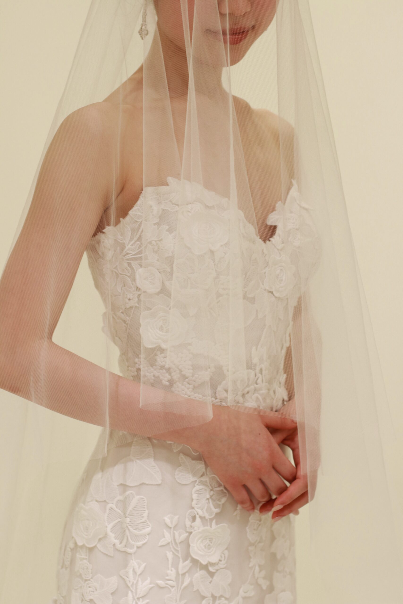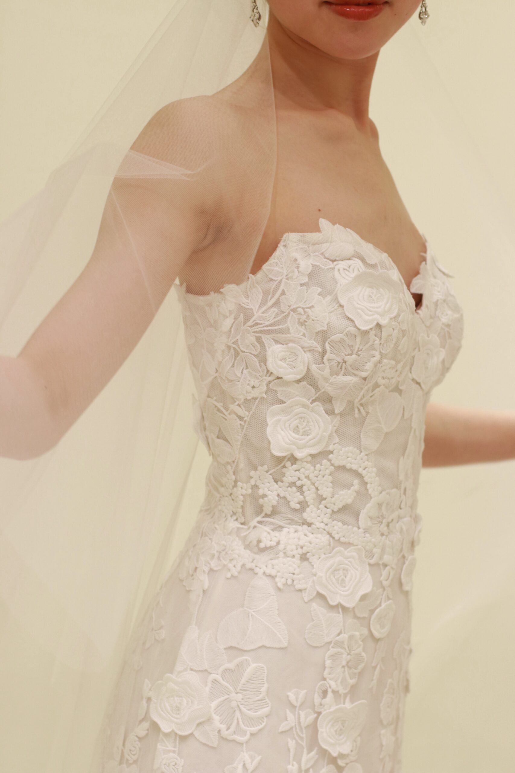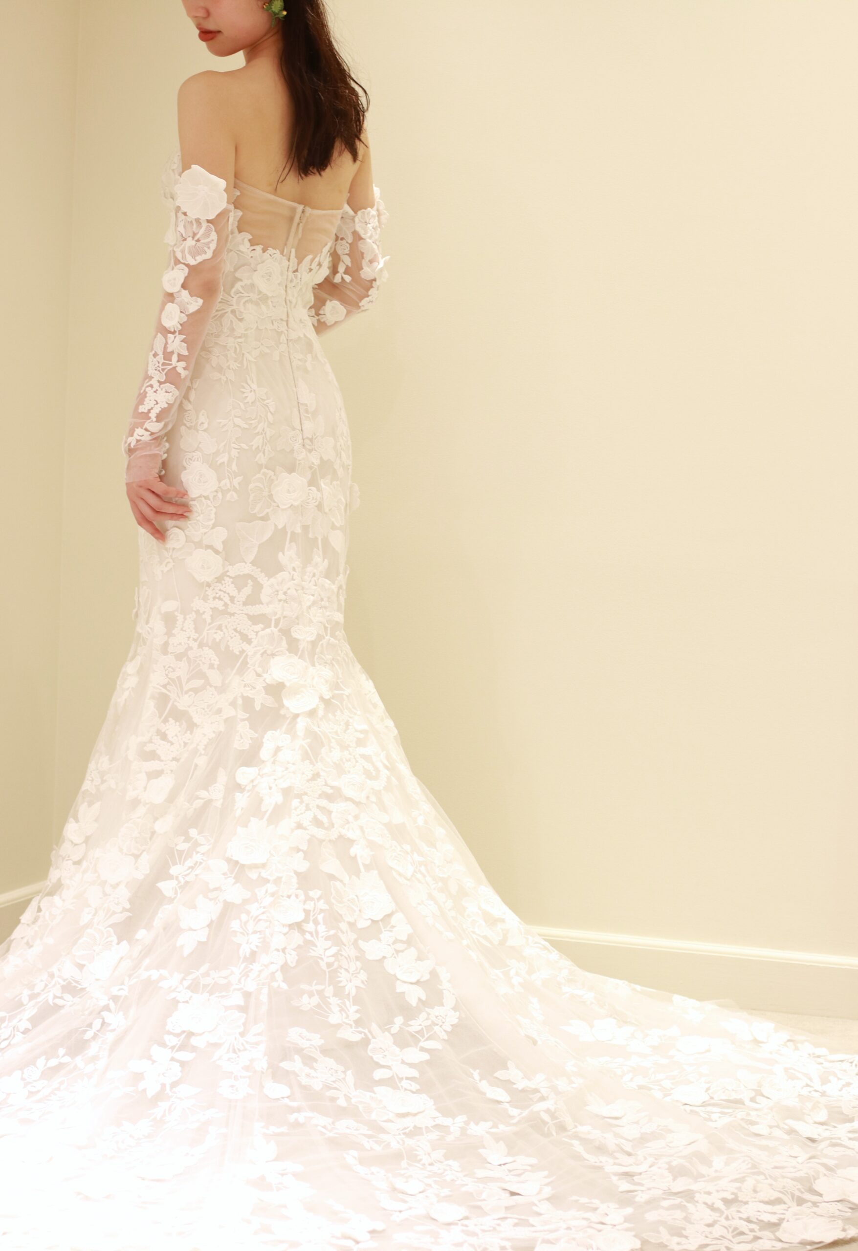 フラワーモチーフの総レースが上品なマーメイドラインの新作ウェディングドレス。モニーク ルイリエならではのフラワーモチーフは、大人っぽい上品なマーメイドラインのシルエットを活かしながらも、可憐な雰囲気をも演出します。ドレス本体に施されたレースの上から一つひとつ手作業でカッティングされたフラワーのモチーフを立体的に縫いつけることで奥行きが生まれ、総レースでありながらも重厚感がありすぎない抜け感を感じさせるのです。裾元まで美しくあしらわれる総レースのデザインは、バージンロードを歩まれる花嫁の動きに合わせて表情を変え、一生に一度の特別な時間をより幸福感の溢れる雰囲気に昇華してくれます。イヤリングはスタイリッシュで洗練された長さのあるデザインを合わせることで凛とした印象に。花嫁姿には欠かせないベールは、神聖な雰囲気を醸し出すシンプルなロングベールを合わせることで、華美になりすぎない上品な印象を叶えます。