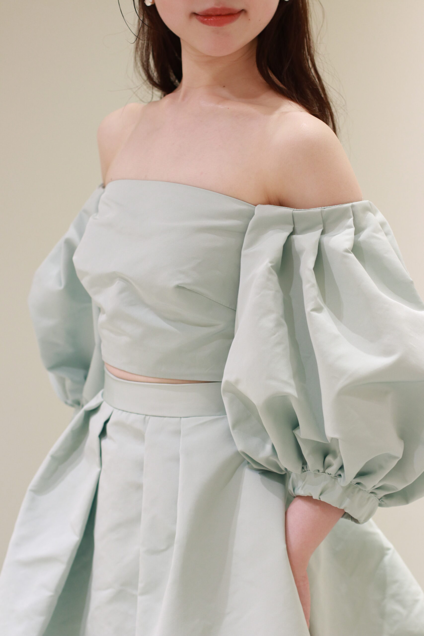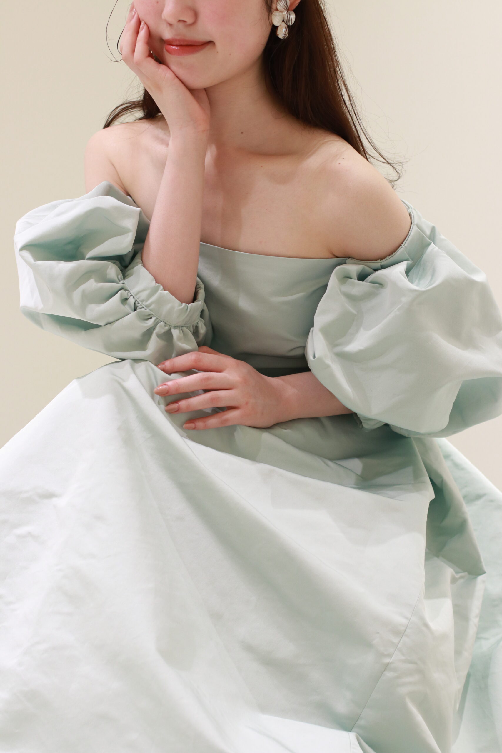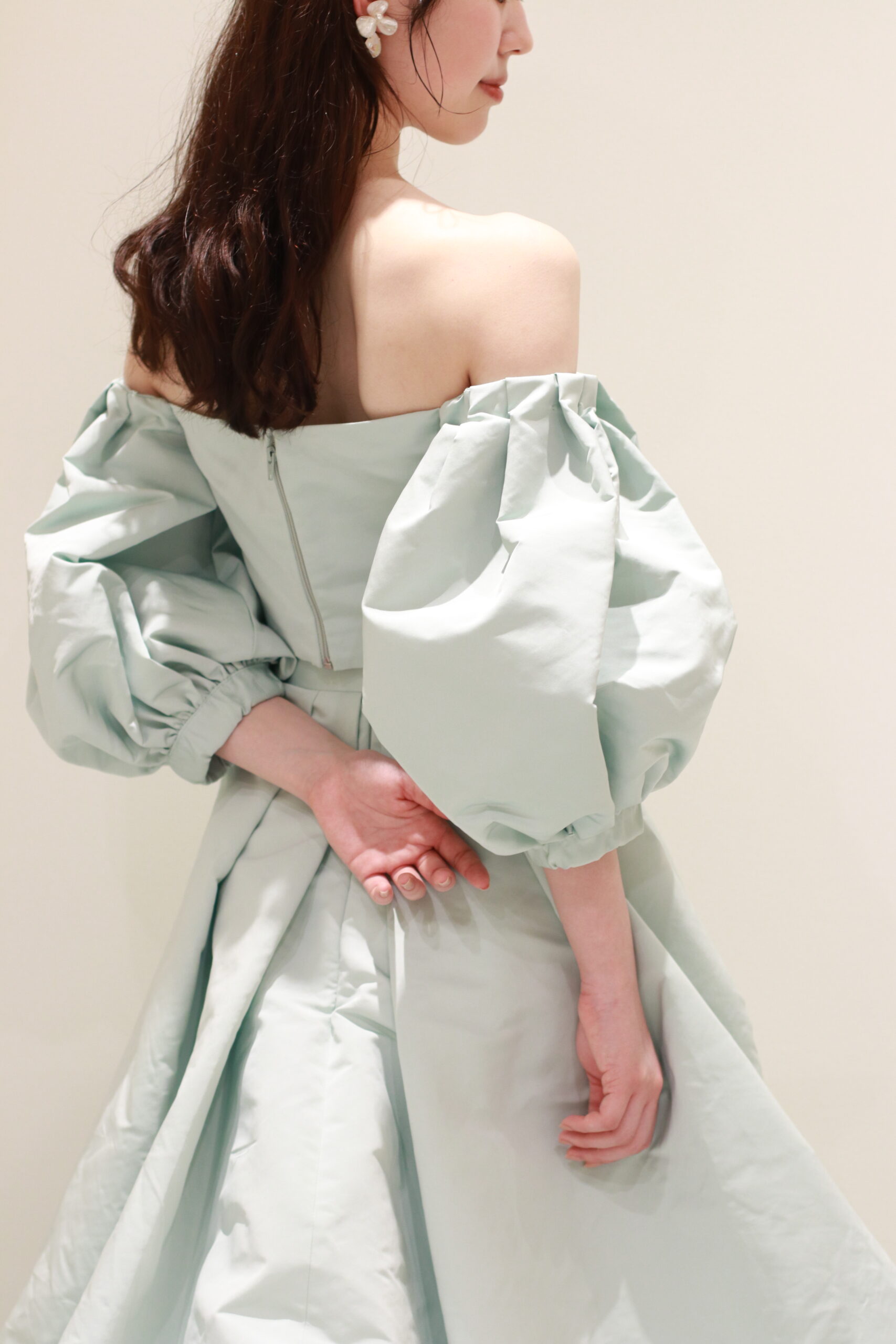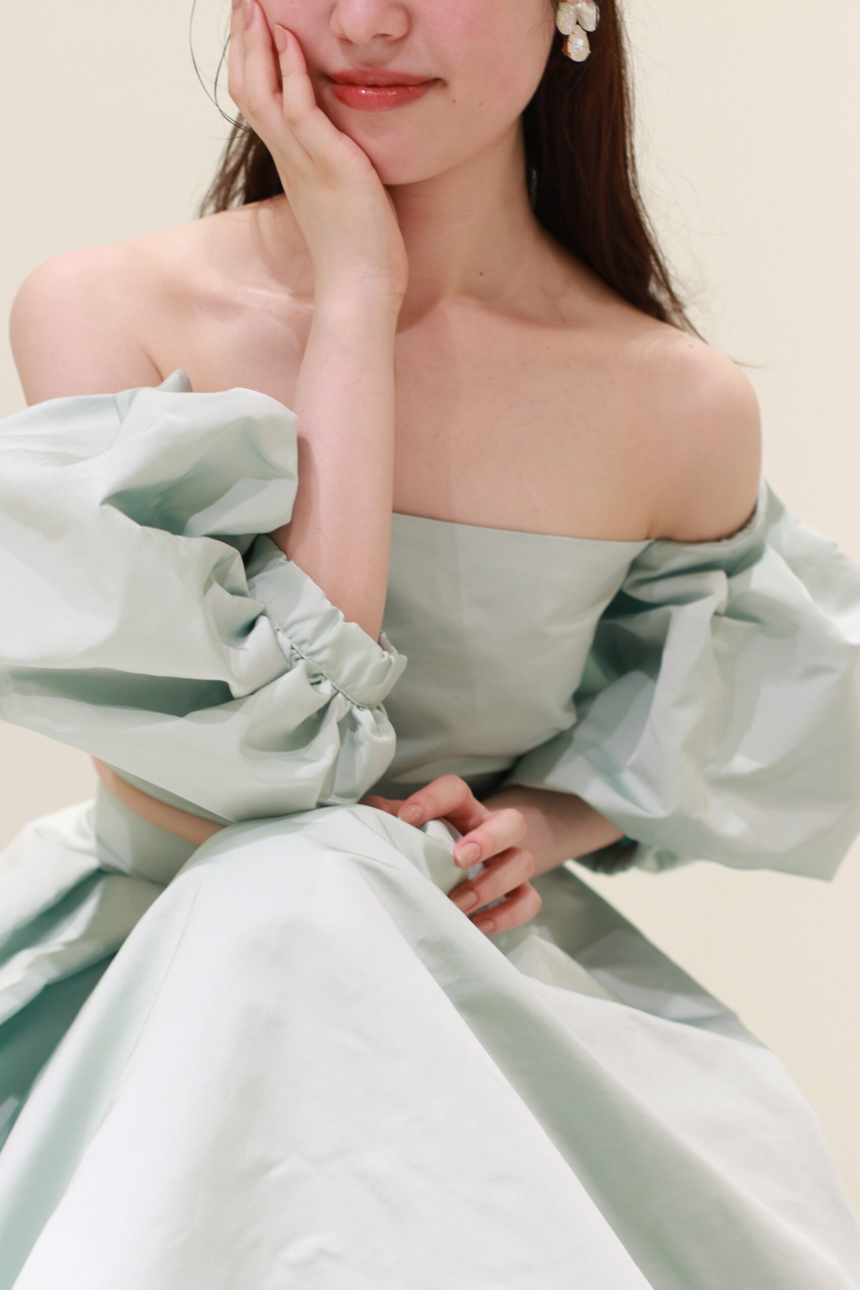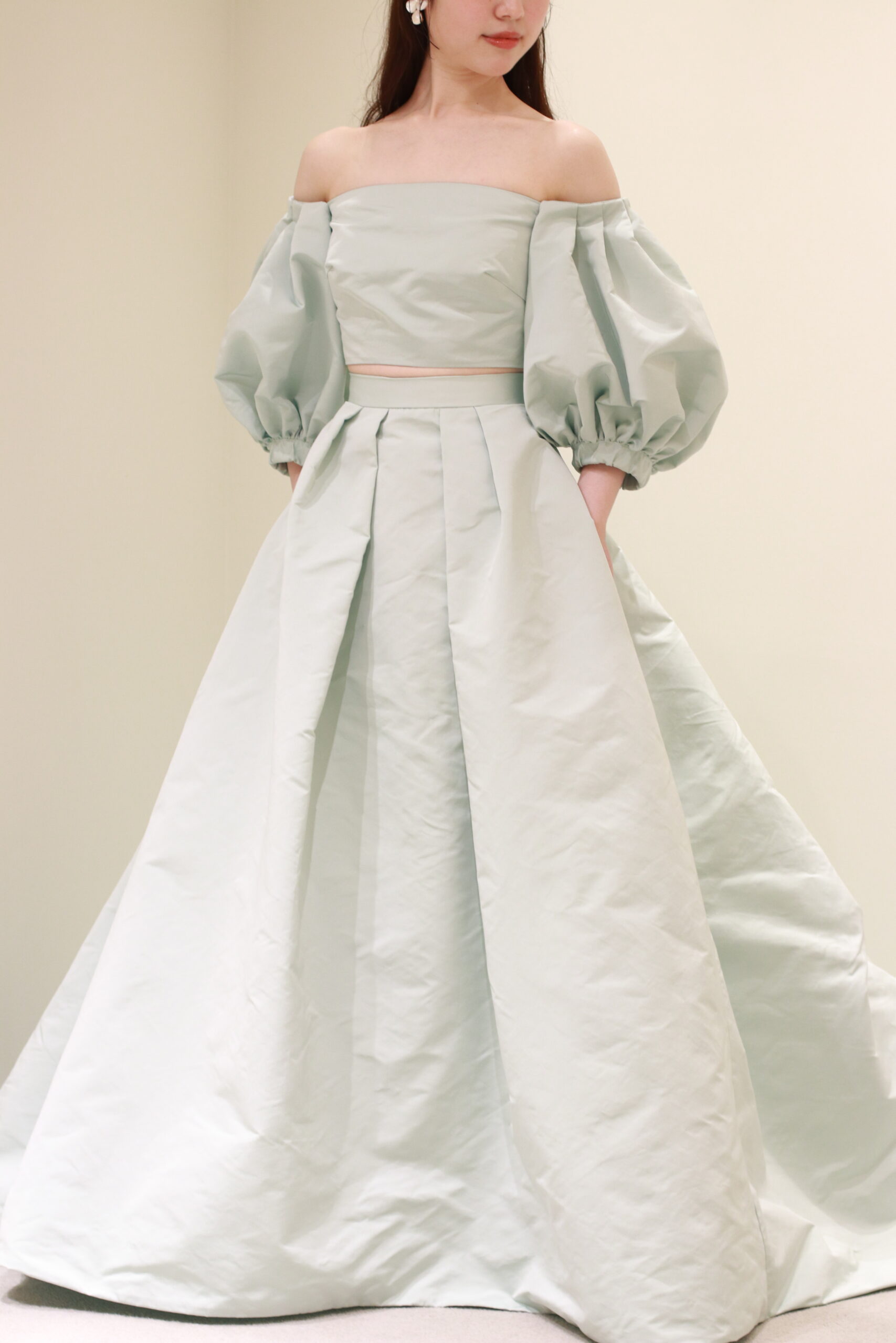 パフスリーブがファッショナブルなミントグリーンのカラードレスをご紹介します。近年、世界各国のウェディングドレスブランドでトレンドとされ、感度の高いセンスフルな日本の花嫁の中でもトレンドとなっているパフスリーブ。本日ご紹介するパフスリーブのカラードレスは、Monique Lhuillier(モニーク ルイリエ)からTHE TREAT DRESSING(ザ トリート ドレッシング)に届いた新作のカラードレス。シルクタフタの軽やかで抜け感のある上質な素材と、シンプルなデザインだからこそ映える袖元のパフスリーブは、上品でありながら可憐な花嫁の雰囲気を醸し出します。また、セパレートのデザインは、インポートならではのファッショナブルでトレンド感のあるお色直しスタイルを演出し、他の人と被らないあなただけのスタイリングを叶えていただくことができます。ミントグリーンの涼やかな色味はお肌の透明感をより一層高め、遊び心はたっぷりと、でも決してカジュアルにはなりすぎない上品で聡明な印象を叶えます。大人な上品さは残しながらもご自身らしい可憐な雰囲気でお色直しスタイルを纏ってみてはいかがでしょうか。
