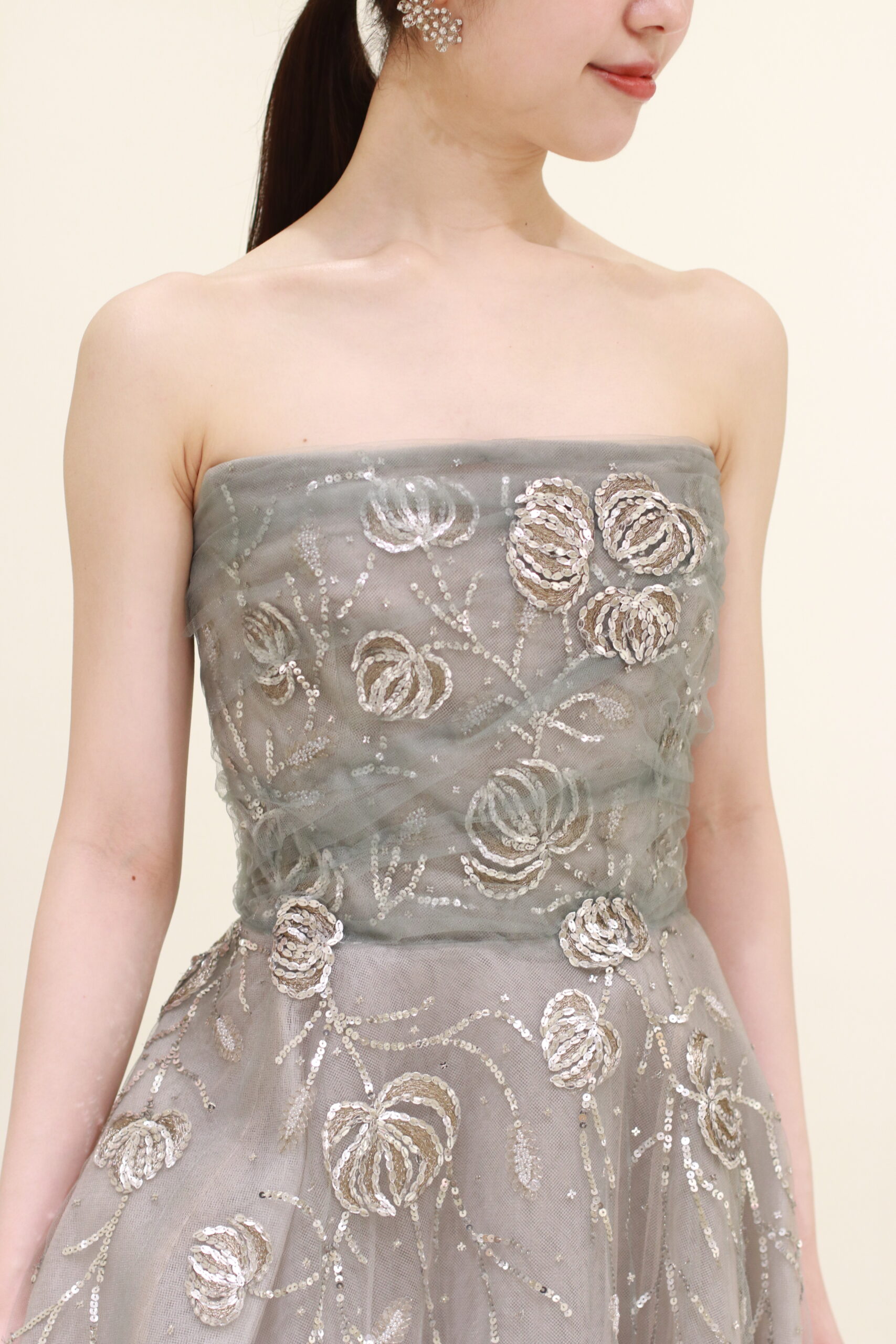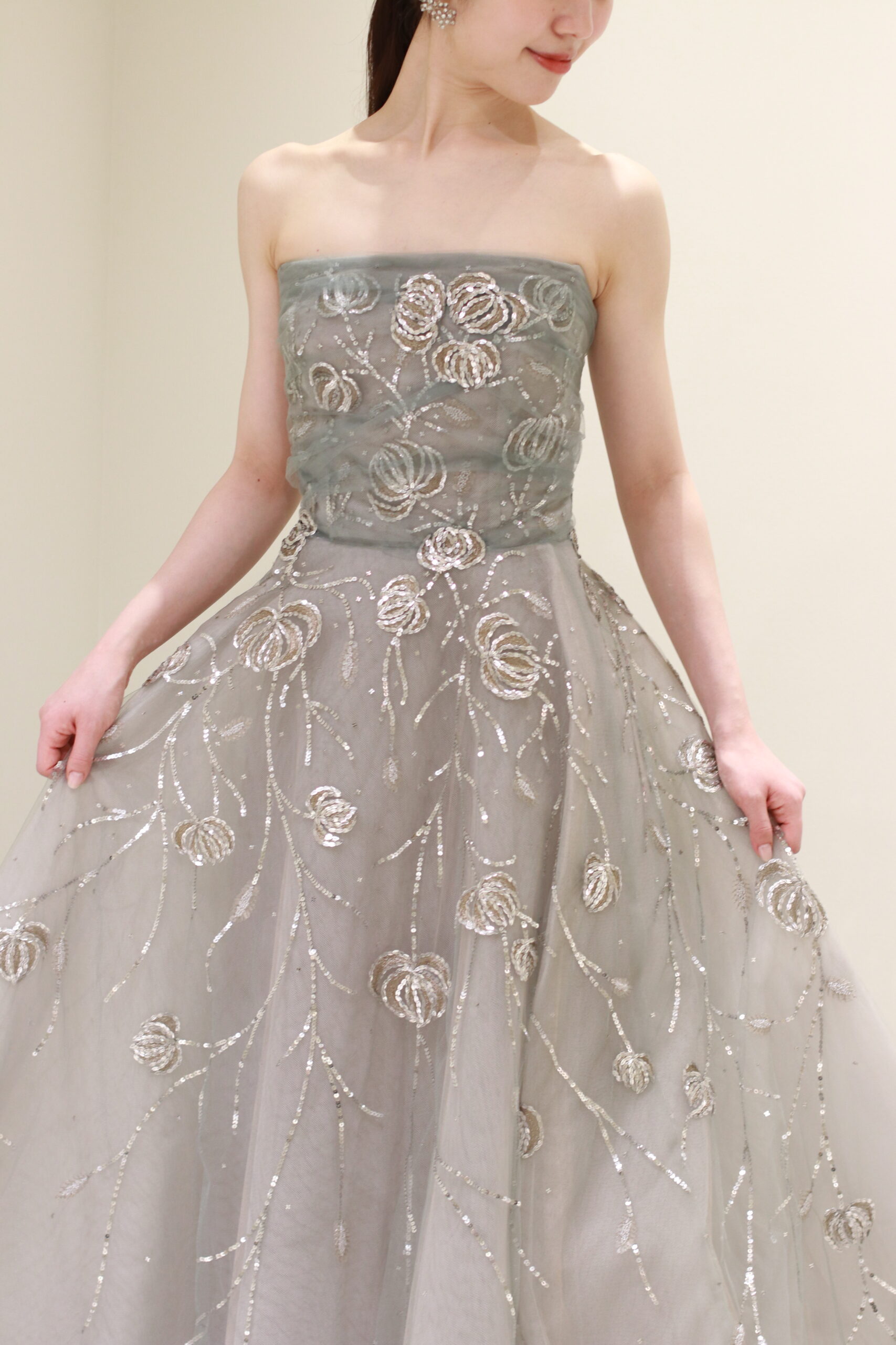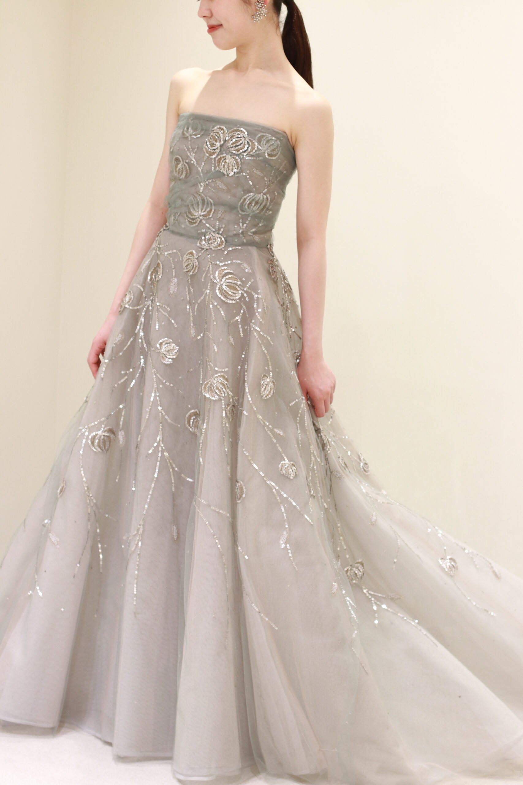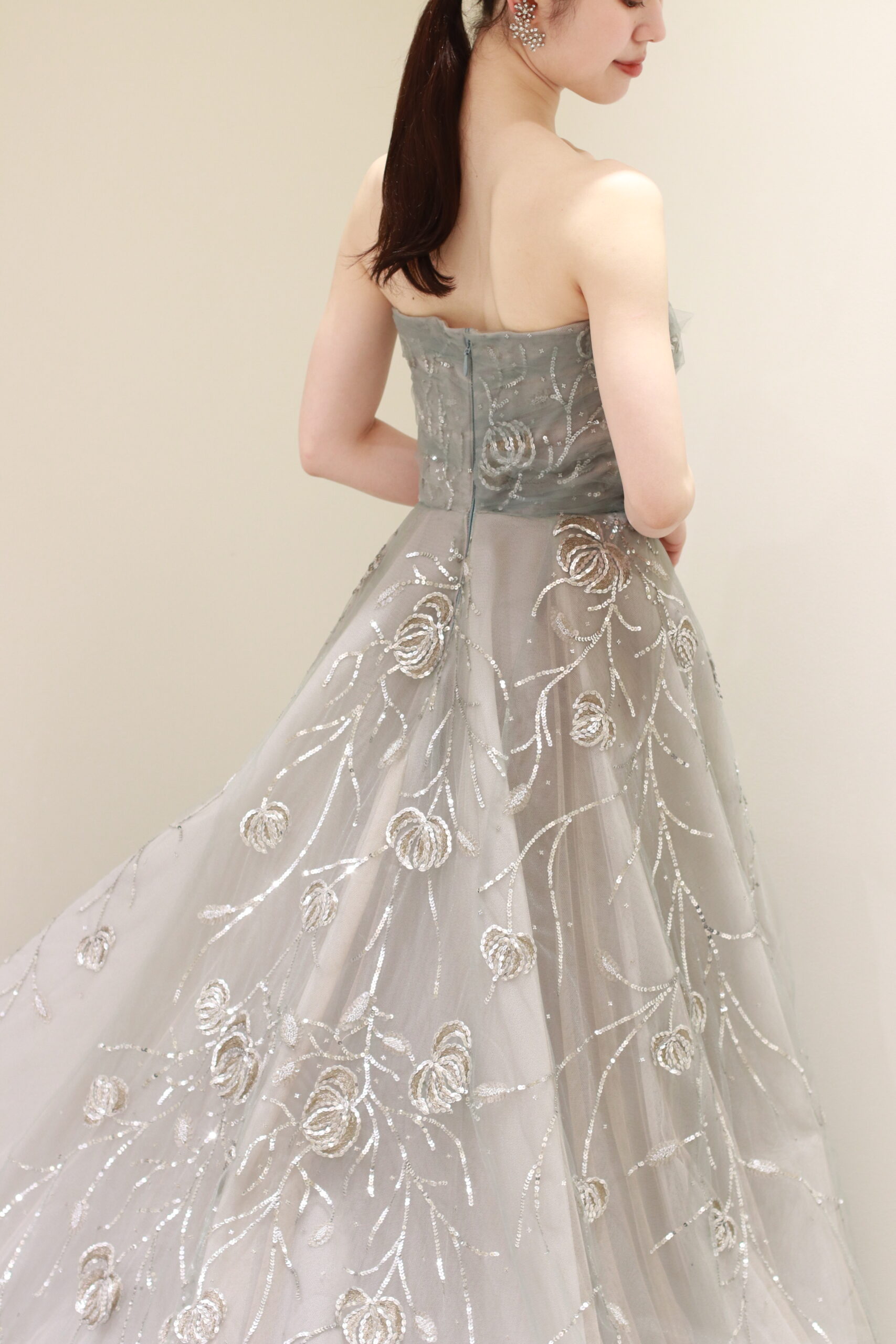 華やかな刺繍が美しいブルーグレーのカラードレスをご紹介します。世界中の花嫁から長年愛されるラグジュアリーブランド、Reem Acra(リーム アクラ)よりセレクトした華やかな刺繍が美しいブルーグレーのカラードレス。インド刺繍や重厚感のあるデザインを得意とするReem Acra(リーム アクラ)らしい一着です。繊細な刺繍と大胆で目を惹くきらめきが美しいビーディングのディティールは、結婚式という一生に一度の特別な一日にお召しいただくに相応しいオーラを放ちます。色味が絶妙に異なる繊細なチュールを重ねることで色味に奥行が生まれ、自然光や会場のライティングに照らされた際には、透明感のあるチュールの上から華やかなビーディングがきらめきを放ち、結婚式らしい非日常で特別感のある印象を叶えます。内側にはハードチュールを忍ばせることで花嫁の動きに合わせて形状記憶し、どの瞬間も美しいAラインのシルエットを保つことができます。コーディネートはカラードレスの美しいビーディングに合わせてシルバーアクセサリーで統一感を出し、ヘアスタイルはローポニーテールにすることでブルーグレーの上品な色味を引き立てながらも、作り込み過ぎない自然体な雰囲気でお過ごしいただくことが叶います。