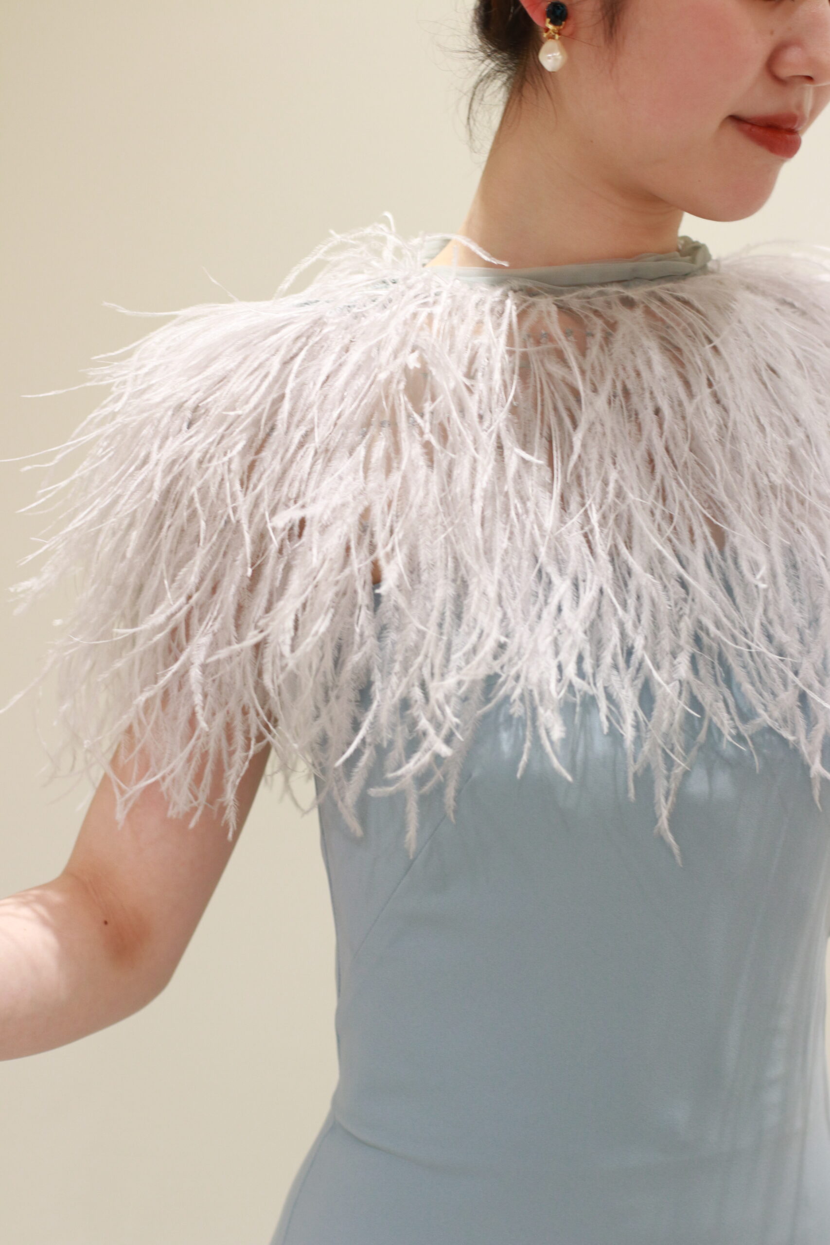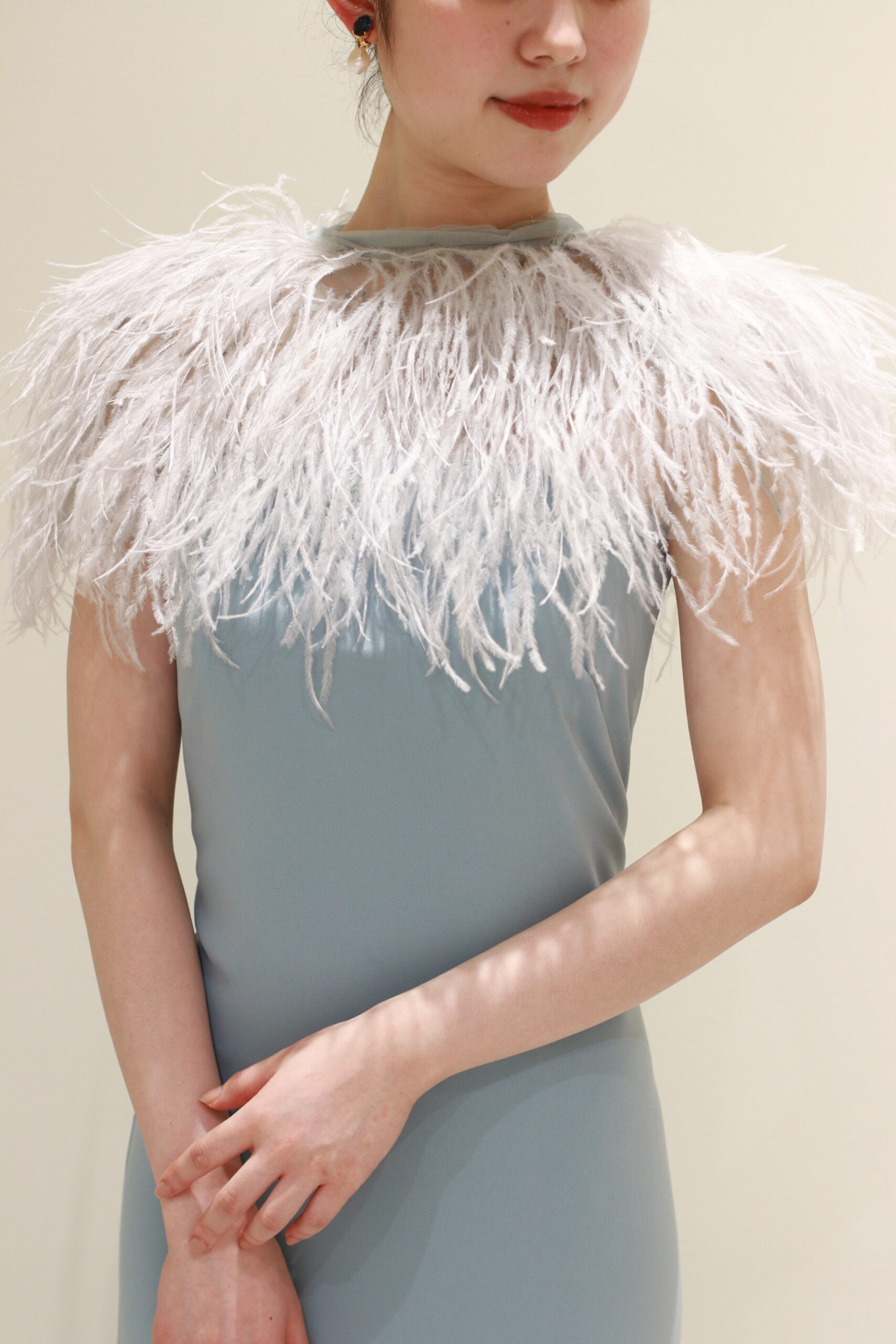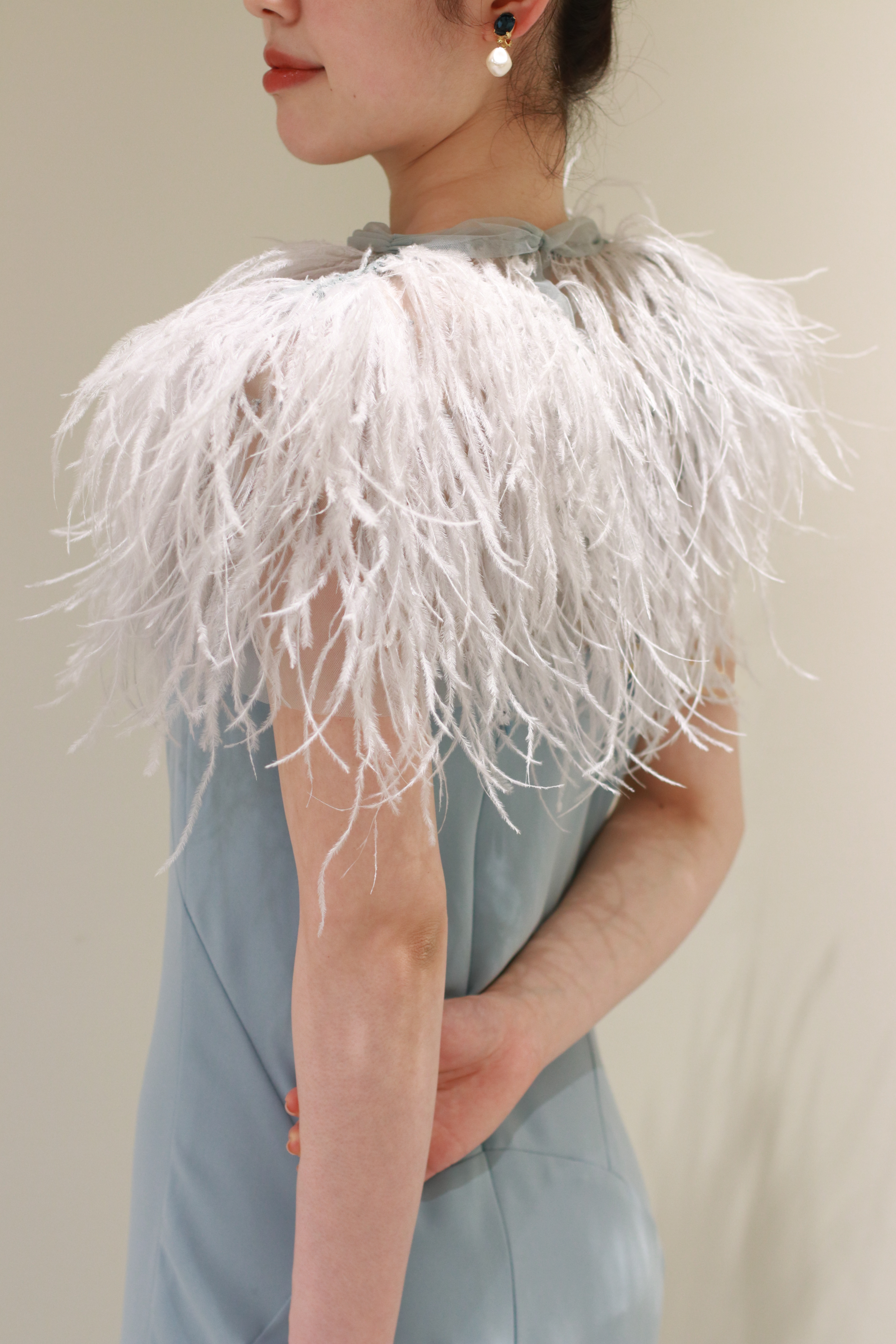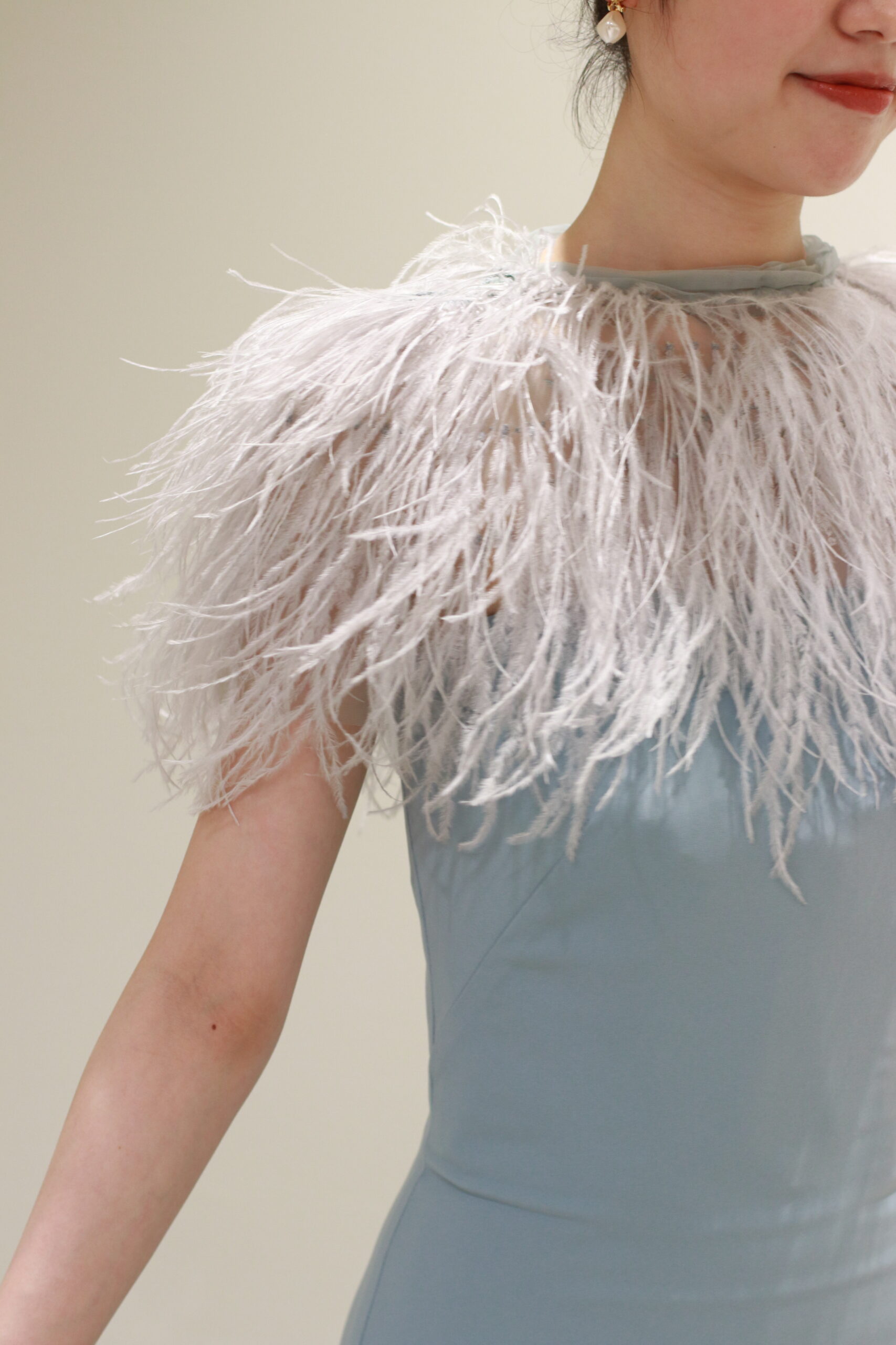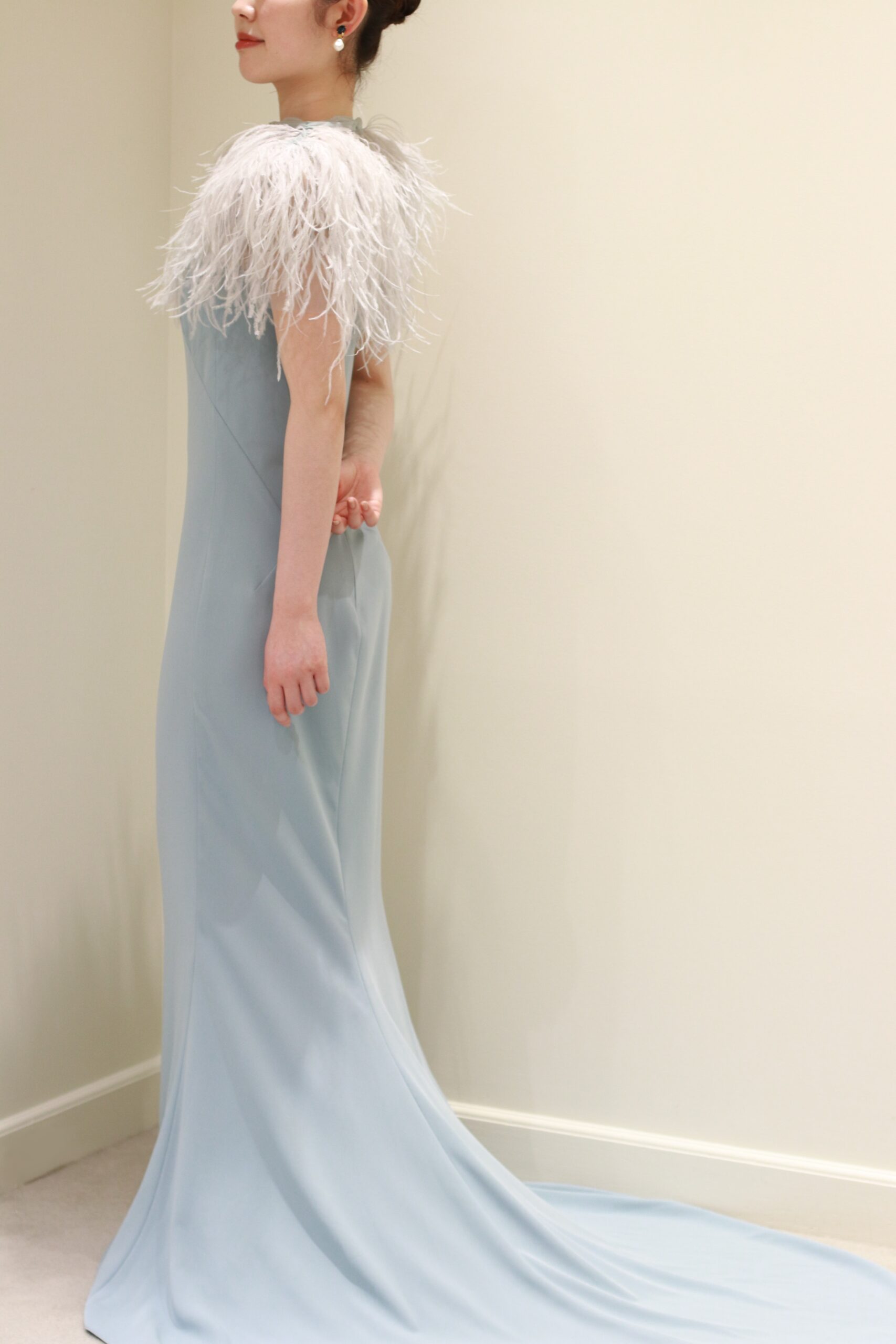オーストリッチのフェザーがトレンド感溢れるアイスブルーのカラードレスをご紹介します。シンプルなマーメイドラインに映えるオーストリッチのフェザーが上品でエレガントなカラードレス。上質なフェザーは、花嫁の動きに合わせてしなやかに揺れ動き、結婚式という一日の儚い瞬間をより一層特別な雰囲気に感じさせます。花嫁のお身体のシルエットを美しく魅せてくれるマーメイドラインに合わせるトップスは、デコルテの高い位置からフェザーがあしらわれることにより上品な印象に。大切なゲストの方々との特別な時間を楽しむ、花嫁の幸せそうな表情に華を添えます。デザイン性のあるカラードレスには、小ぶりなイヤリングを合わせることで華美すぎず、洗練された印象に。ヘアスタイルはアップヘアにすることで大人っぽい印象のマーメイドラインに抜け感をだし、お顔回りもすっきりとした雰囲気でお召しいただくことが叶います。洗練された印象を叶えるアイスブルーのカラードレスには、ヘアメイクやアクセサリーで遊び心をプラスすることであなただけのスタイリングで纏っていただくことができるのです。上品な雰囲気は残しつつ、トレンド感のあるおしゃれなテイストも取り入れたい感度の高い花嫁に是非おすすめしたい一着です。