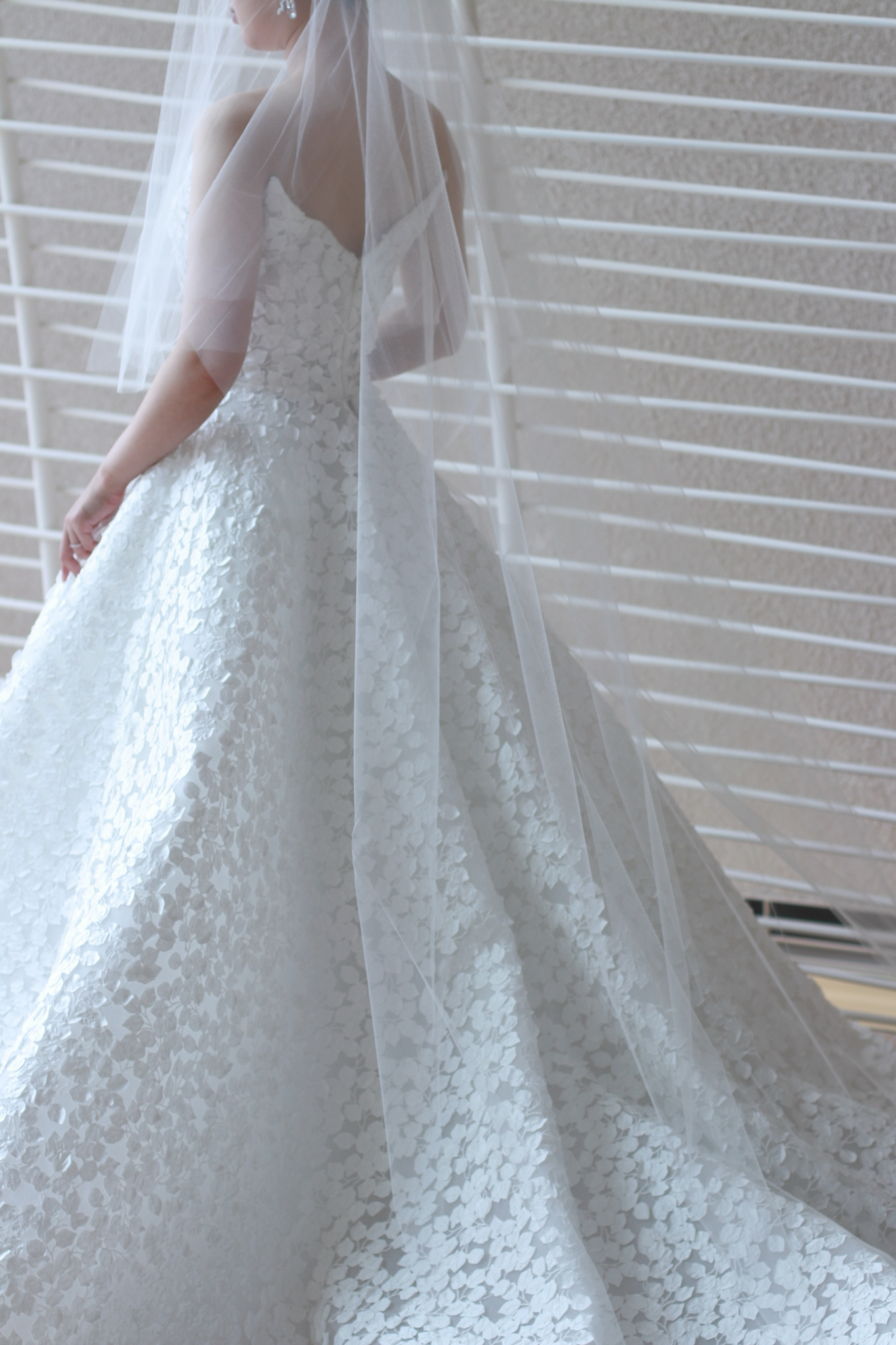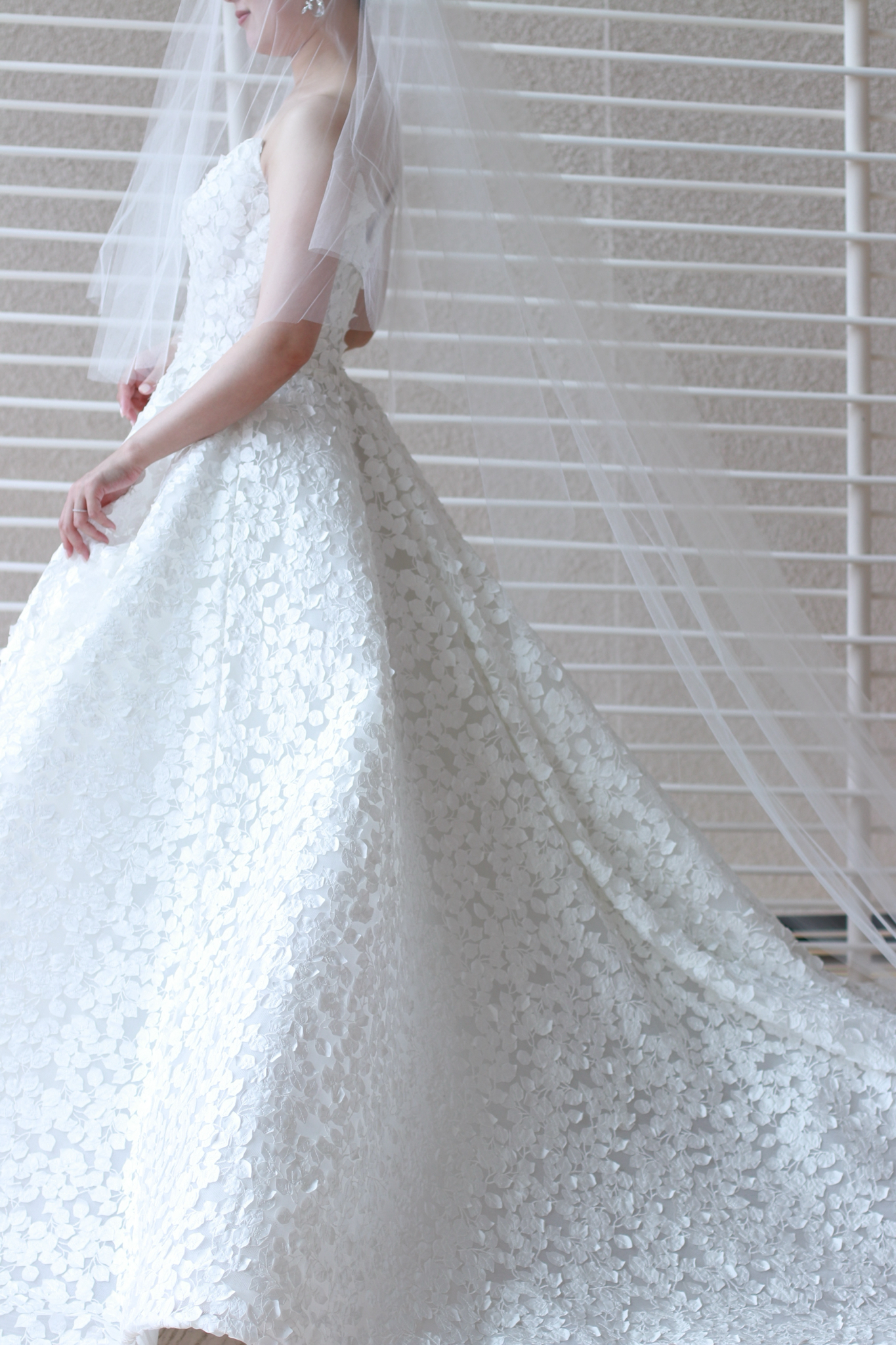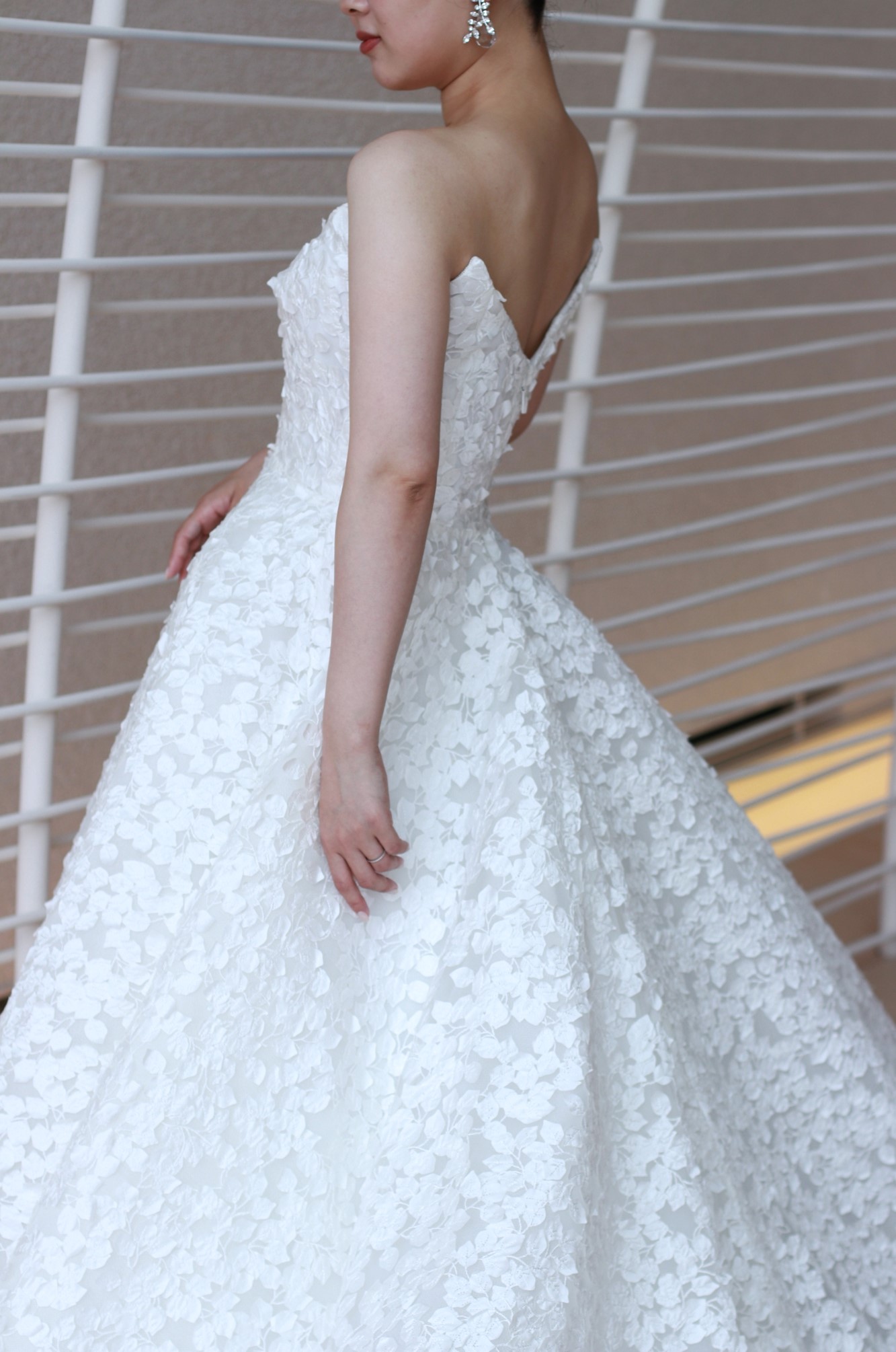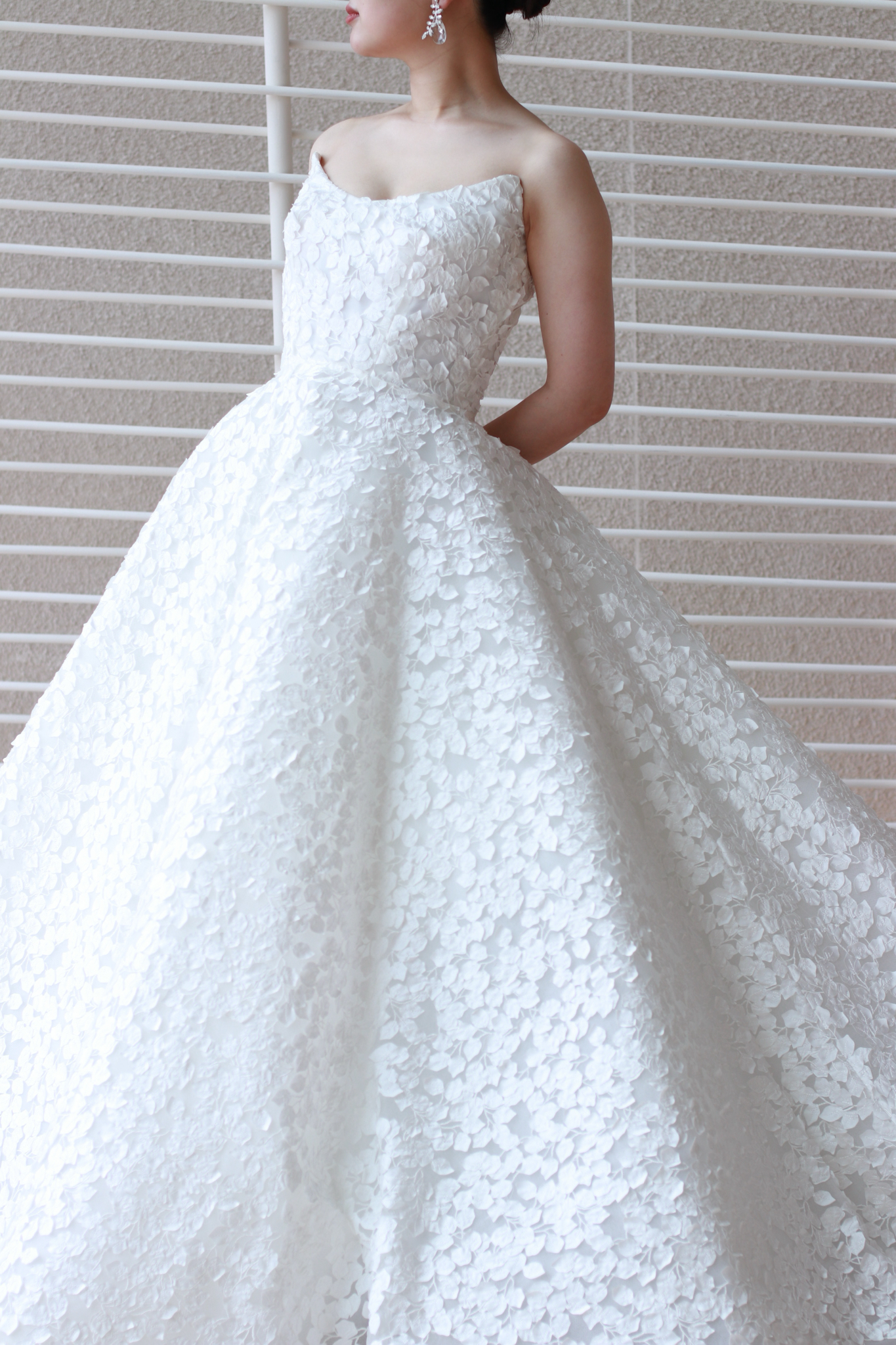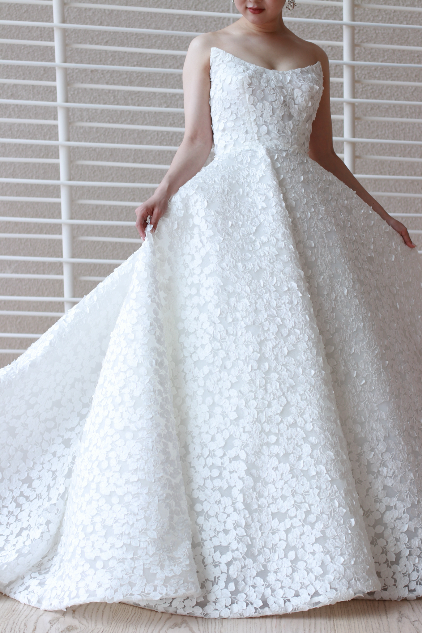 BABY BREATHと名付けられたこちらのウェディングドレス。小さな花々が集まりレースのように花開くカスミソウをウェディングドレスにそのままデザインしたリーム アクラのウェディングドレスは、強さと柔らかさ、そして華やかさと儚さという相反する美しさを叶えます。花嫁の動きと光の生み出す陰影によって、艶感のある印象や空気に溶け込むような儚い透明感など様々な表情を見せます。どの角度から見ても美しく計算されたプリンセスラインのシルエットは、これまで多くのウェディングドレスを手掛けてきたリーム アクラだからこその業。花嫁がウェディングドレスを纏った時に完成するハードチュールのスカートは、立体的なシルエットを演出し、その上に施されたレースを生きいきと引き立ててくれるのです。立体感のある花びらの上には、まるでそこに命が宿るかのように施された美しい刺繍が広がります。