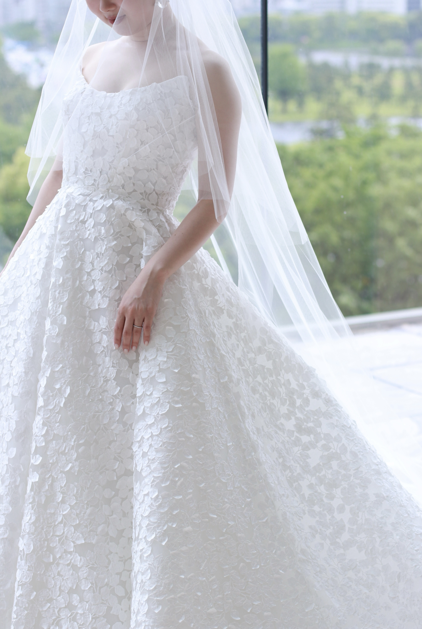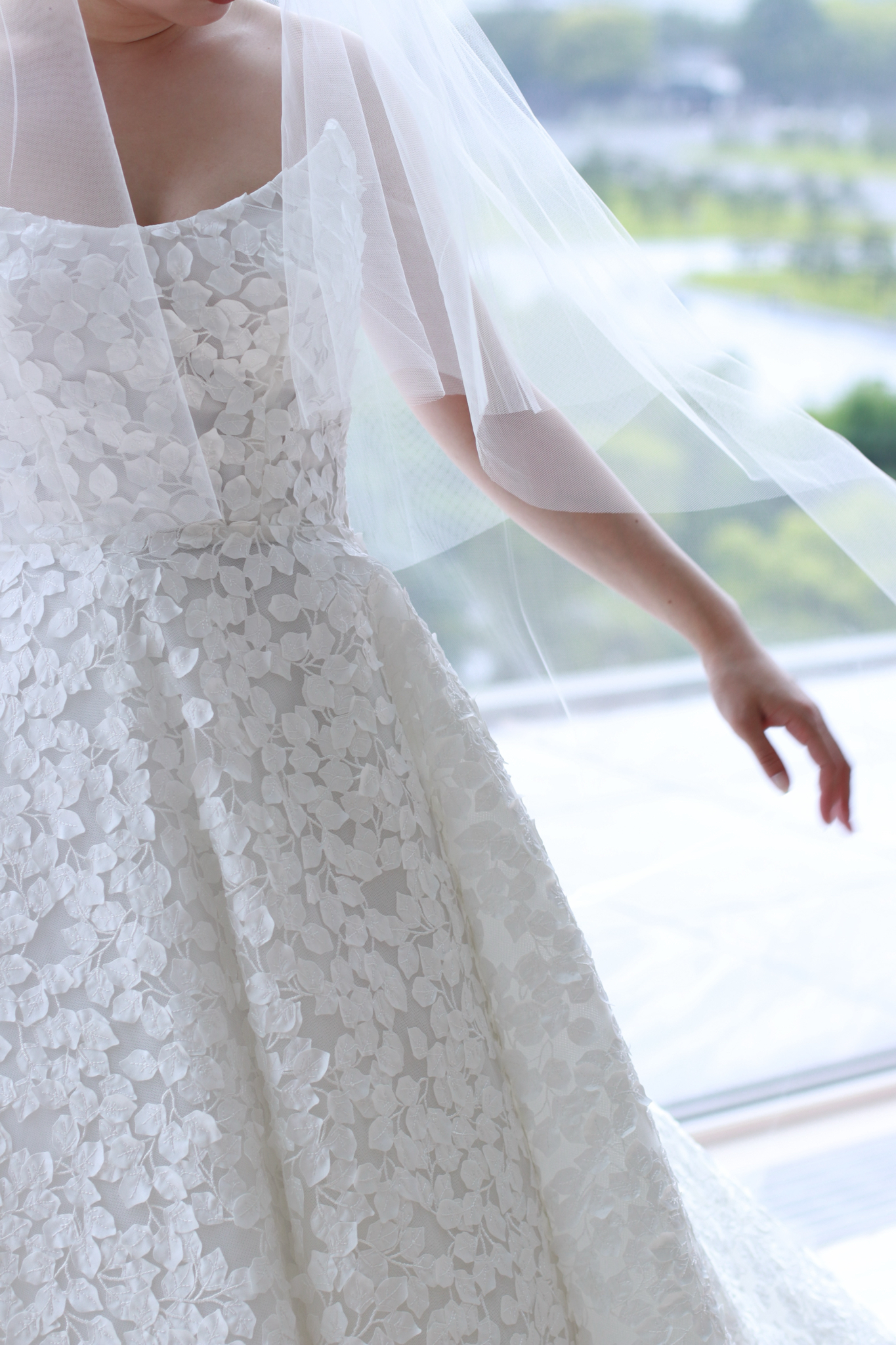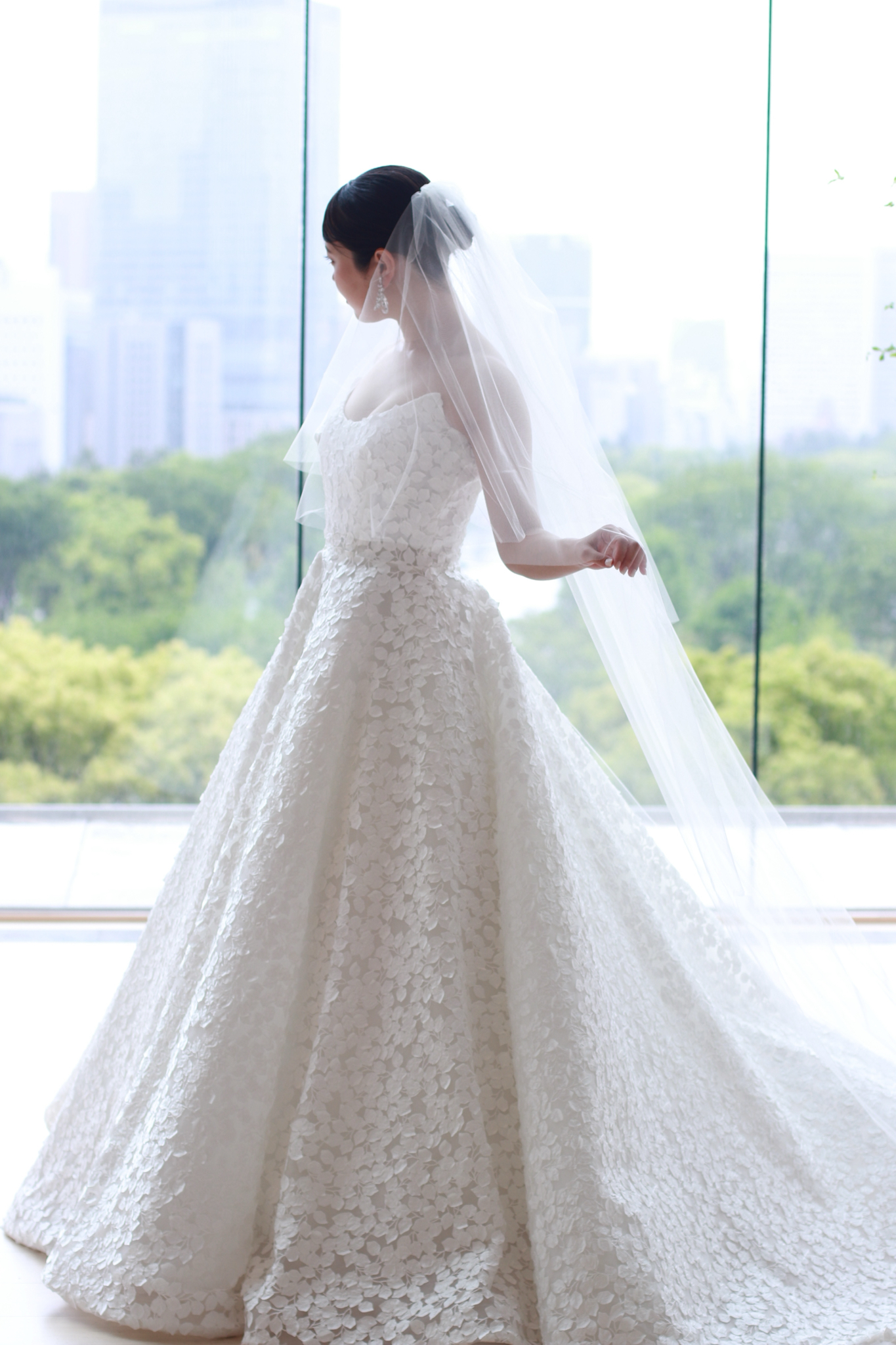訪れた誰もが心を奪われるパレスホテル東京のチャペル。そこは東京の中心に位置しながらも、都会の喧騒を離れ、自然の温かみに満ちた空間です。今回ご紹介するReem Acra(リーム アクラ)のウェディングドレスは、そんなパレスホテル東京のチャペルでこそ纏っていただきたい一着です。大きな窓から臨む皇居の豊かな緑と東京を感じさせる都会的な街並みを背景に、たっぷりと差し込む陽光に包まれ佇む花嫁の姿はあまりにも幻想的。美しいレースの合間から溢れる光は全身を柔らかく包み込み、神々しく輝くのです。