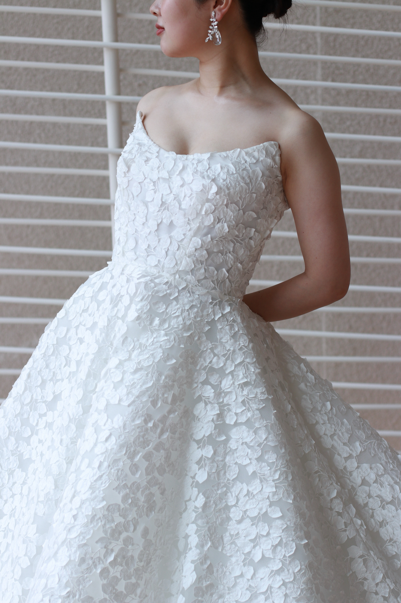 現代を生きる女性の凛とした美しさと、繊細で柔らかな女性らしさを追求したウェディングドレスと言えるのではないでしょうか。