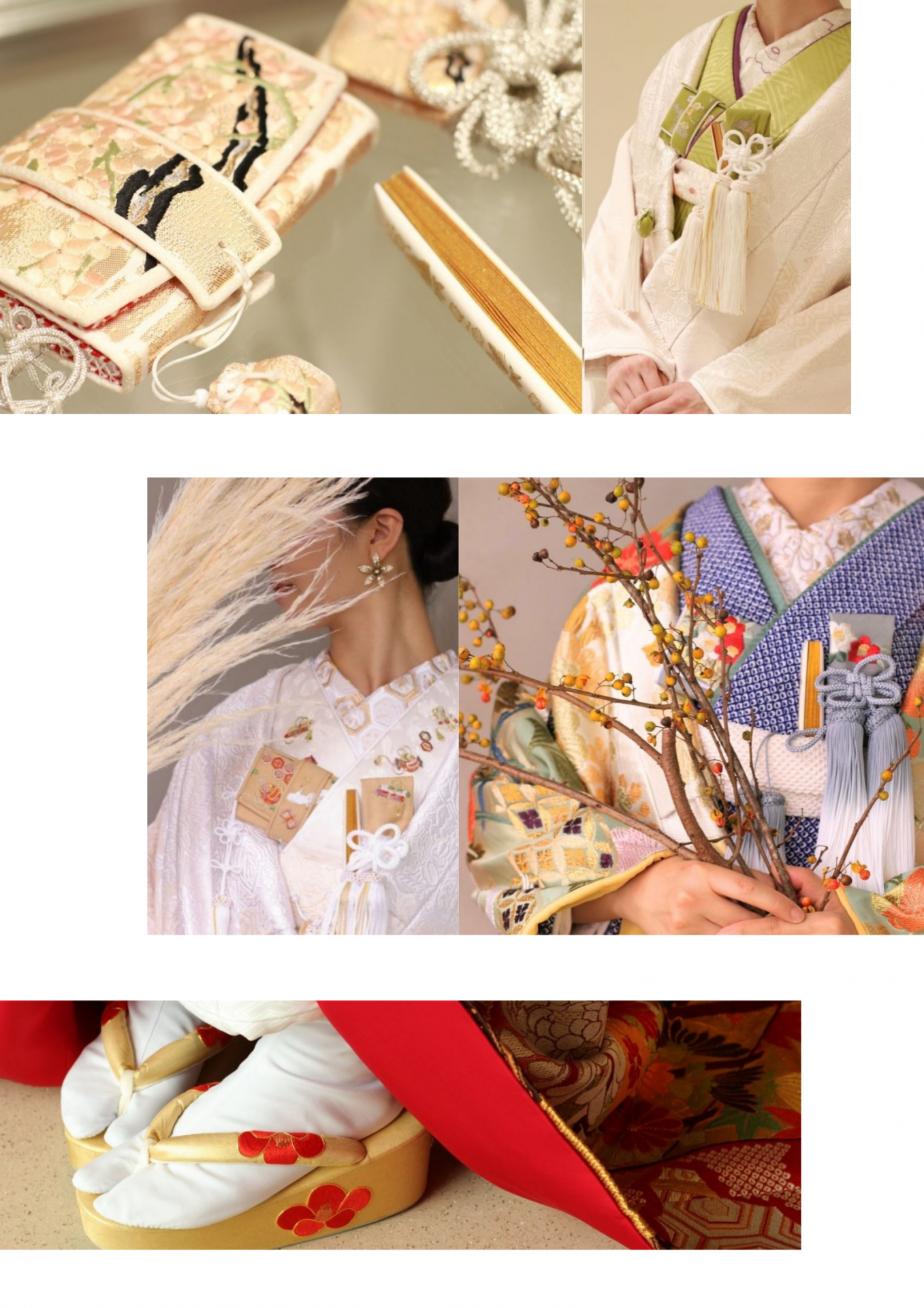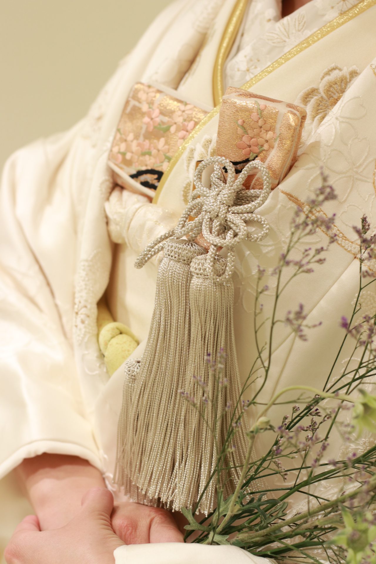 婚礼和装を纏うために大切なお小物があるのはご存じでしょうか。例えば、着物に馴染み深い半衿や帯揚・抱帯、“永遠に続く幸せ”を意味する帯締など…これらの衣裳や帯にまつわるお小物には、一つ一つ全てに大切な願いや思いが込められております。そのほかにも花嫁が必ず身に着けるものとして、代表的な3つのお小物がございます。