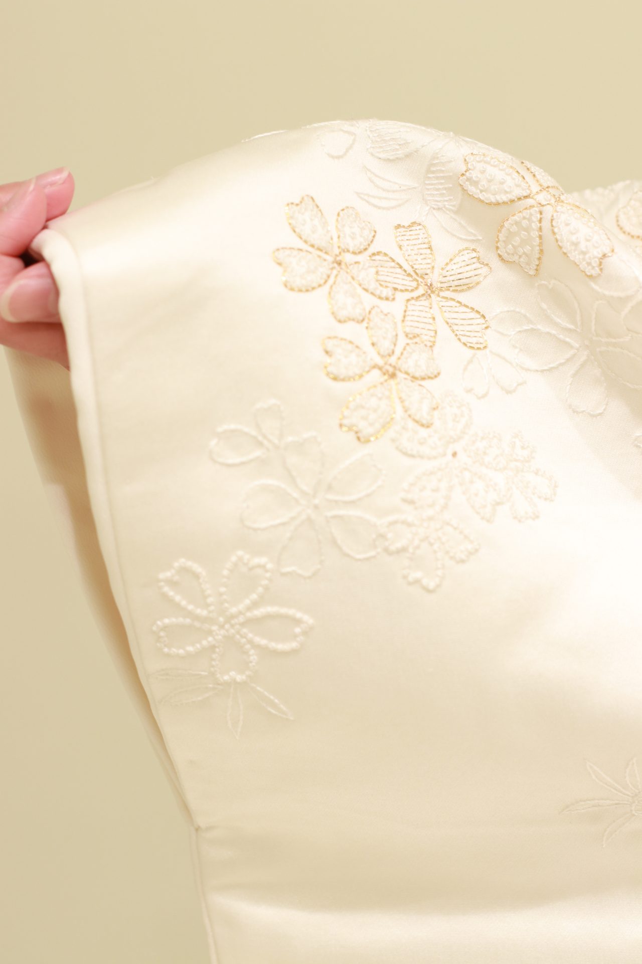 織り、染めと並ぶ和装の三大技法である“相良刺繍”を全体に施した贅沢な白無垢、松羅御所車文。生地の裏から糸を抜き、一針一針心を込めて結んでいく…その卓越した職人技が随所に光る白無垢は、立体的な厚みによって表現される色柄の上品な華やかさと、温かみが特徴的です。白糸と金糸によって描かれた桜や鶴の柄行が、特別な一日の装いを華やかに彩ります。