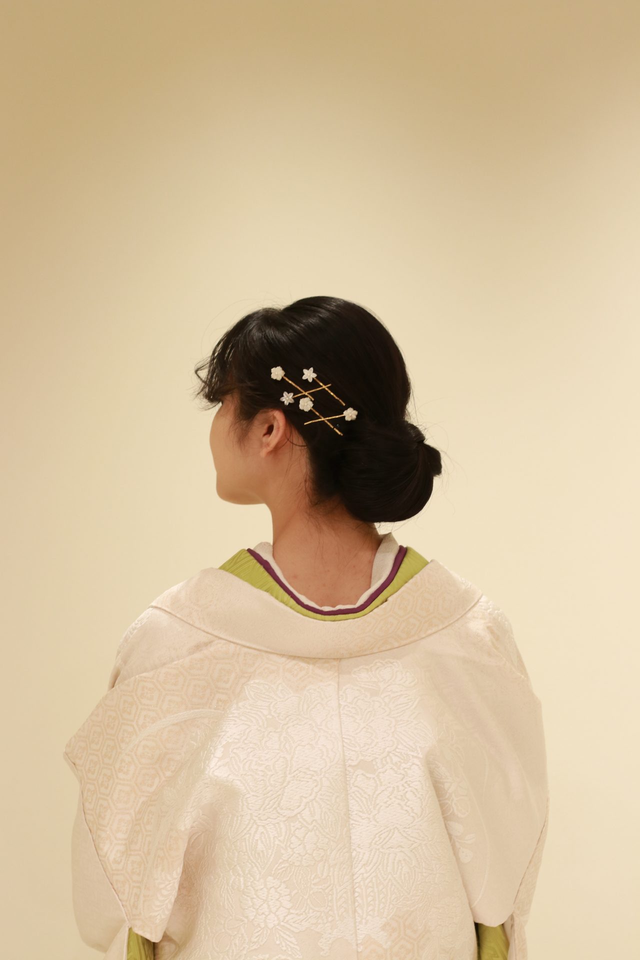 髪飾りには、シェルのように上品な輝きを放つピンをひし形に挿し、和モダンな雰囲気を醸して。生花とは異なる愛らしいヘアスタイル、可憐でたおやかでありながら、内に秘める思いの強さを表すコーディネート…それはきっと、心からの幸せを胸に新たな人生をスタートさせる一日に相応しい装いとなることでしょう。