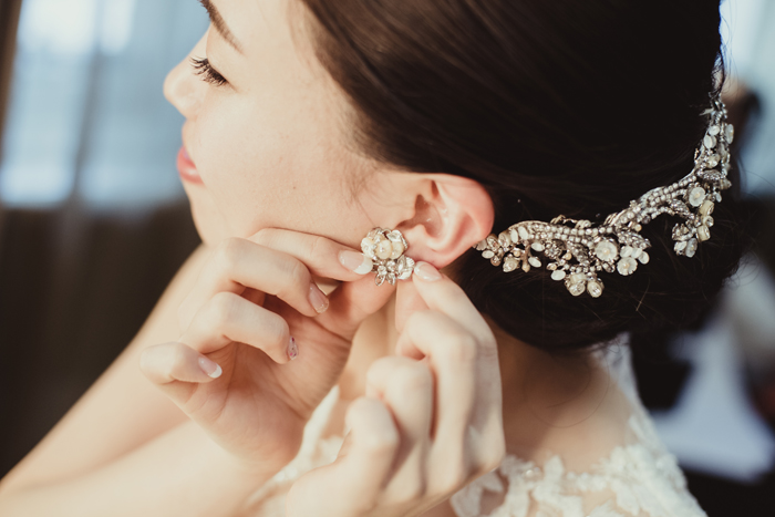 アクセサリーはMARIA ELENA(マリア エレナ)のティアラを、ボンネ風にお付けいただき、 それに合わせてイヤリングもコーディネート。