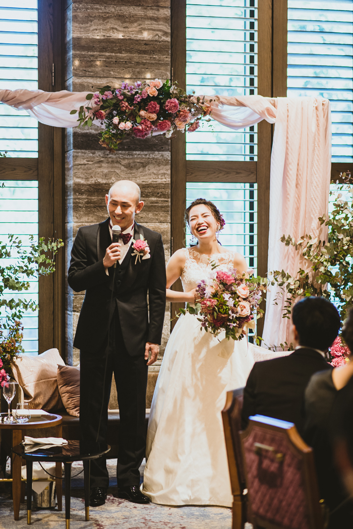 披露宴ではお二人の希望から、 普段お世話になっていらっしゃるゲストの方とより近い距離でお過ごしできるよう