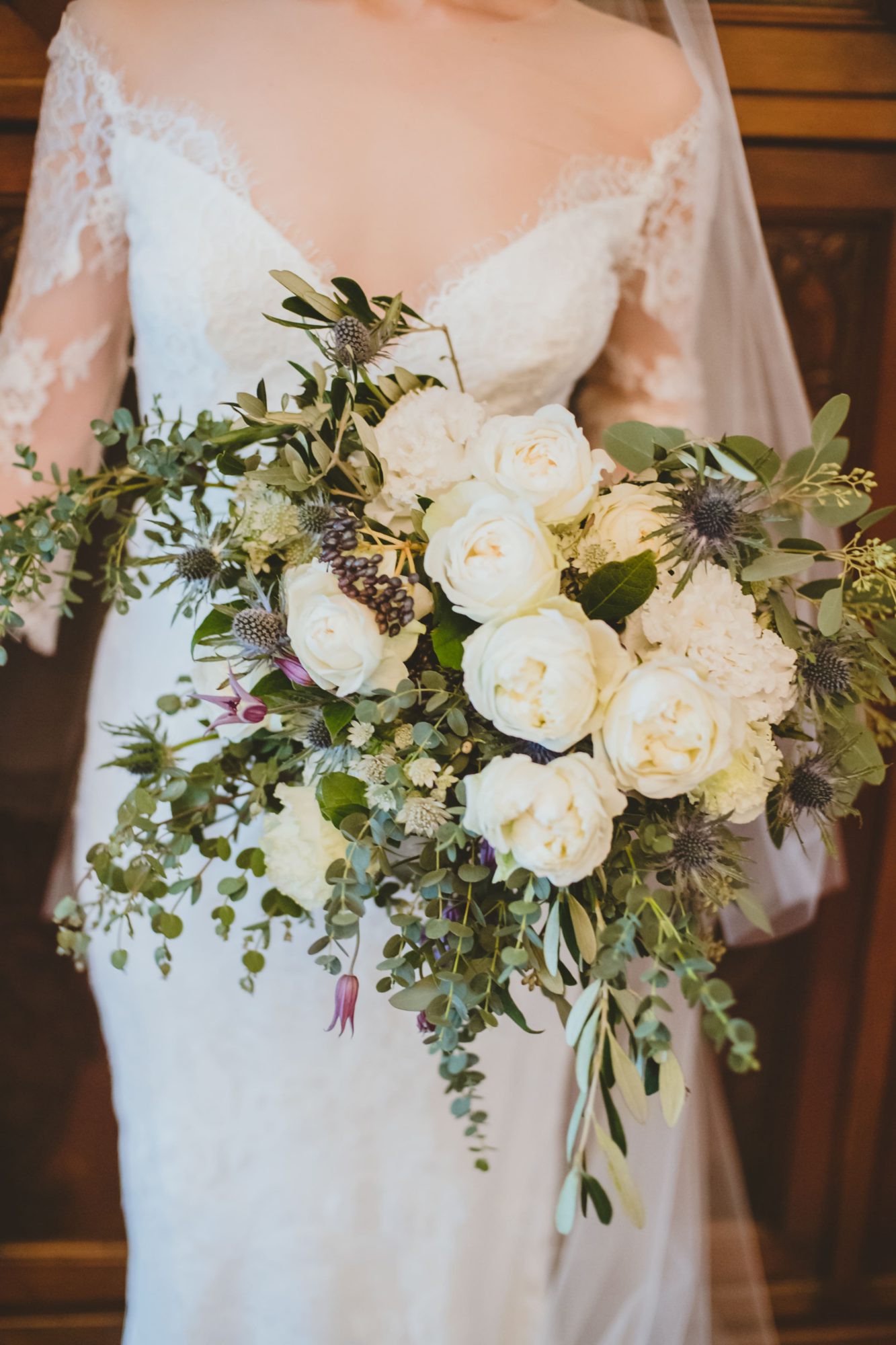 シックな会場のイメージと真っ赤なドレスに合うように、ボルドーにネイビーを合わせたブーケは